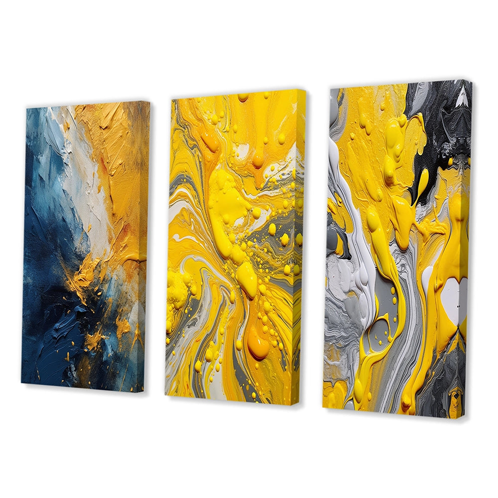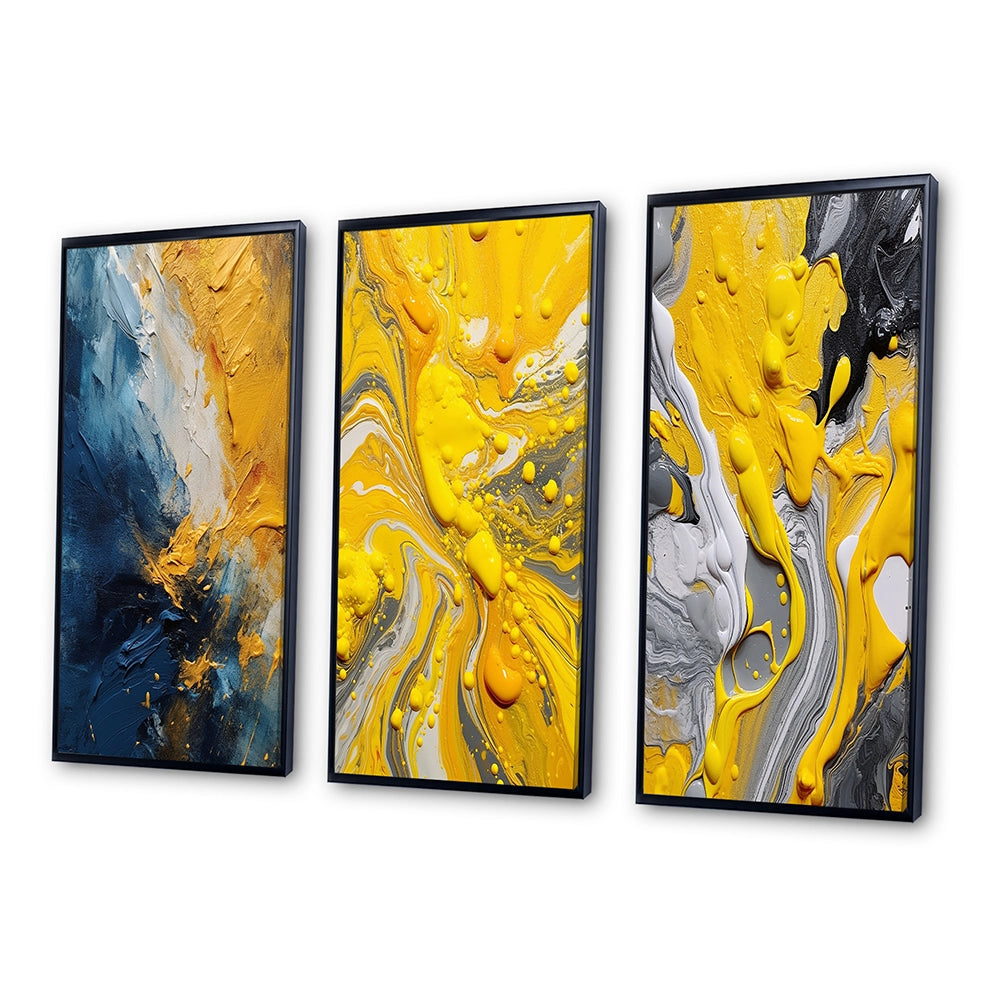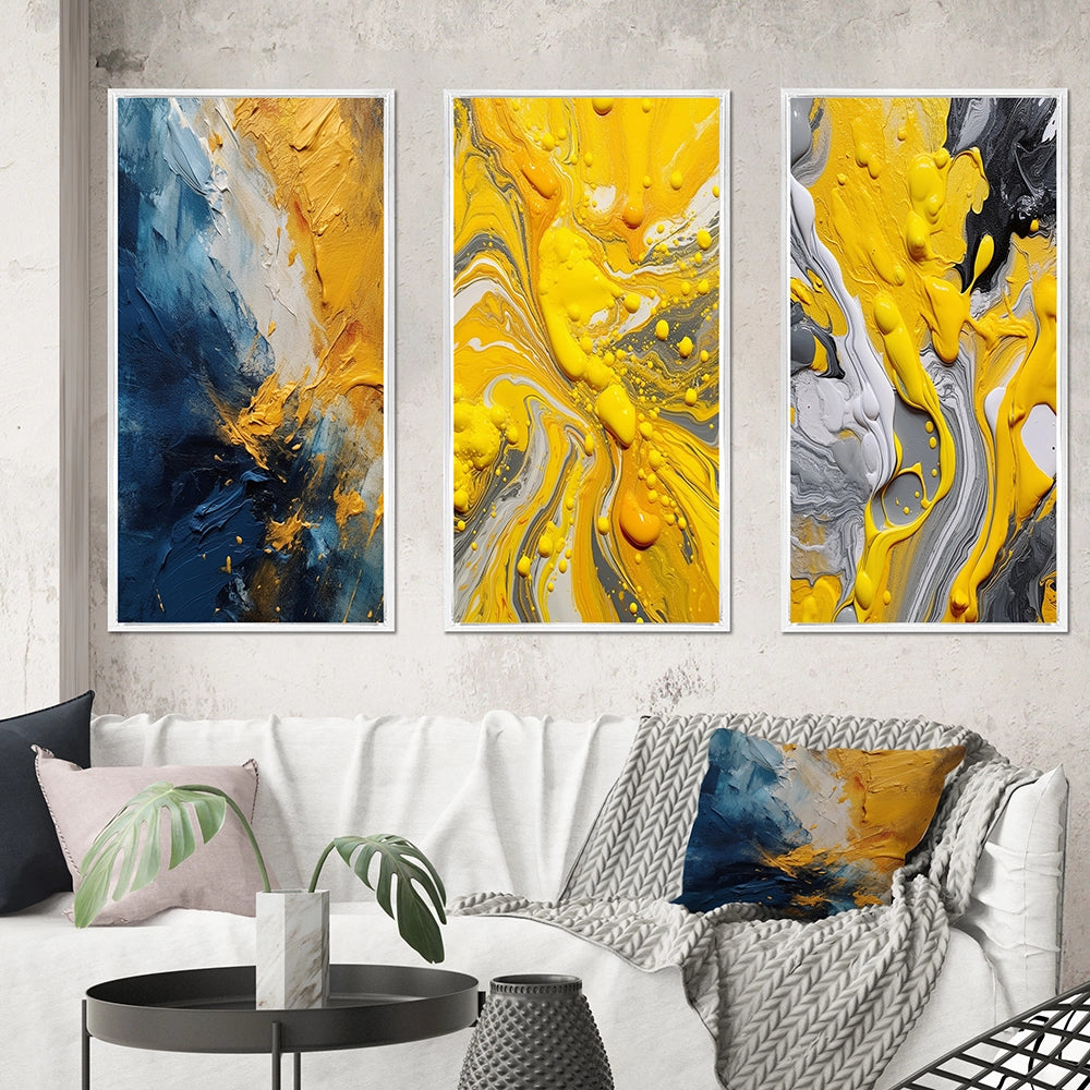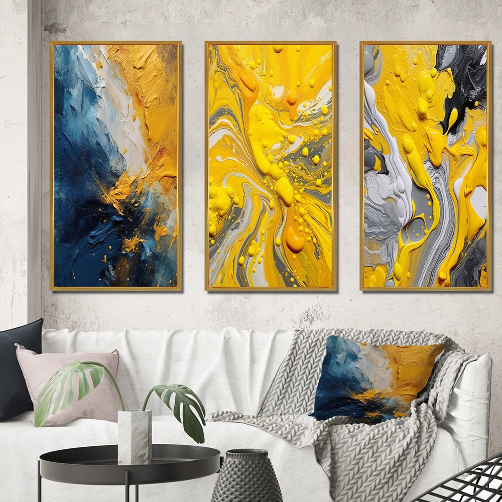 This beautiful Blue and Yellow Intuitive Expressions Collage Set of 3 Wall art is printed on premium quality cotton canvas using the finest fade-resistant ink. With options like Wrapped Canvas and Floater Framed Wall Decor, we offer a versatile range to cater to your unique aesthetic preferences. The Wrapped Canvas Art is stretched tautly over a sturdy wooden frame, giving your artwork a sleek, borderless appearance. For those who desire a touch of elegance and depth, our floater-framed canvas art is the ideal choice. The Canvas set is delicately mounted within a floating frame, creating a striking visual contrast between the artwork and the frame. Our collection offers an array of frame colors to complement your interior design, Ensuring that your wall art set seamlessly integrates with your home or office decor.