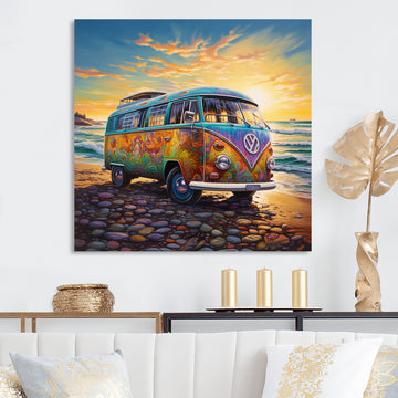 Magic Hippie Bus On The Beach - Car Van Canvas Wall Art