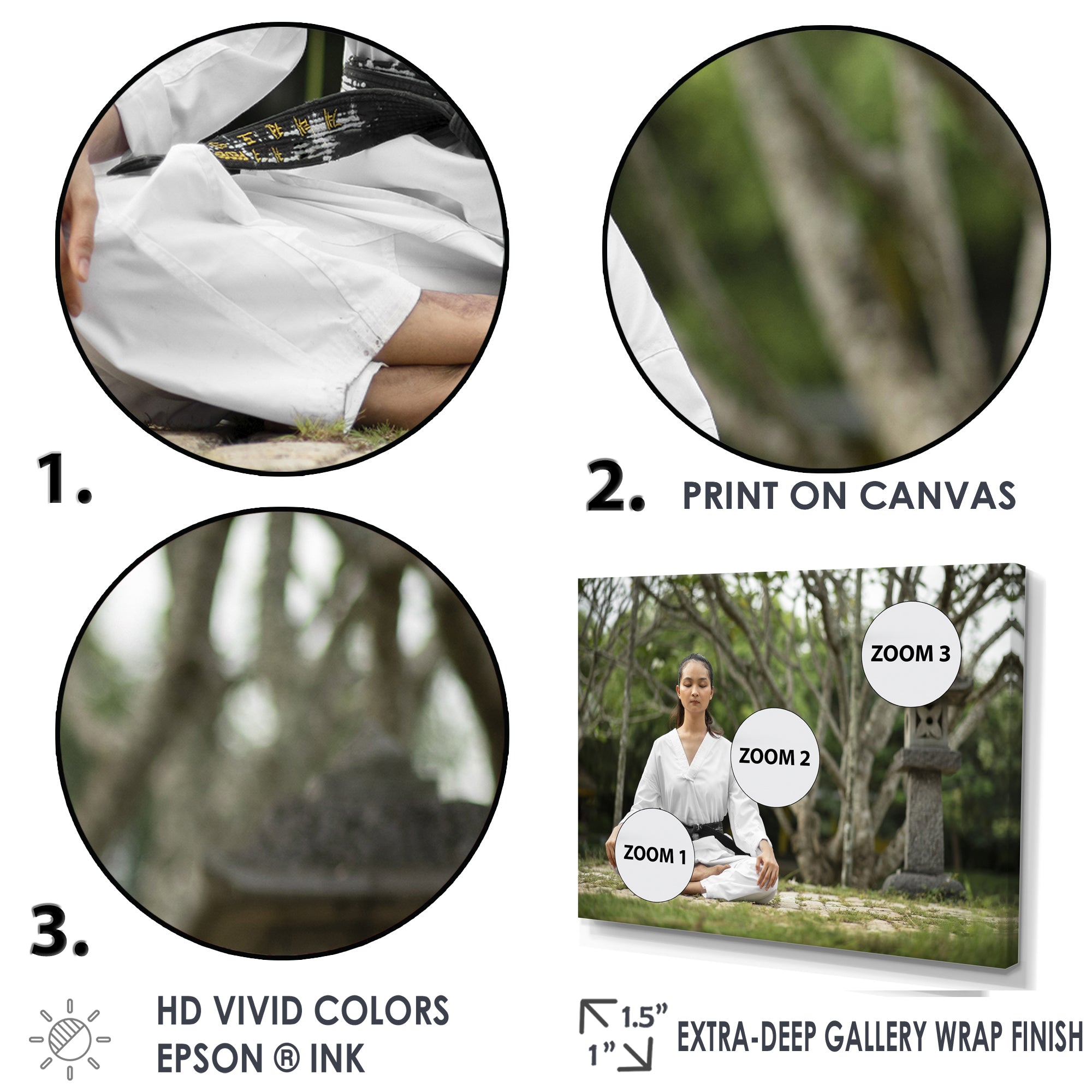 This beautiful Woman Karate Meditating Mindfulness Canvas Art is printed using the highest quality fade-resistant ink on canvas. Every one of our fine art giclee canvas prints is printed on premium quality cotton canvas, using the finest quality inks which will not fade over time. Each giclee print is stretched tightly over a 1-inch wood sub frame for small size prints or a 1.5-inch wood subframe for large size prints ensuring the canvas is taught and does not buckle. This canvas art print is gallery-wrapped (the design continues on the sides), giving it a real art gallery feel. All of our canvas prints are carefully packaged with plastic protection, fragile labeling, and sturdy boxes to ensure safe delivery. Every canvas print arrives ready to hang on the wall, with the hanging kits included.