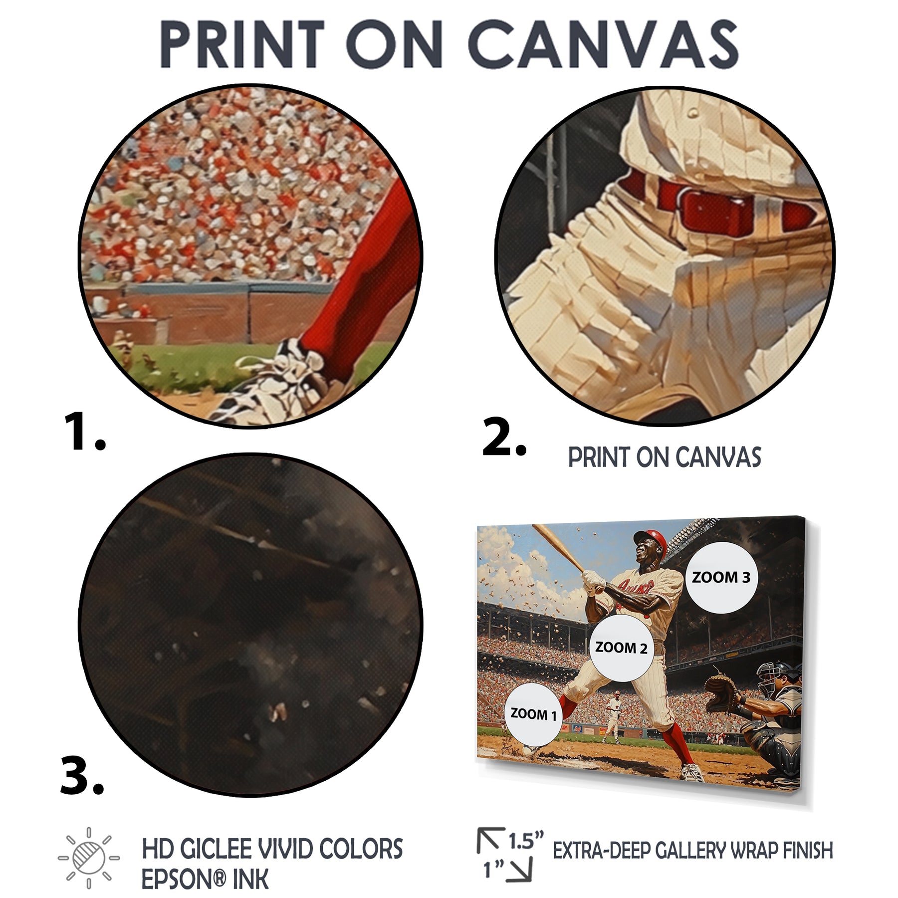 This beautiful Baseball Player Hitting A Home Run Canvas Art is printed using the highest quality fade-resistant ink on canvas. Every one of our fine art giclee canvas prints is printed on premium quality cotton canvas, using the finest quality inks which will not fade over time. Each giclee print is stretched tightly over a 1-inch wood sub frame for small size prints or a 1.5-inch wood subframe for large size prints ensuring the canvas is taught and does not buckle. This canvas art print is gallery-wrapped (the design continues on the sides), giving it a real art gallery feel. All of our canvas prints are carefully packaged with plastic protection, fragile labeling, and sturdy boxes to ensure safe delivery. Every canvas print arrives ready to hang on the wall, with the hanging kits included.