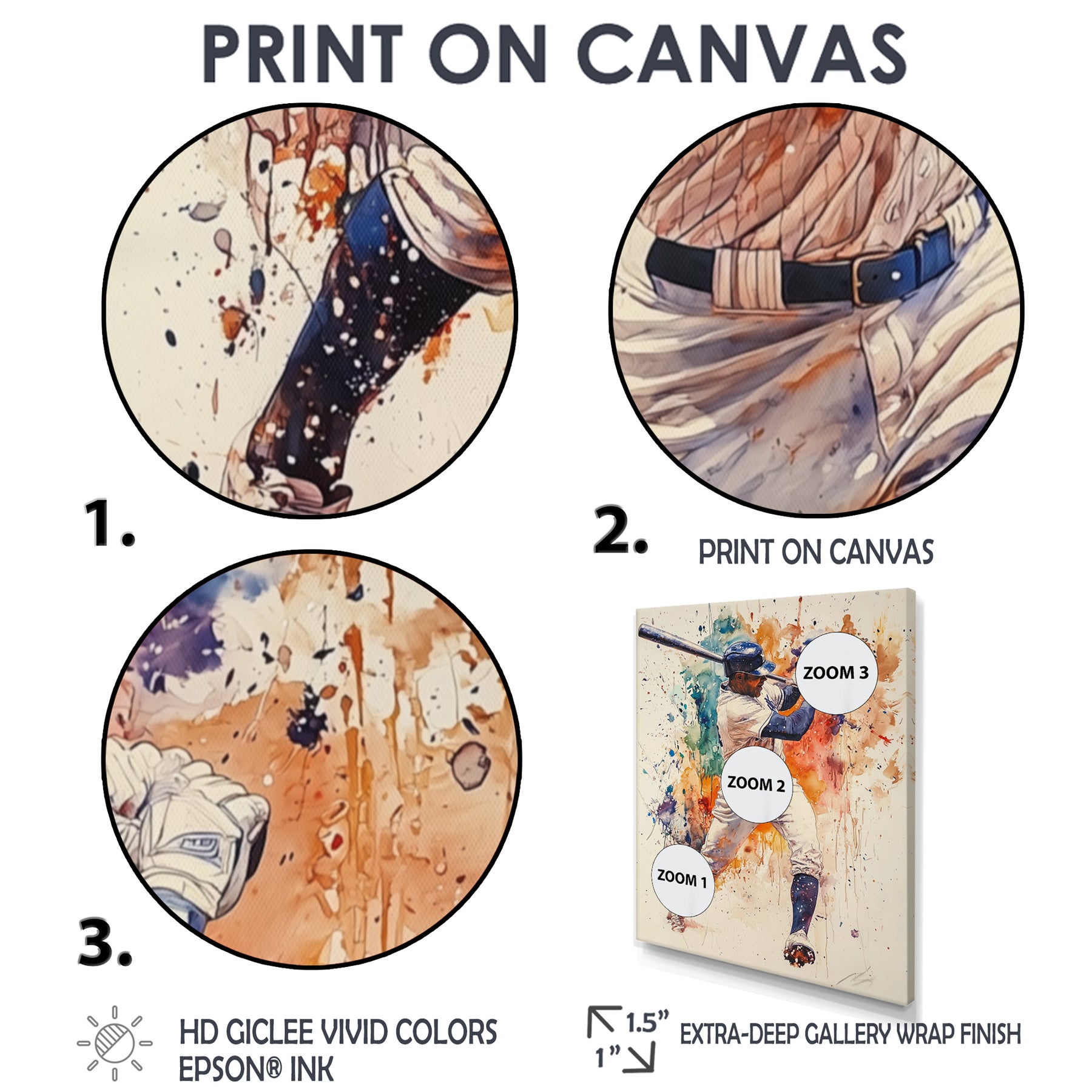 This beautiful White Blue Baseball Player Hitting A Home Run Canvas Art is printed using the highest quality fade-resistant ink on canvas. Every one of our fine art giclee canvas prints is printed on premium quality cotton canvas, using the finest quality inks which will not fade over time. Each giclee print is stretched tightly over a 1-inch wood sub frame for small size prints or a 1.5-inch wood subframe for large size prints ensuring the canvas is taught and does not buckle. This canvas art print is gallery-wrapped (the design continues on the sides), giving it a real art gallery feel. All of our canvas prints are carefully packaged with plastic protection, fragile labeling, and sturdy boxes to ensure safe delivery. Every canvas print arrives ready to hang on the wall, with the hanging kits included.