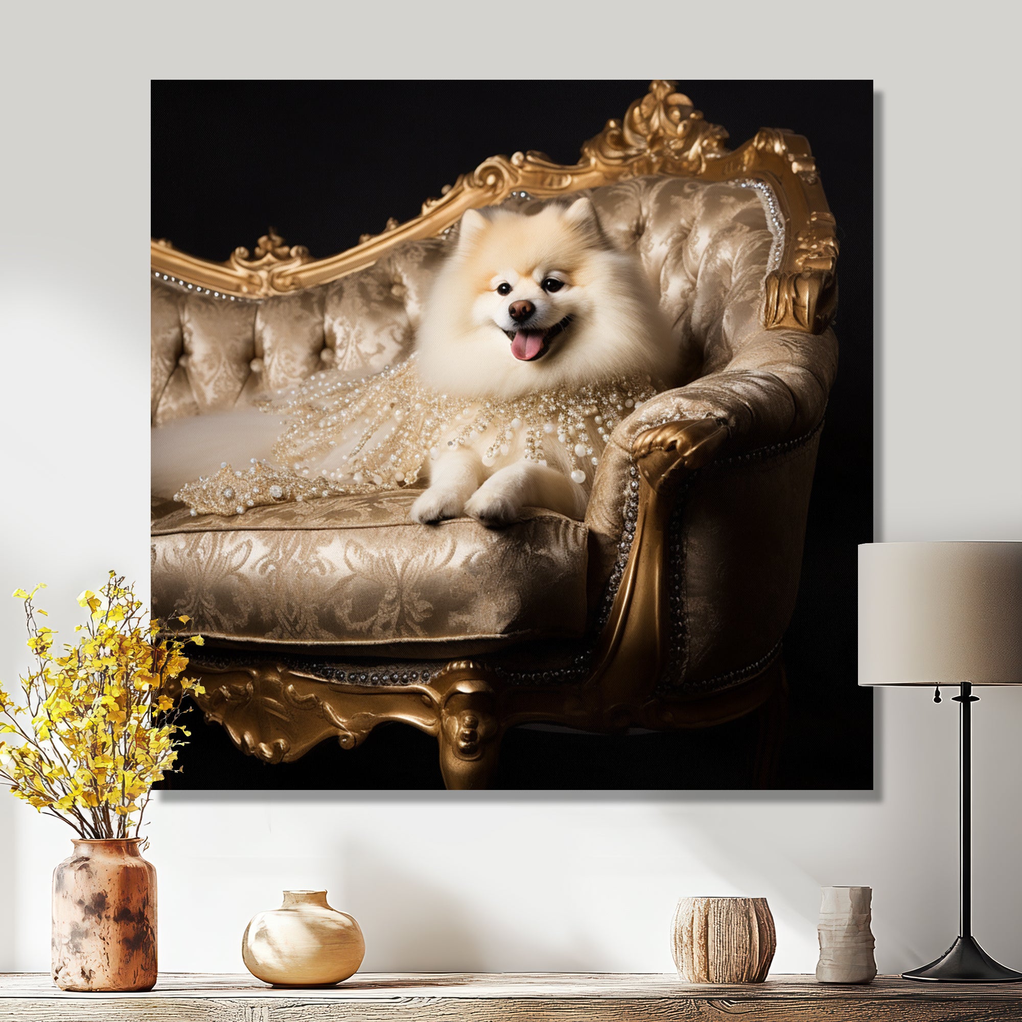 Adorable Pomeranian On Glam Couch - Dog Home Decor Art