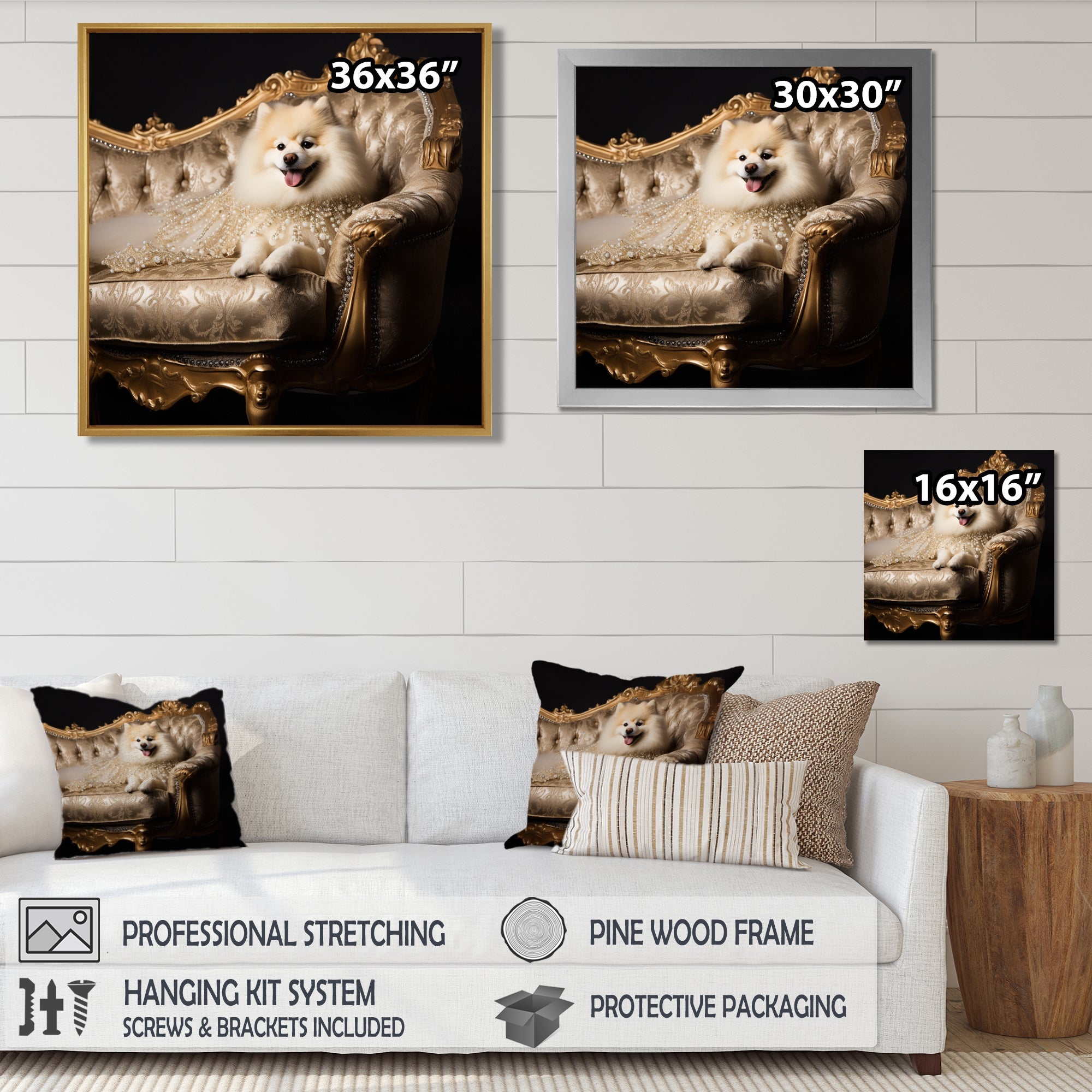 This beautiful Adorable Pomeranian On Glam Couch Canvas Art is printed using the highest quality fade-resistant ink on canvas. Every one of our fine art giclee canvas prints is printed on premium quality cotton canvas, using the finest quality inks which will not fade over time. Each giclee print is stretched tightly over a 1-inch wood sub frame for small size prints or a 1.5-inch wood subframe for large size prints ensuring the canvas is taught and does not buckle. This canvas art print is gallery-wrapped (the design continues on the sides), giving it a real art gallery feel. All of our canvas prints are carefully packaged with plastic protection, fragile labeling, and sturdy boxes to ensure safe delivery. Every canvas print arrives ready to hang on the wall, with the hanging kits included.