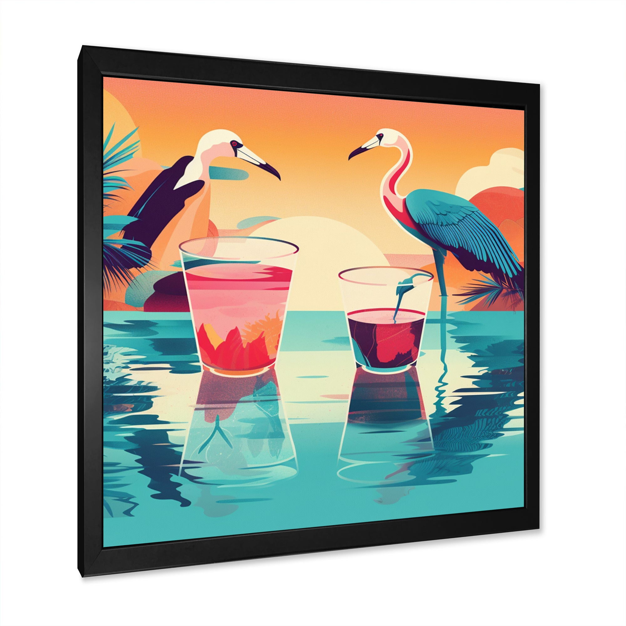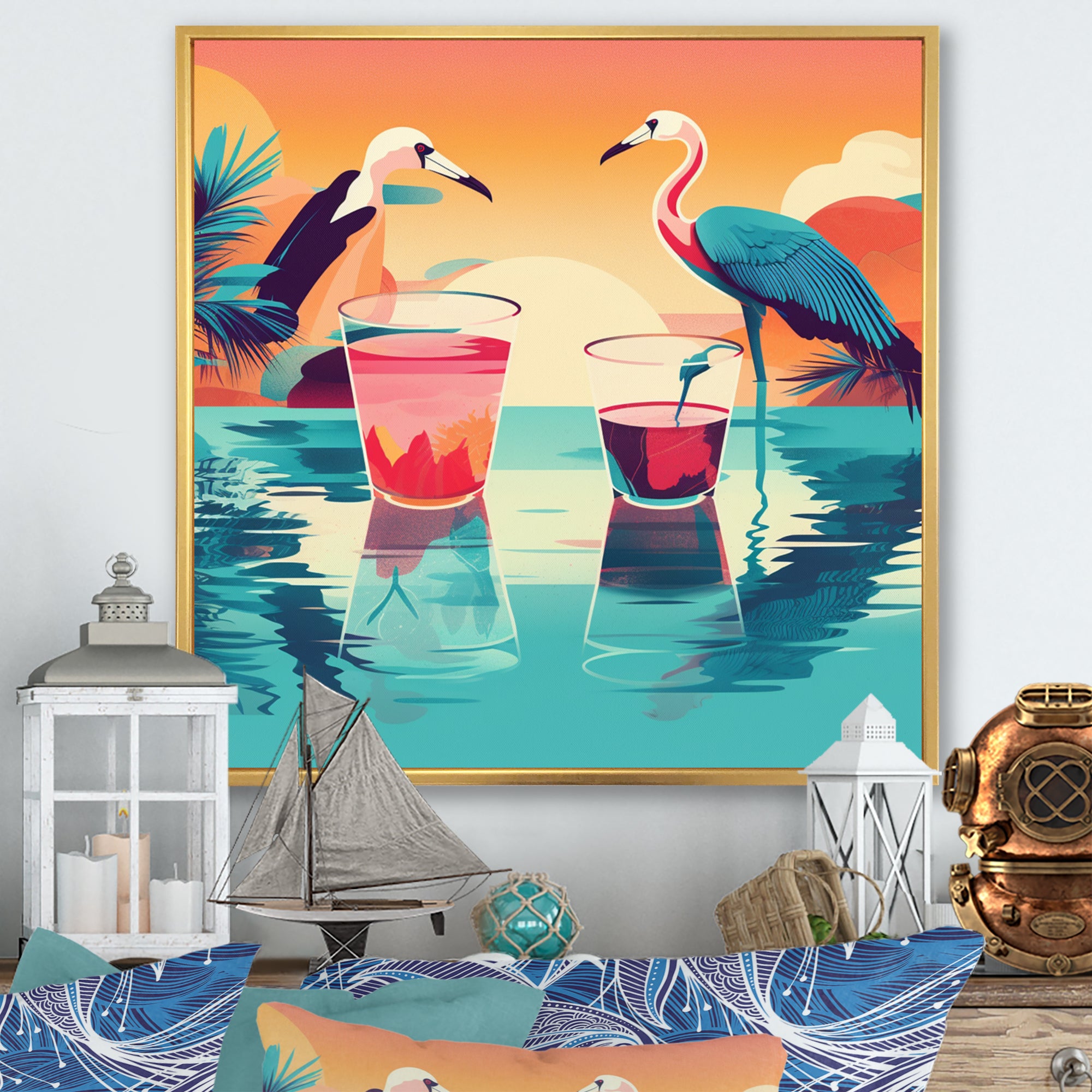Blue Pink Flamingos In The Sea At Sunset - Flamingo Living Room Wall Art