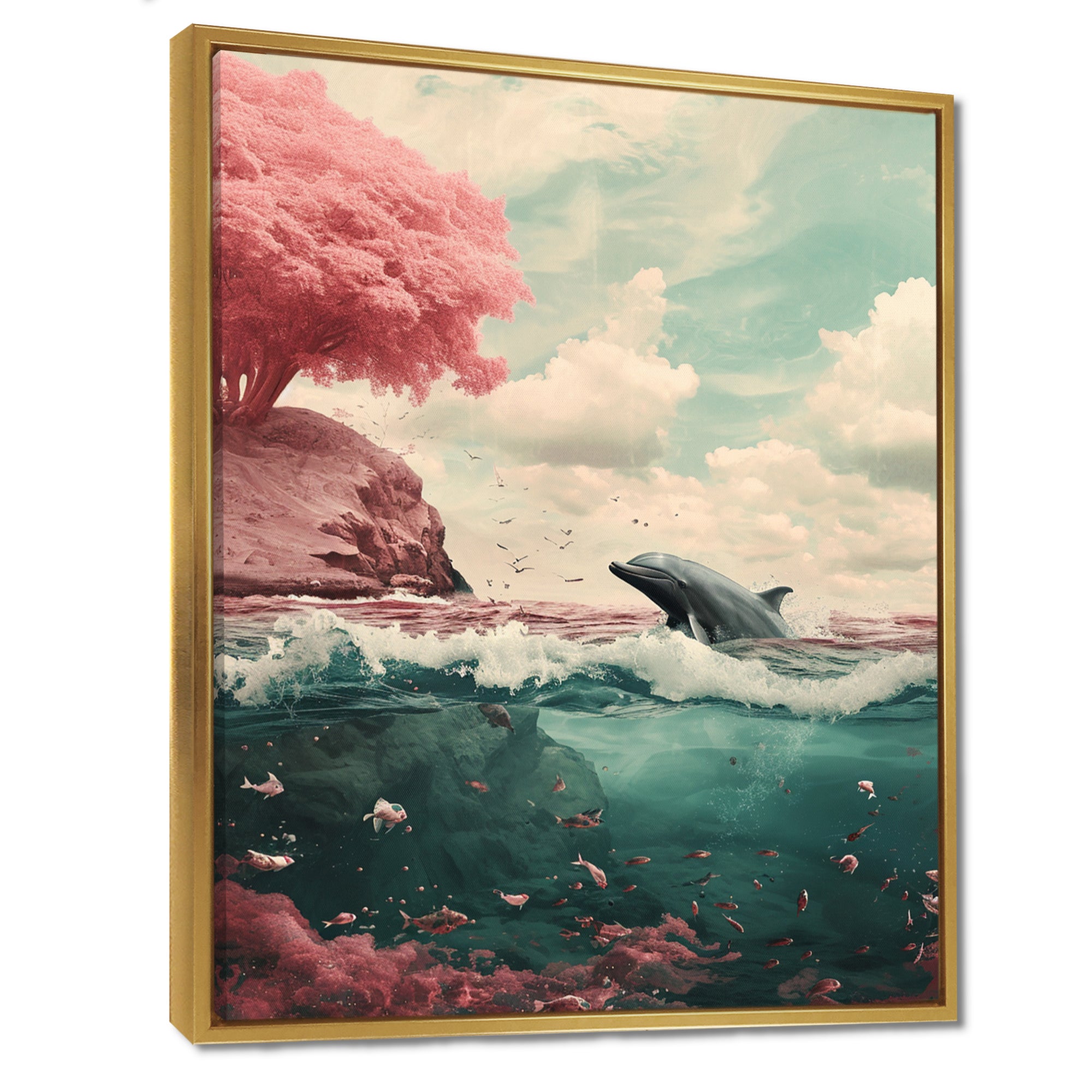 Dolphin In The Ocean By The Cherry Blossom Tree - Dolphin Framed Canvas Art