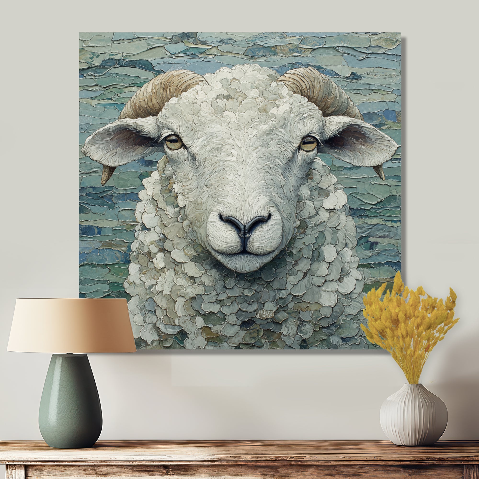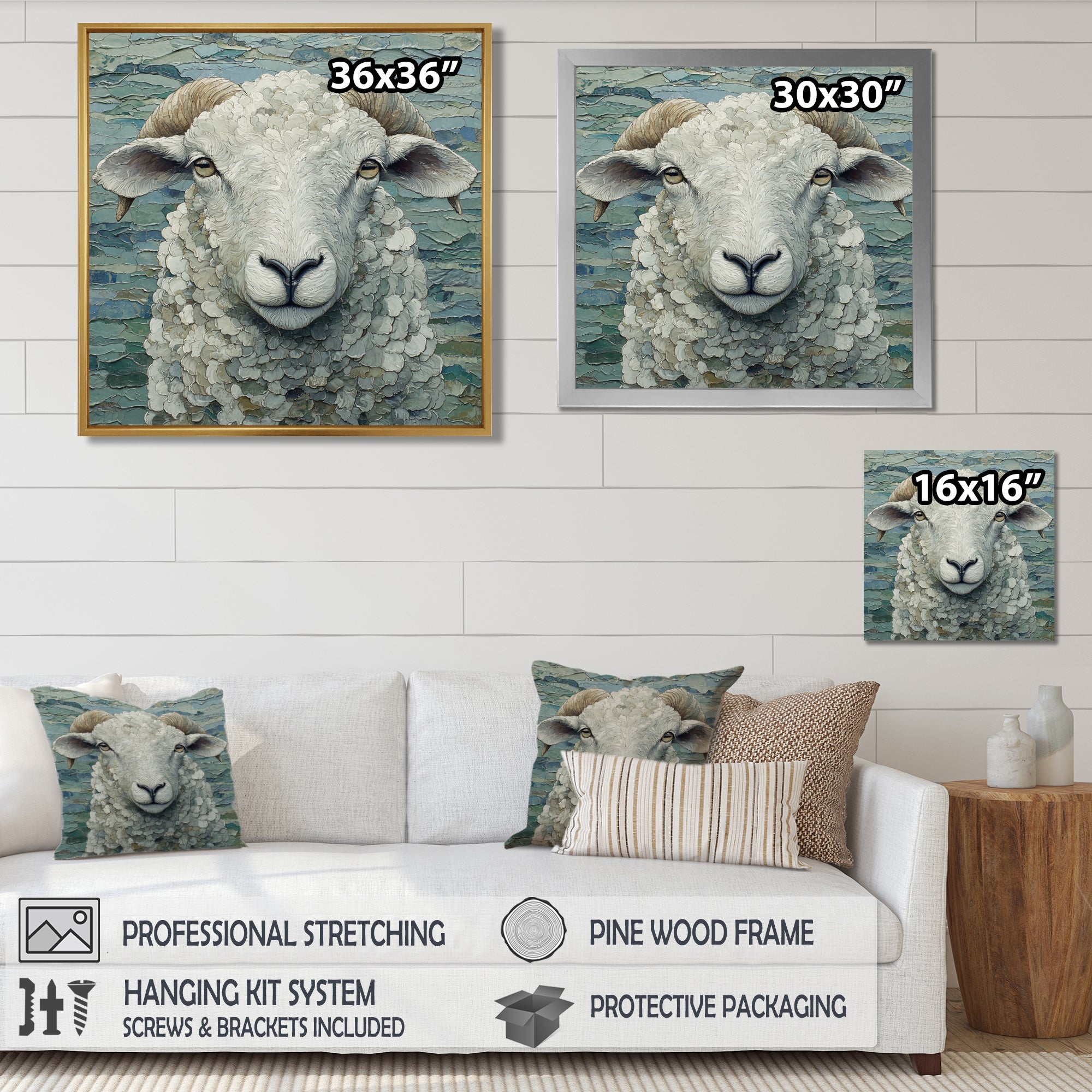 This beautiful Ewes Gaze Of Sheep Portrait Canvas Art is printed using the highest quality fade-resistant ink on canvas. Every one of our fine art giclee canvas prints is printed on premium quality cotton canvas, using the finest quality inks which will not fade over time. Each giclee print is stretched tightly over a 1-inch wood sub frame for small size prints or a 1.5-inch wood subframe for large size prints ensuring the canvas is taught and does not buckle. This canvas art print is gallery-wrapped (the design continues on the sides), giving it a real art gallery feel. All of our canvas prints are carefully packaged with plastic protection, fragile labeling, and sturdy boxes to ensure safe delivery. Every canvas print arrives ready to hang on the wall, with the hanging kits included.