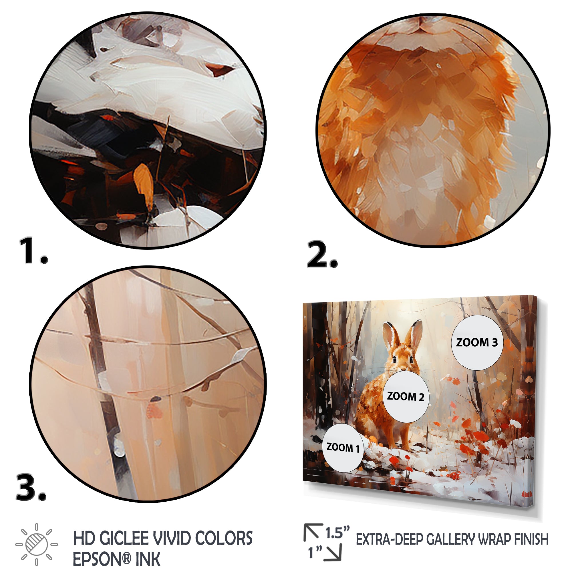 This beautiful Frosty Rabbit winter Solitude Canvas Art is printed using the highest quality fade-resistant ink on canvas. Every one of our fine art giclee canvas prints is printed on premium quality cotton canvas, using the finest quality inks which will not fade over time. Each giclee print is stretched tightly over a 1-inch wood sub frame for small size prints or a 1.5-inch wood subframe for large size prints ensuring the canvas is taught and does not buckle. This canvas art print is gallery-wrapped (the design continues on the sides), giving it a real art gallery feel. All of our canvas prints are carefully packaged with plastic protection, fragile labeling, and sturdy boxes to ensure safe delivery. Every canvas print arrives ready to hang on the wall, with the hanging kits included.