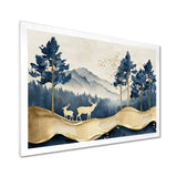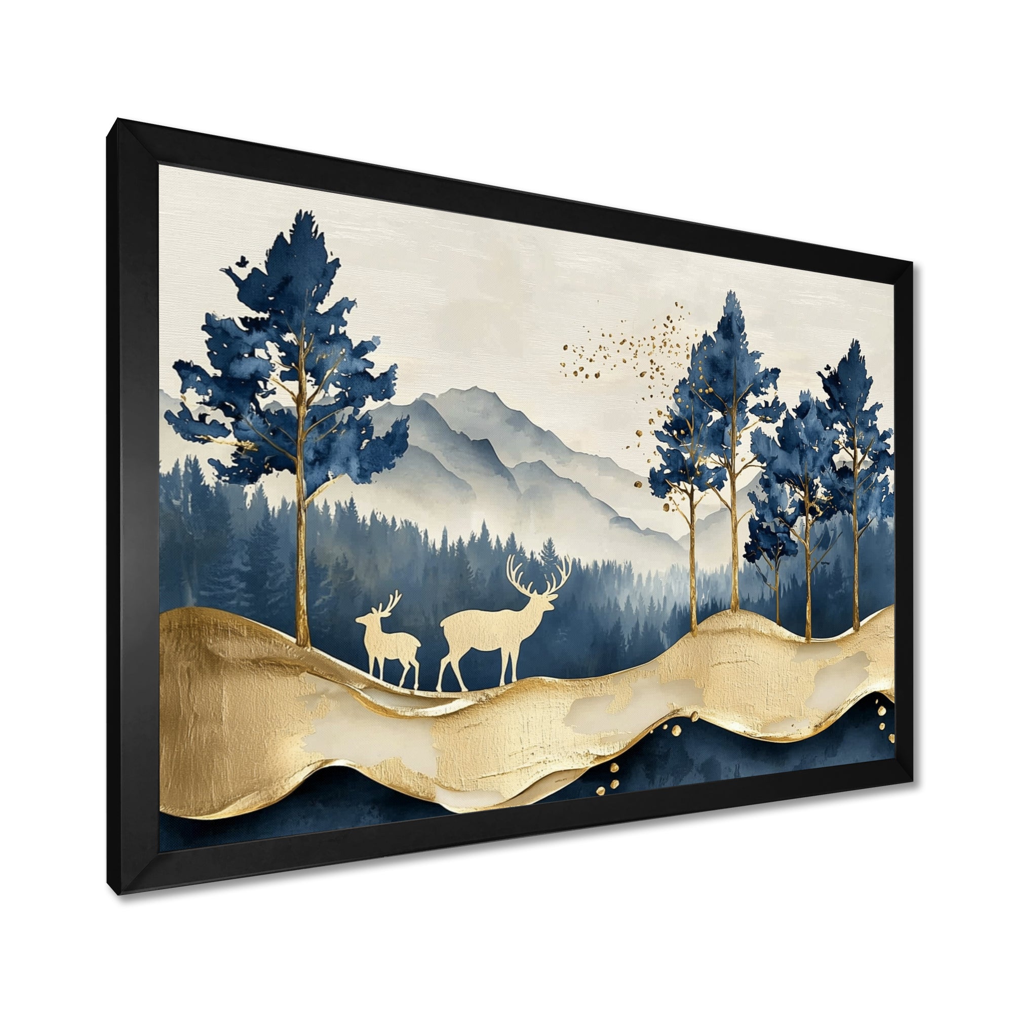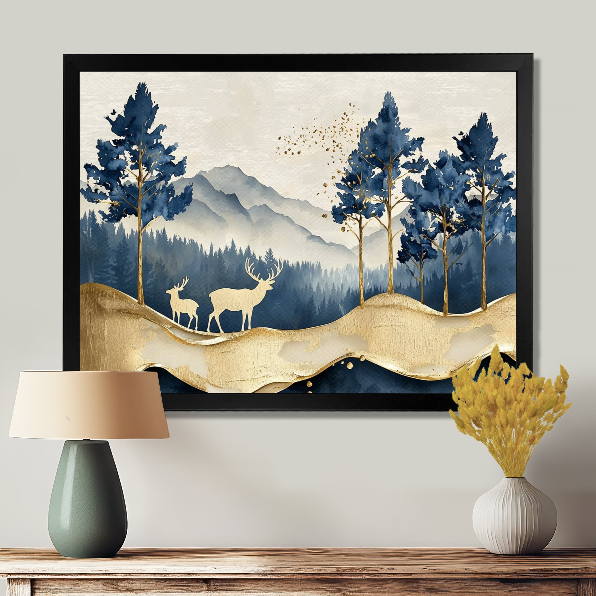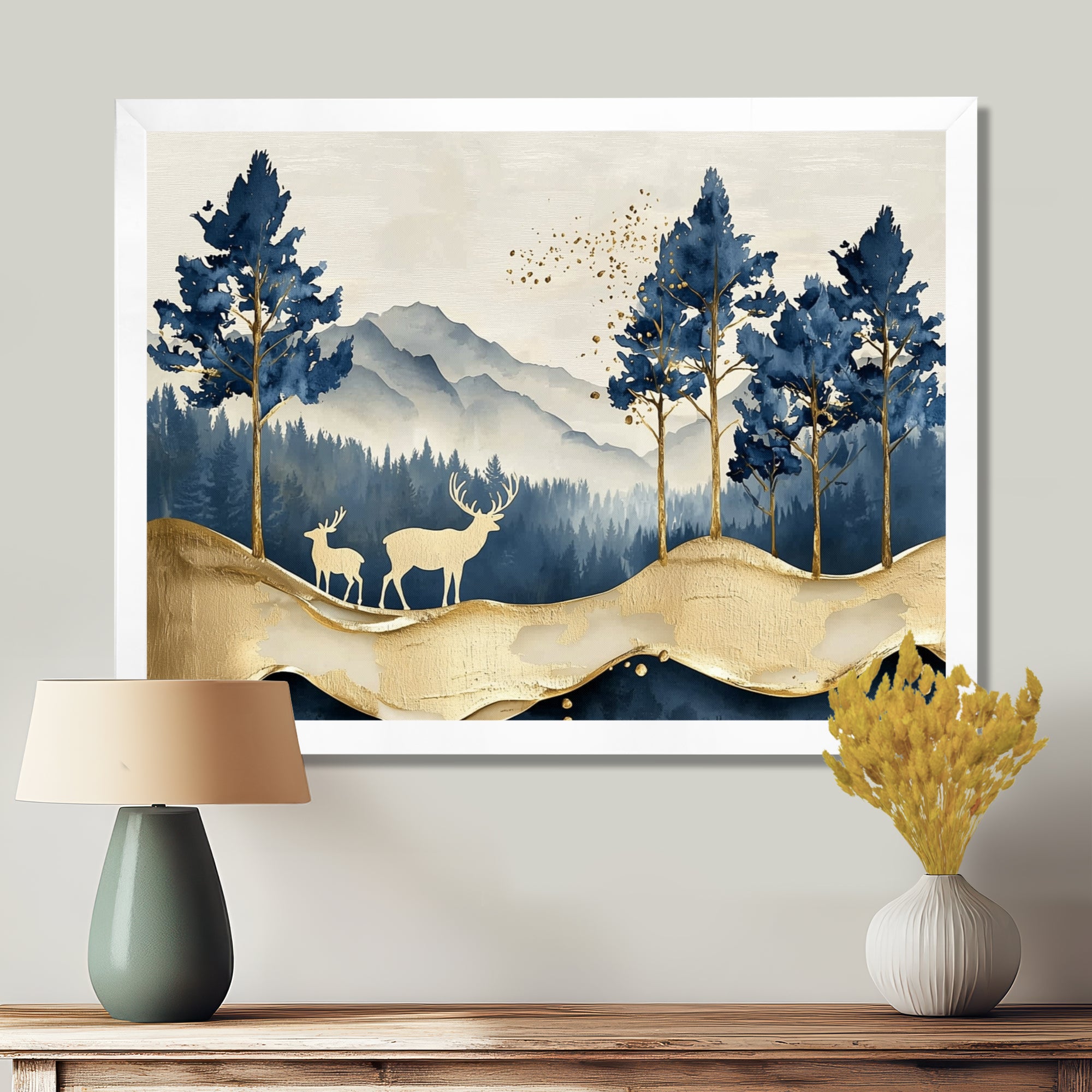 Golden Deer In Pine Tree Misty Mountain - Gold Deer Wall Art