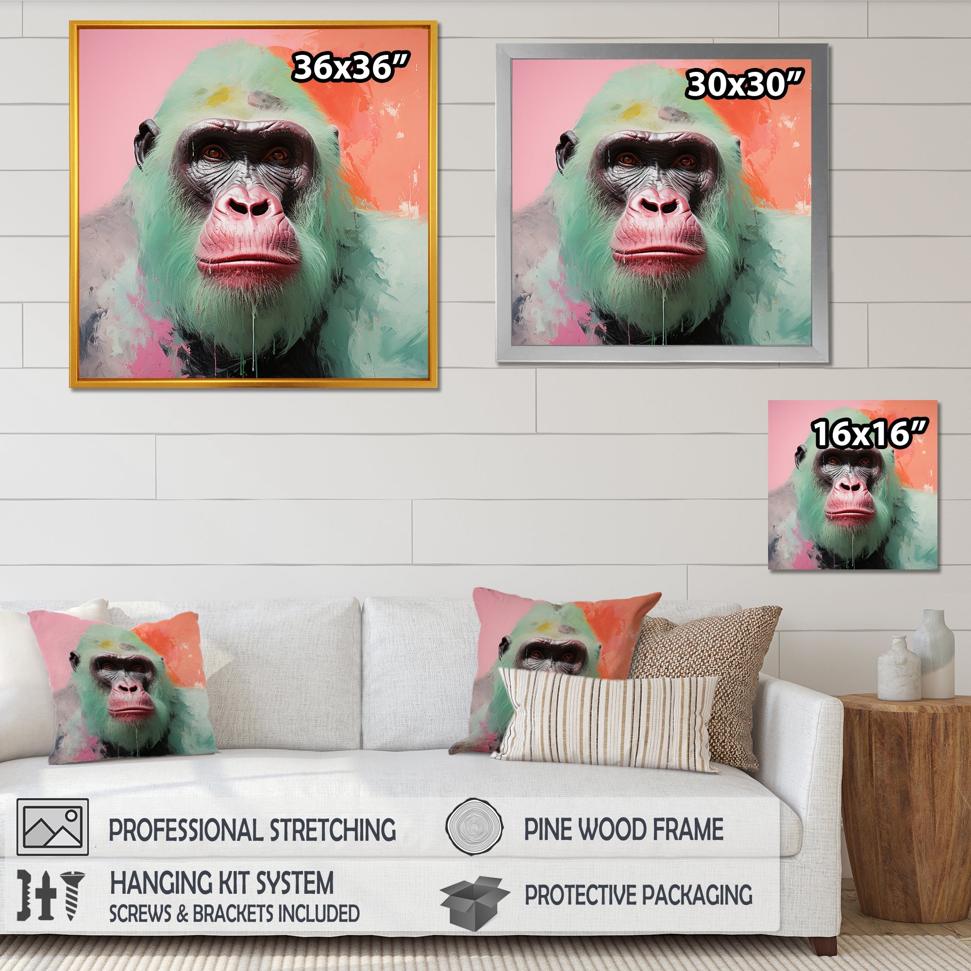 This beautiful Green and pink Vibrant Gorilla Portrait Canvas Art is printed using the highest quality fade-resistant ink on canvas. Every one of our fine art giclee canvas prints is printed on premium quality cotton canvas, using the finest quality inks which will not fade over time. Each giclee print is stretched tightly over a 1-inch wood sub frame for small size prints or a 1.5-inch wood subframe for large size prints ensuring the canvas is taught and does not buckle. This canvas art print is gallery-wrapped (the design continues on the sides), giving it a real art gallery feel. All of our canvas prints are carefully packaged with plastic protection, fragile labeling, and sturdy boxes to ensure safe delivery. Every canvas print arrives ready to hang on the wall, with the hanging kits included.