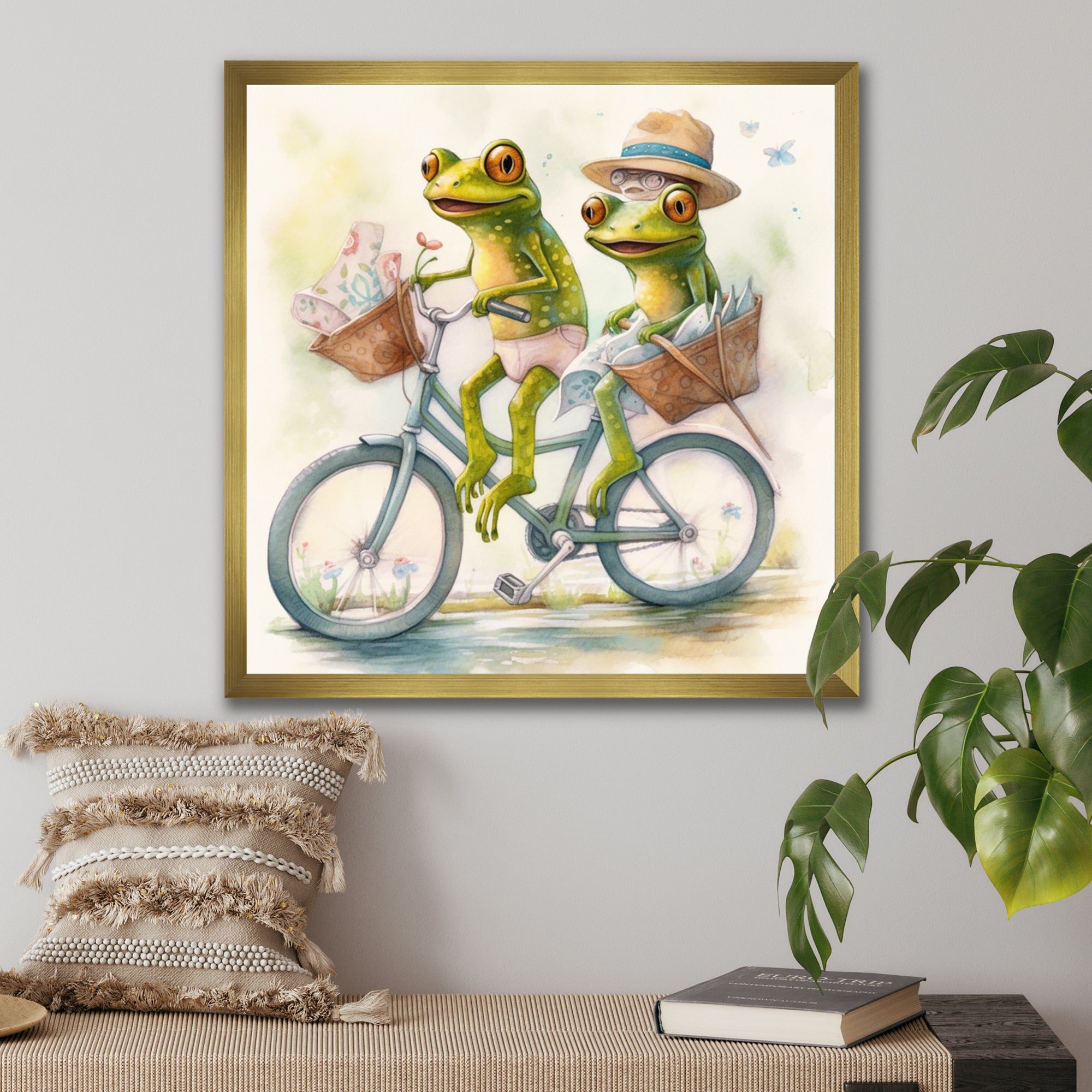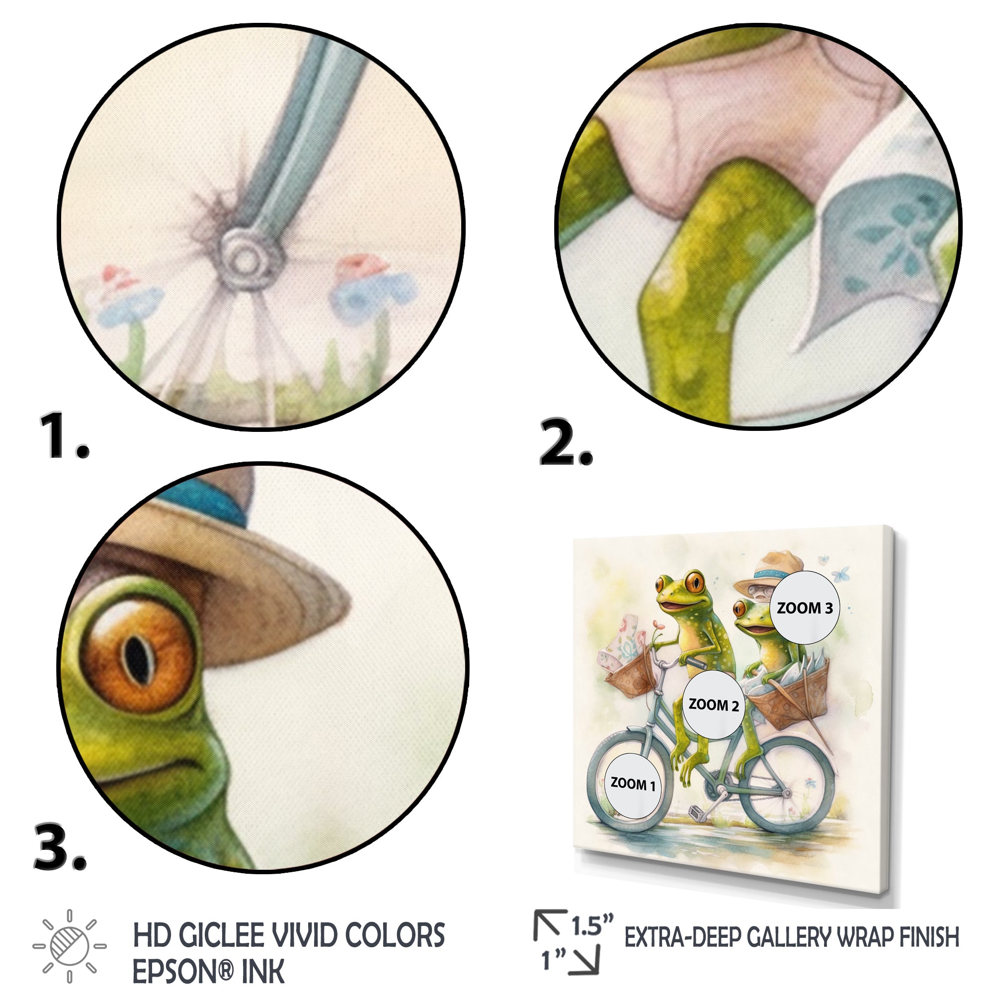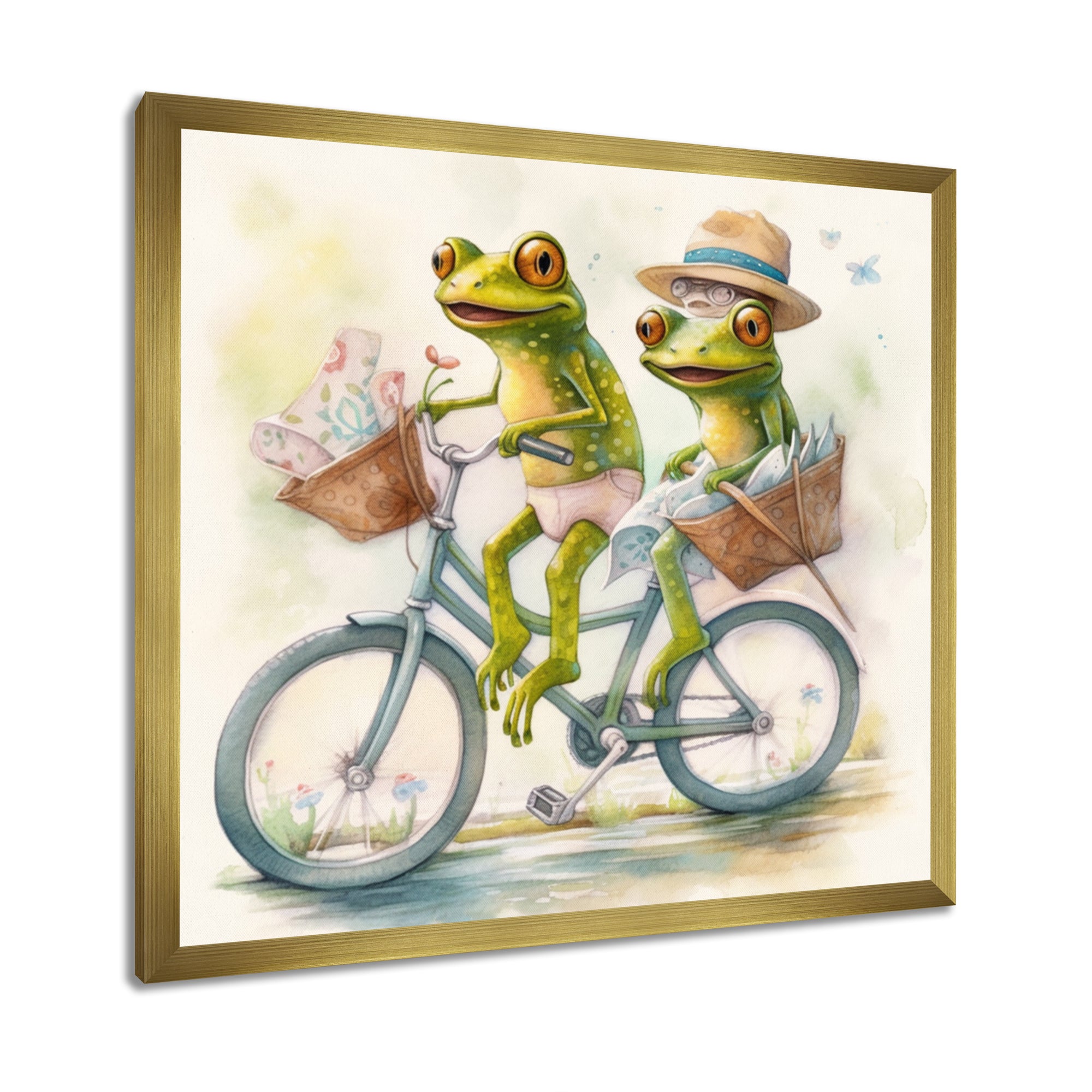 This beautiful Green Frogs Riding A Bike Canvas Art is printed using the highest quality fade-resistant ink on canvas. Every one of our fine art giclee canvas prints is printed on premium quality cotton canvas, using the finest quality inks which will not fade over time. Each giclee print is stretched tightly over a 1-inch wood sub frame for small size prints or a 1.5-inch wood subframe for large size prints ensuring the canvas is taught and does not buckle. This canvas art print is gallery-wrapped (the design continues on the sides), giving it a real art gallery feel. All of our canvas prints are carefully packaged with plastic protection, fragile labeling, and sturdy boxes to ensure safe delivery. Every canvas print arrives ready to hang on the wall, with the hanging kits included.