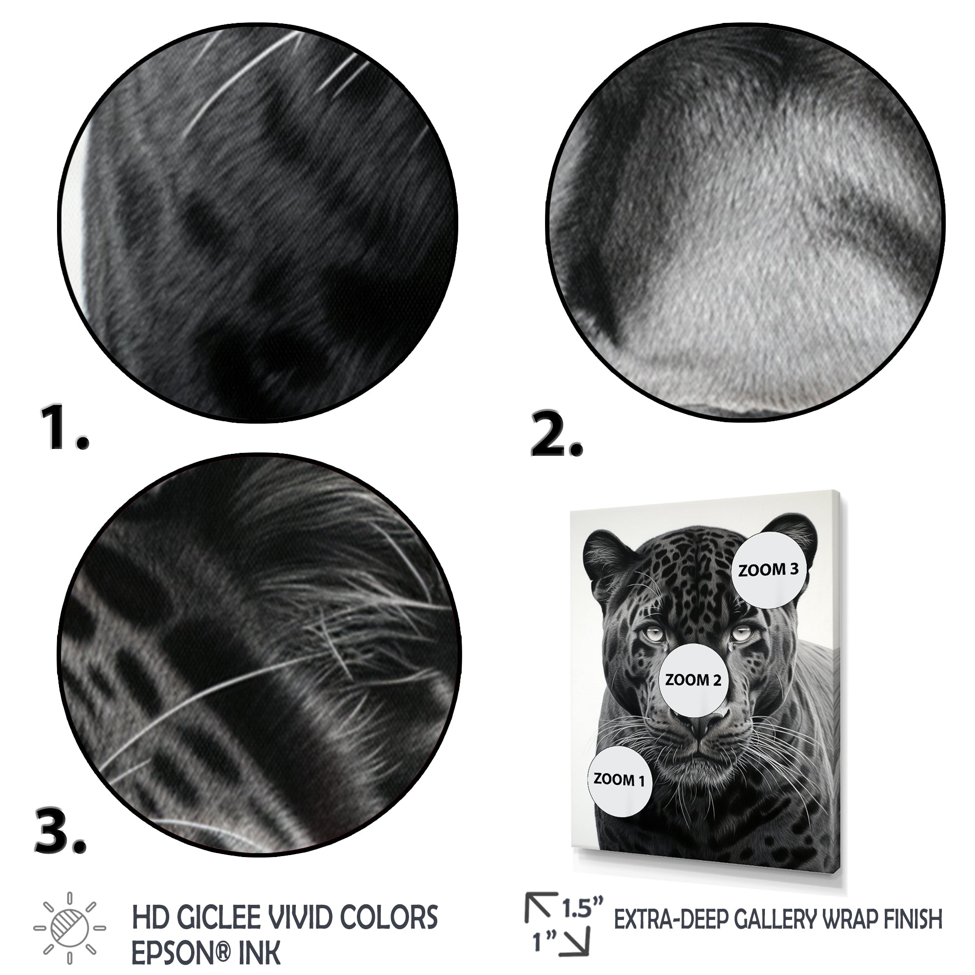 This beautiful Grey White Panther Realistic Gaze Canvas Art is printed using the highest quality fade-resistant ink on canvas. Every one of our fine art giclee canvas prints is printed on premium quality cotton canvas, using the finest quality inks which will not fade over time. Each giclee print is stretched tightly over a 1-inch wood sub frame for small size prints or a 1.5-inch wood subframe for large size prints ensuring the canvas is taught and does not buckle. This canvas art print is gallery-wrapped (the design continues on the sides), giving it a real art gallery feel. All of our canvas prints are carefully packaged with plastic protection, fragile labeling, and sturdy boxes to ensure safe delivery. Every canvas print arrives ready to hang on the wall, with the hanging kits included.