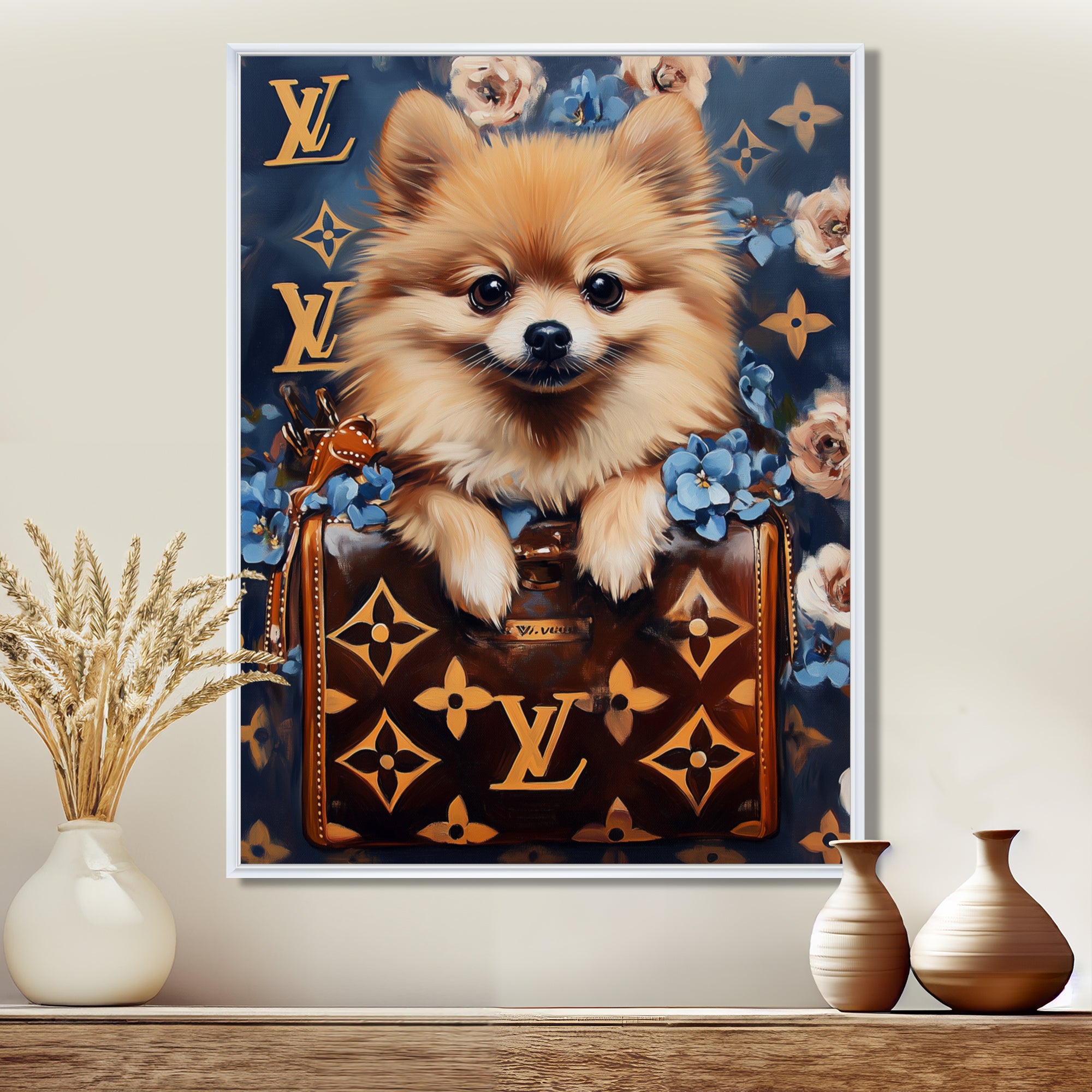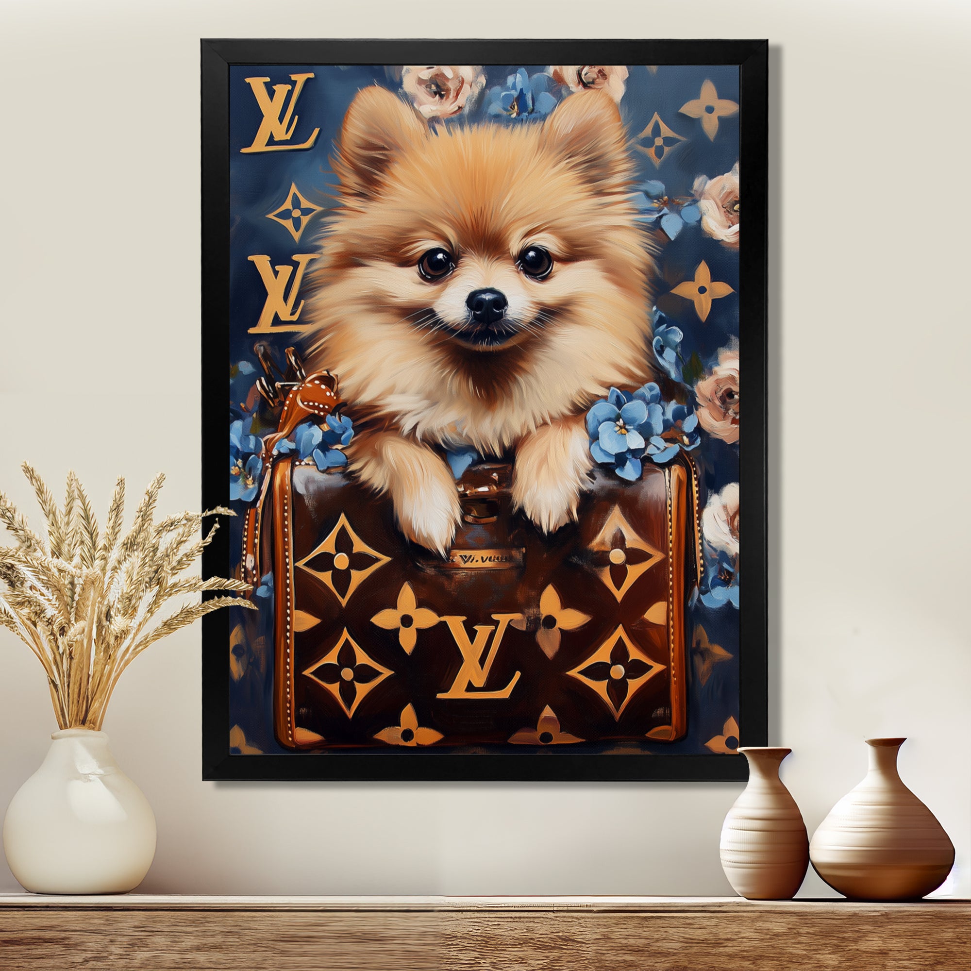 This beautiful High Fashion Pomeranian Dog In Handbag Canvas Art is printed using the highest quality fade-resistant ink on canvas. Every one of our fine art giclee canvas prints is printed on premium quality cotton canvas, using the finest quality inks which will not fade over time. Each giclee print is stretched tightly over a 1-inch wood sub frame for small size prints or a 1.5-inch wood subframe for large size prints ensuring the canvas is taught and does not buckle. This canvas art print is gallery-wrapped (the design continues on the sides), giving it a real art gallery feel. All of our canvas prints are carefully packaged with plastic protection, fragile labeling, and sturdy boxes to ensure safe delivery. Every canvas print arrives ready to hang on the wall, with the hanging kits included.