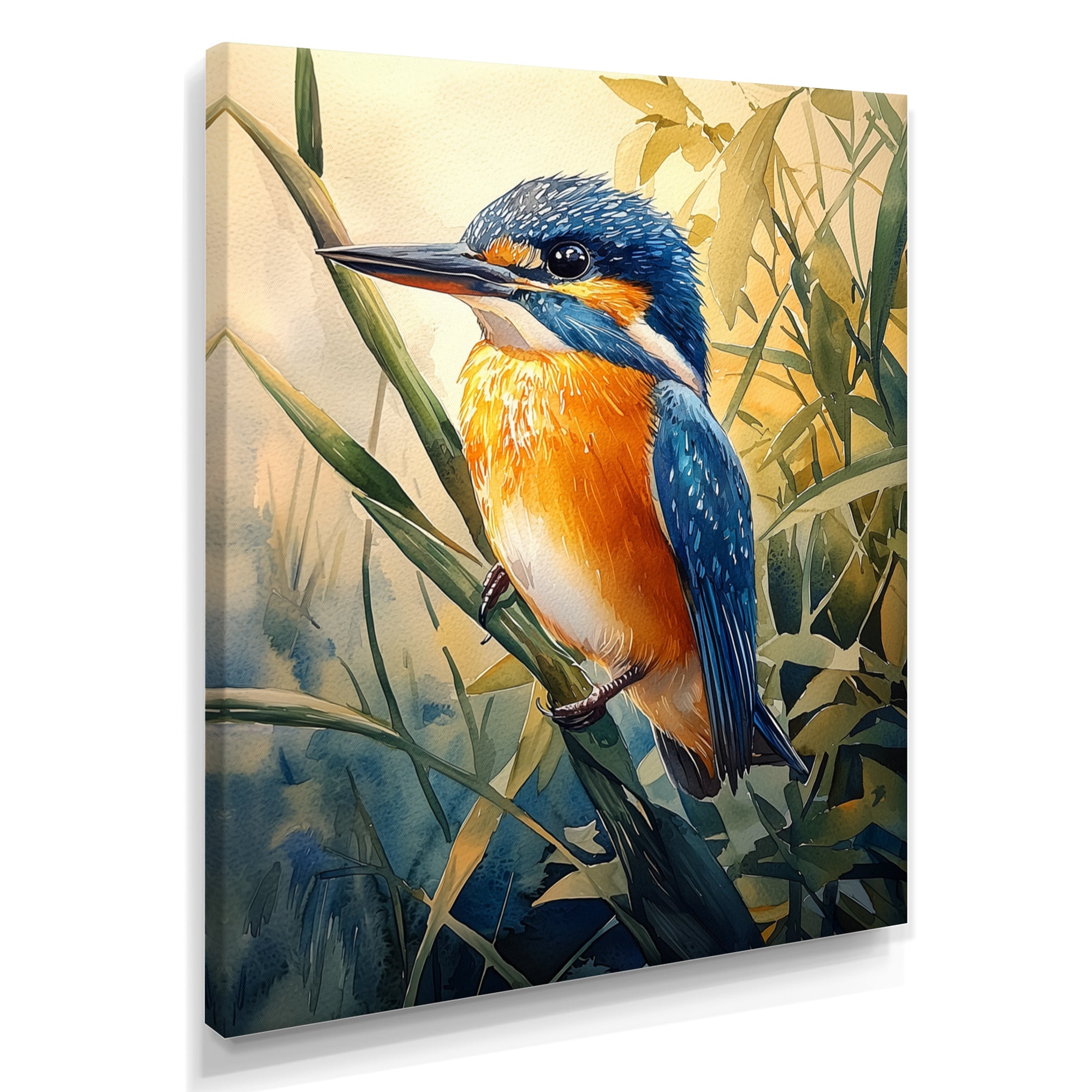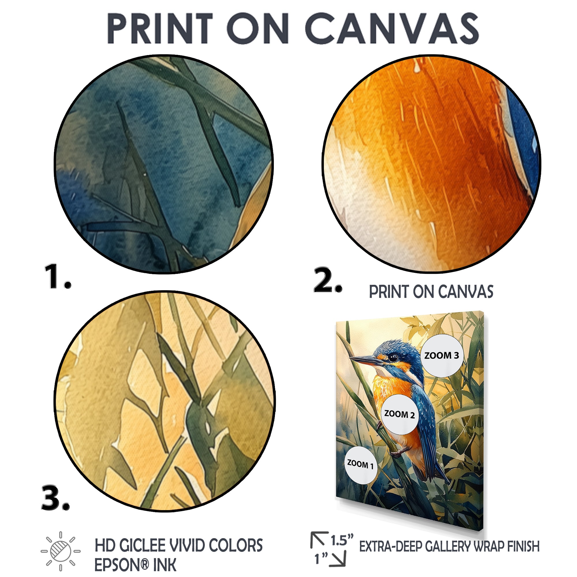 This beautiful Kingfisher In The Reeds Canvas Art is printed using the highest quality fade-resistant ink on canvas. Every one of our fine art giclee canvas prints is printed on premium quality cotton canvas, using the finest quality inks which will not fade over time. Each giclee print is stretched tightly over a 1-inch wood sub frame for small size prints or a 1.5-inch wood subframe for large size prints ensuring the canvas is taught and does not buckle. This canvas art print is gallery-wrapped (the design continues on the sides), giving it a real art gallery feel. All of our canvas prints are carefully packaged with plastic protection, fragile labeling, and sturdy boxes to ensure safe delivery. Every canvas print arrives ready to hang on the wall, with the hanging kits included.