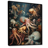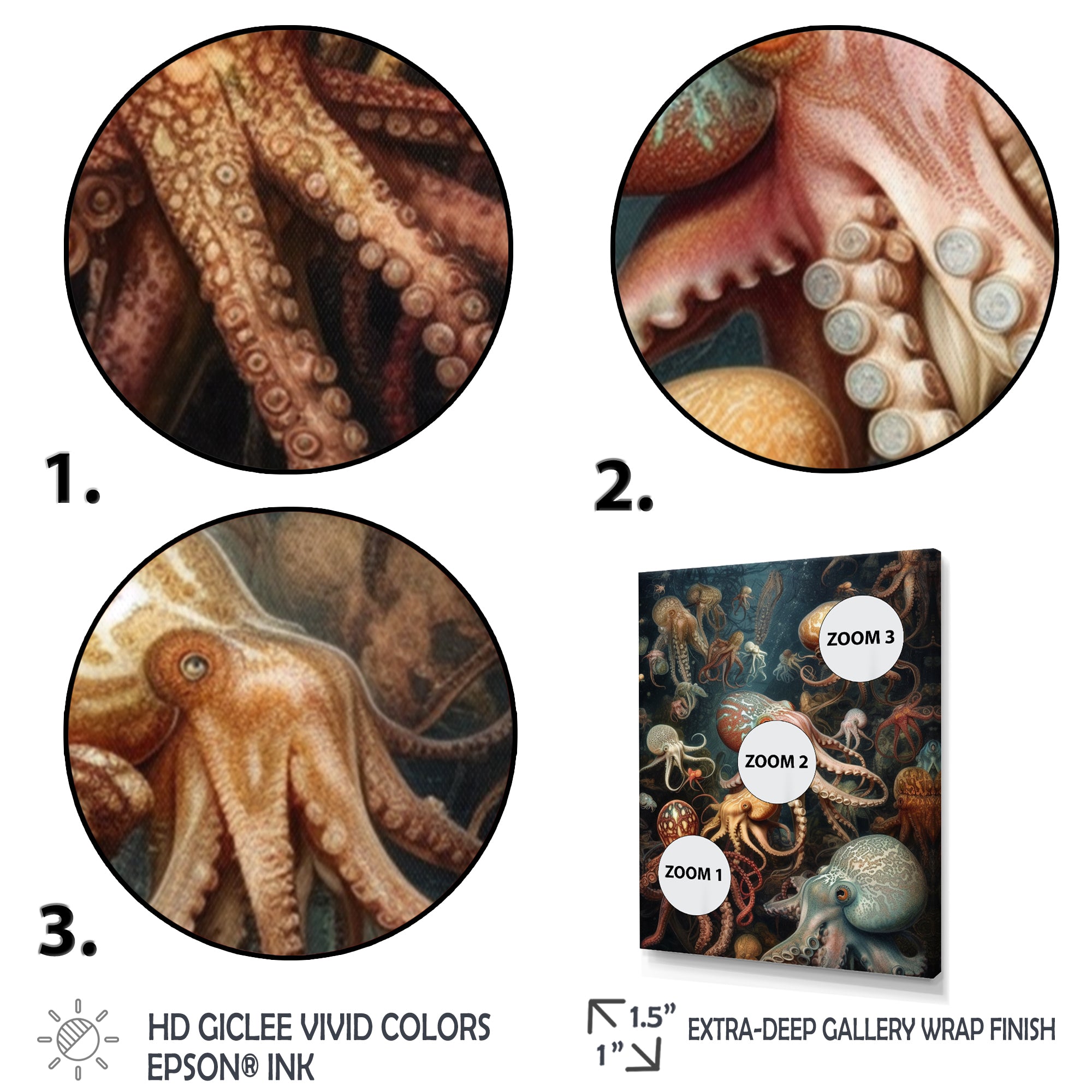 This beautiful Many Squids Canvas Art is printed using the highest quality fade-resistant ink on canvas. Every one of our fine art giclee canvas prints is printed on premium quality cotton canvas, using the finest quality inks which will not fade over time. Each giclee print is stretched tightly over a 1-inch wood sub frame for small size prints or a 1.5-inch wood subframe for large size prints ensuring the canvas is taught and does not buckle. This canvas art print is gallery-wrapped (the design continues on the sides), giving it a real art gallery feel. All of our canvas prints are carefully packaged with plastic protection, fragile labeling, and sturdy boxes to ensure safe delivery. Every canvas print arrives ready to hang on the wall, with the hanging kits included.