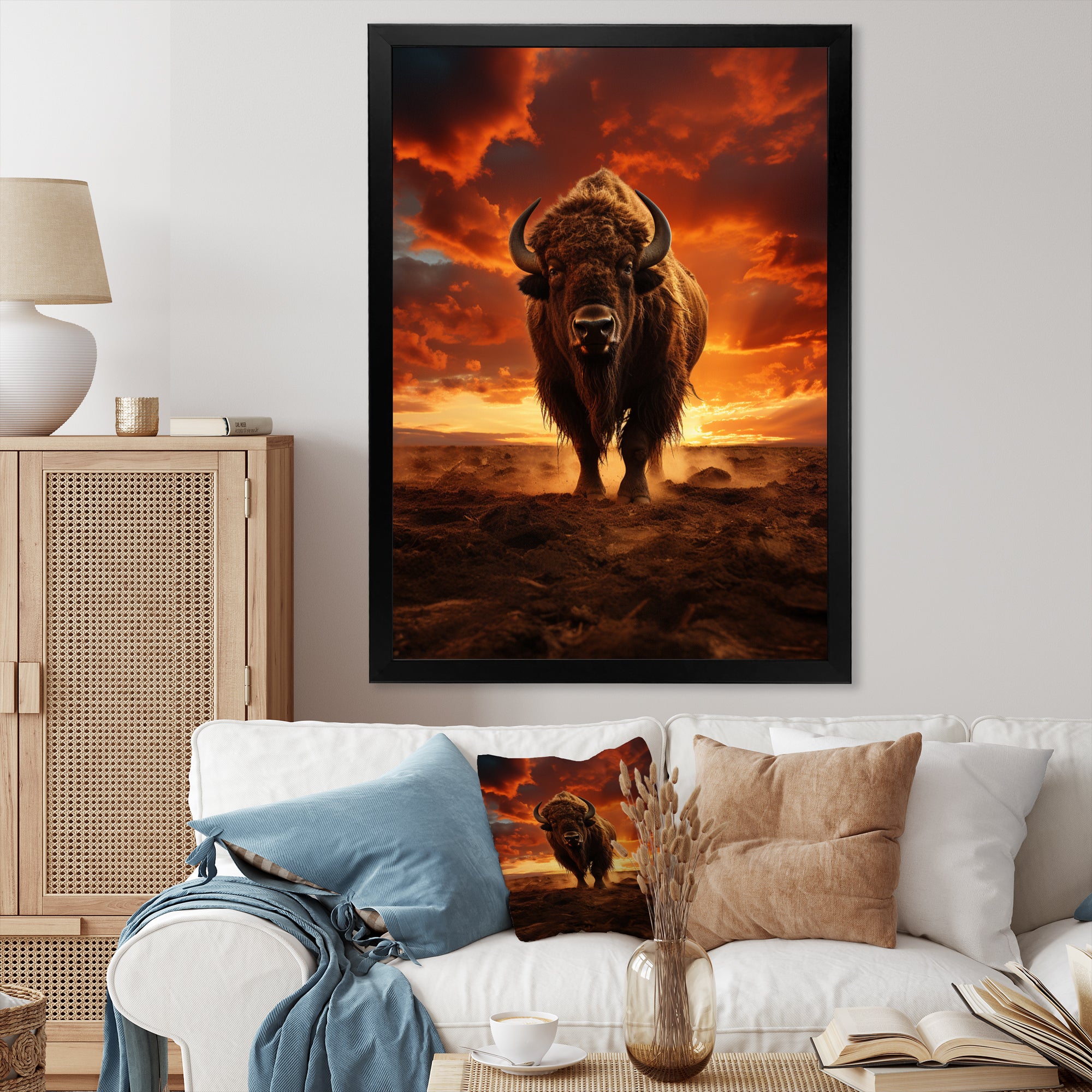 This beautiful Orange Brown Buffalo Silhouette Serenade Canvas Art is printed using the highest quality fade-resistant ink on canvas. Every one of our fine art giclee canvas prints is printed on premium quality cotton canvas, using the finest quality inks which will not fade over time. Each giclee print is stretched tightly over a 1-inch wood sub frame for small size prints or a 1.5-inch wood subframe for large size prints ensuring the canvas is taught and does not buckle. This canvas art print is gallery-wrapped (the design continues on the sides), giving it a real art gallery feel. All of our canvas prints are carefully packaged with plastic protection, fragile labeling, and sturdy boxes to ensure safe delivery. Every canvas print arrives ready to hang on the wall, with the hanging kits included.