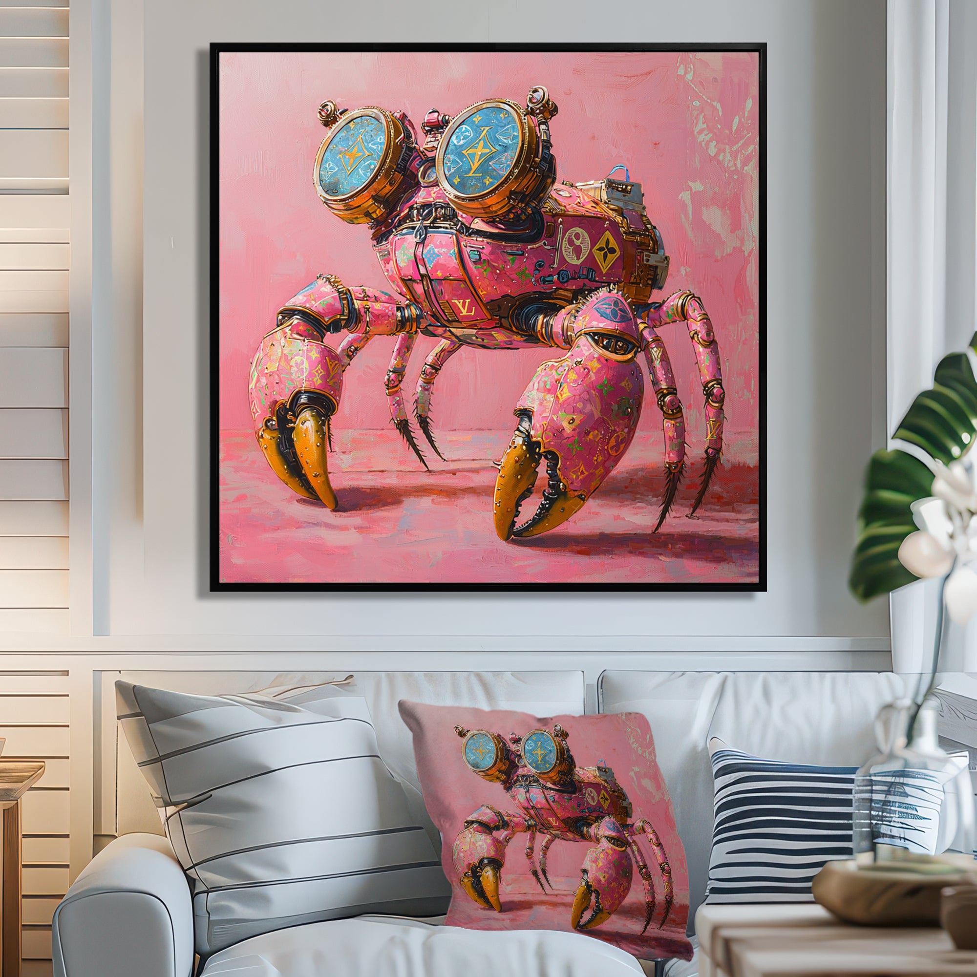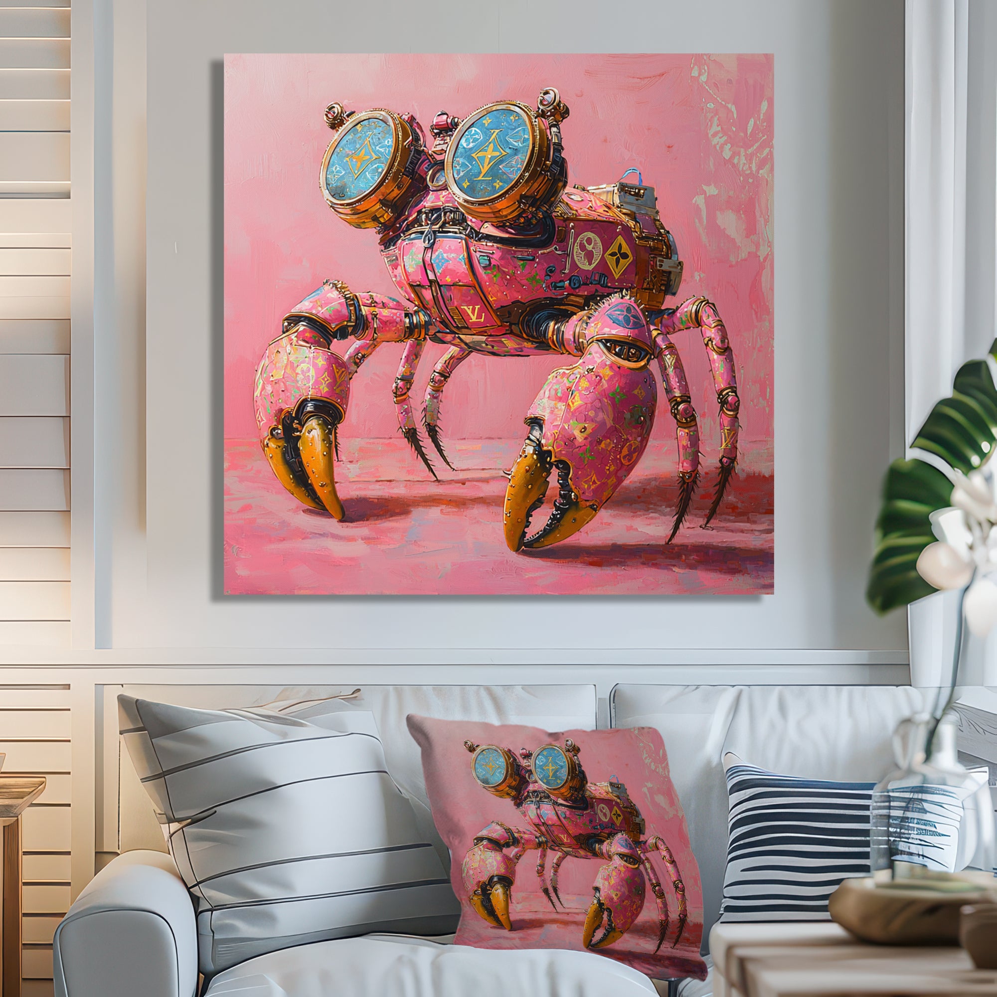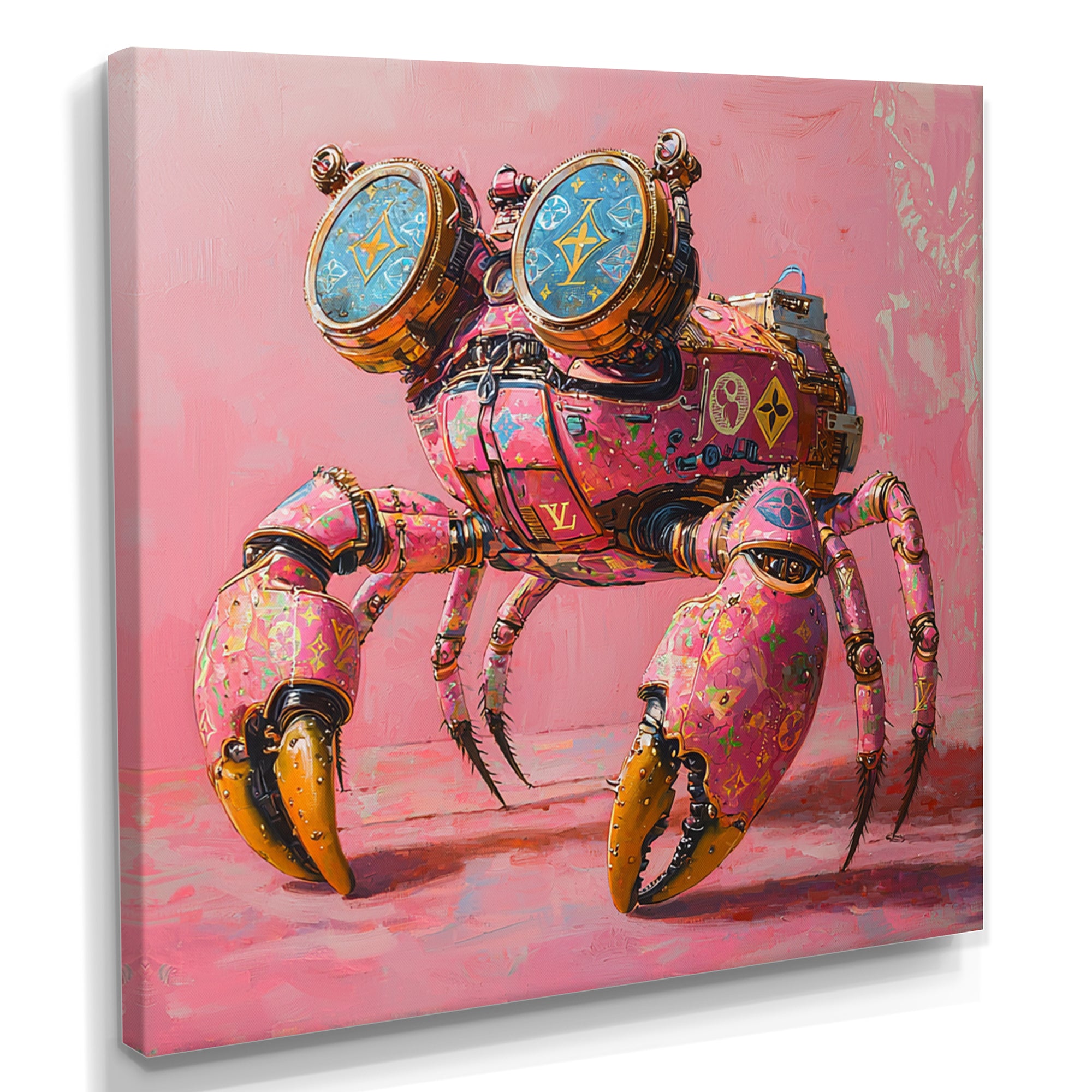 This beautiful Pink And Blue Crab A Walking Robot Crab Canvas Art is printed using the highest quality fade-resistant ink on canvas. Every one of our fine art giclee canvas prints is printed on premium quality cotton canvas, using the finest quality inks which will not fade over time. Each giclee print is stretched tightly over a 1-inch wood sub frame for small size prints or a 1.5-inch wood subframe for large size prints ensuring the canvas is taught and does not buckle. This canvas art print is gallery-wrapped (the design continues on the sides), giving it a real art gallery feel. All of our canvas prints are carefully packaged with plastic protection, fragile labeling, and sturdy boxes to ensure safe delivery. Every canvas print arrives ready to hang on the wall, with the hanging kits included.