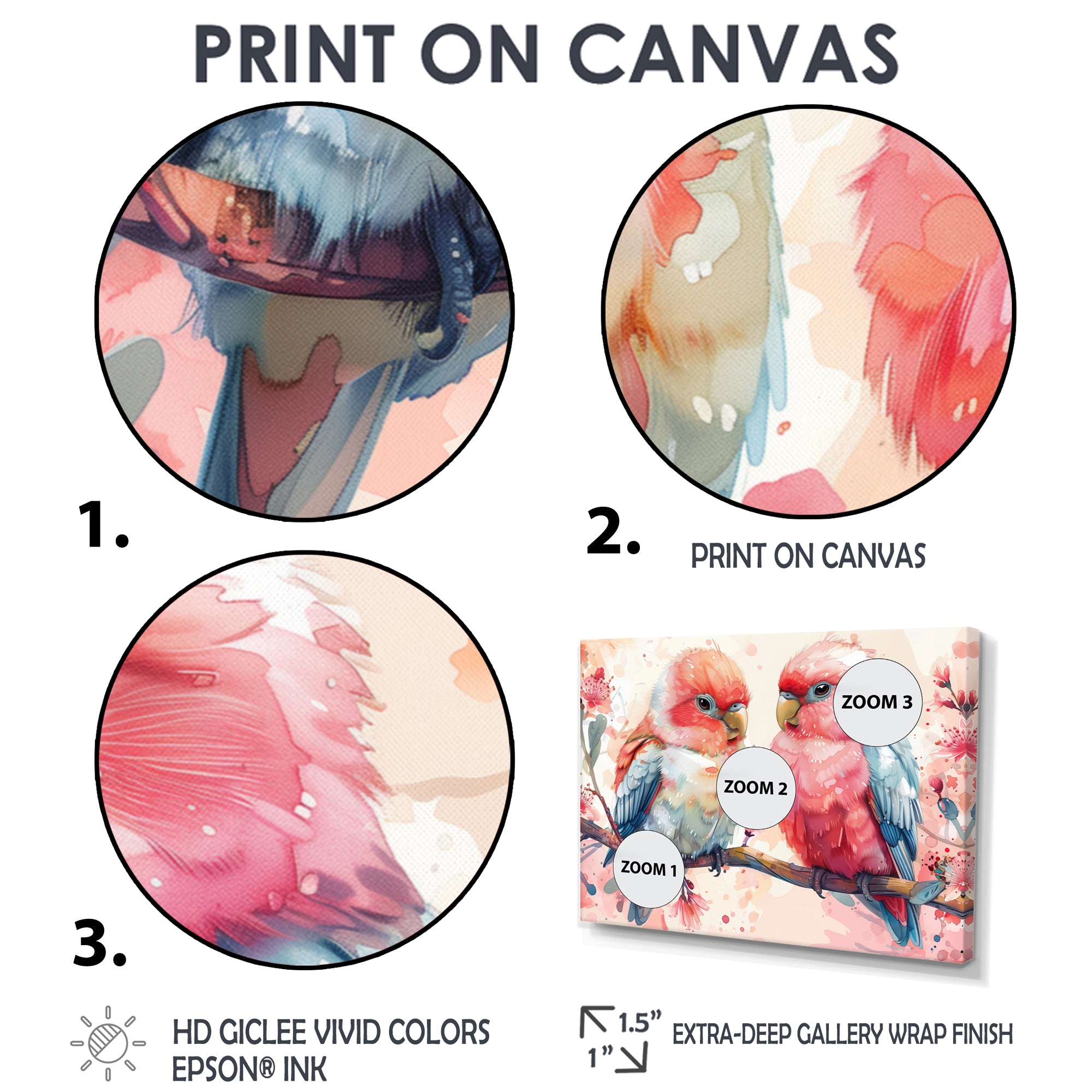 This beautiful Pink blue parrots on a floral branch Canvas Art is printed using the highest quality fade-resistant ink on canvas. Every one of our fine art giclee canvas prints is printed on premium quality cotton canvas, using the finest quality inks which will not fade over time. Each giclee print is stretched tightly over a 1-inch wood sub frame for small size prints or a 1.5-inch wood subframe for large size prints ensuring the canvas is taught and does not buckle. This canvas art print is gallery-wrapped (the design continues on the sides), giving it a real art gallery feel. All of our canvas prints are carefully packaged with plastic protection, fragile labeling, and sturdy boxes to ensure safe delivery. Every canvas print arrives ready to hang on the wall, with the hanging kits included.
