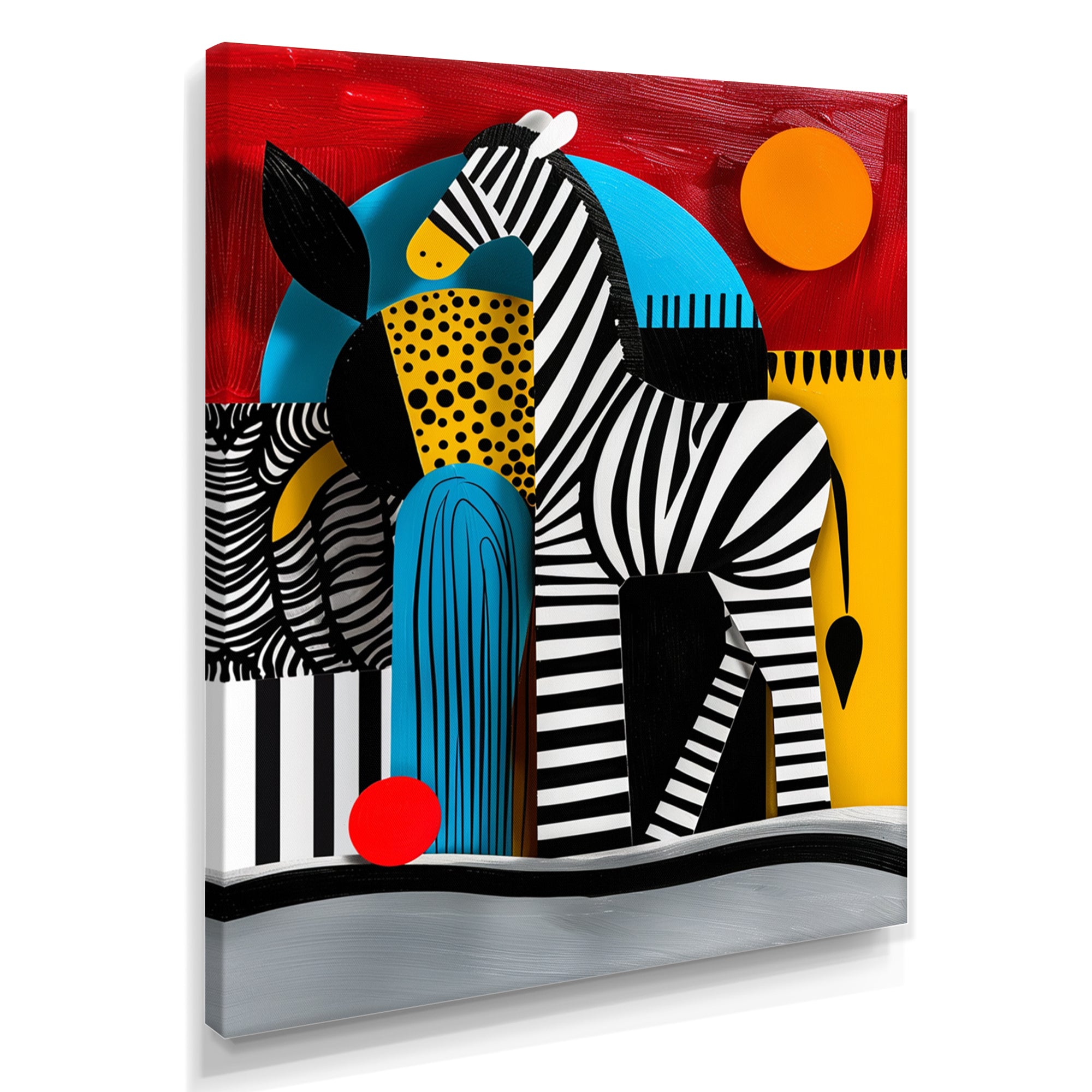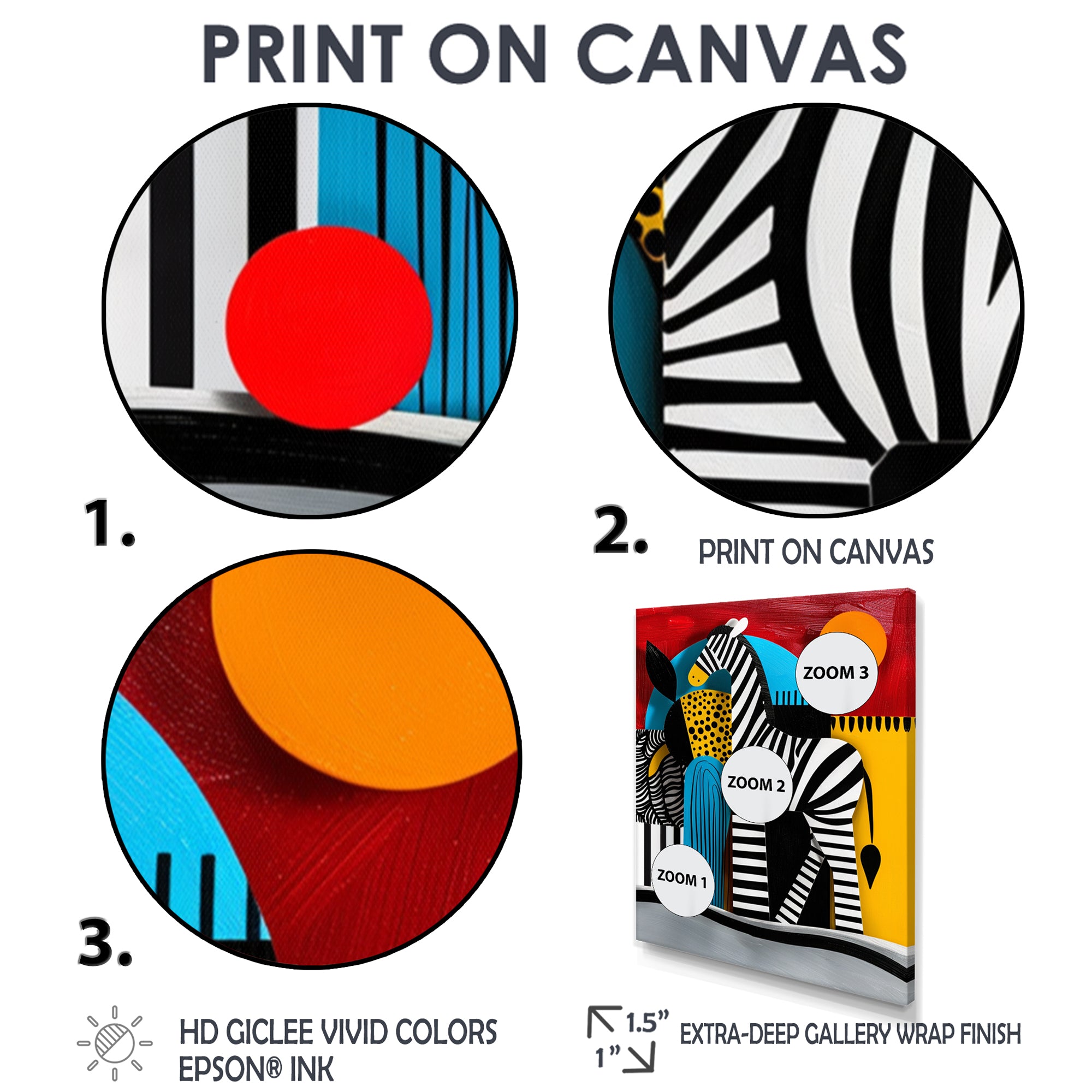 This beautiful Playful Zebra Geometric Retro Abstract Canvas Art is printed using the highest quality fade-resistant ink on canvas. Every one of our fine art giclee canvas prints is printed on premium quality cotton canvas, using the finest quality inks which will not fade over time. Each giclee print is stretched tightly over a 1-inch wood sub frame for small size prints or a 1.5-inch wood subframe for large size prints ensuring the canvas is taught and does not buckle. This canvas art print is gallery-wrapped (the design continues on the sides), giving it a real art gallery feel. All of our canvas prints are carefully packaged with plastic protection, fragile labeling, and sturdy boxes to ensure safe delivery. Every canvas print arrives ready to hang on the wall, with the hanging kits included.