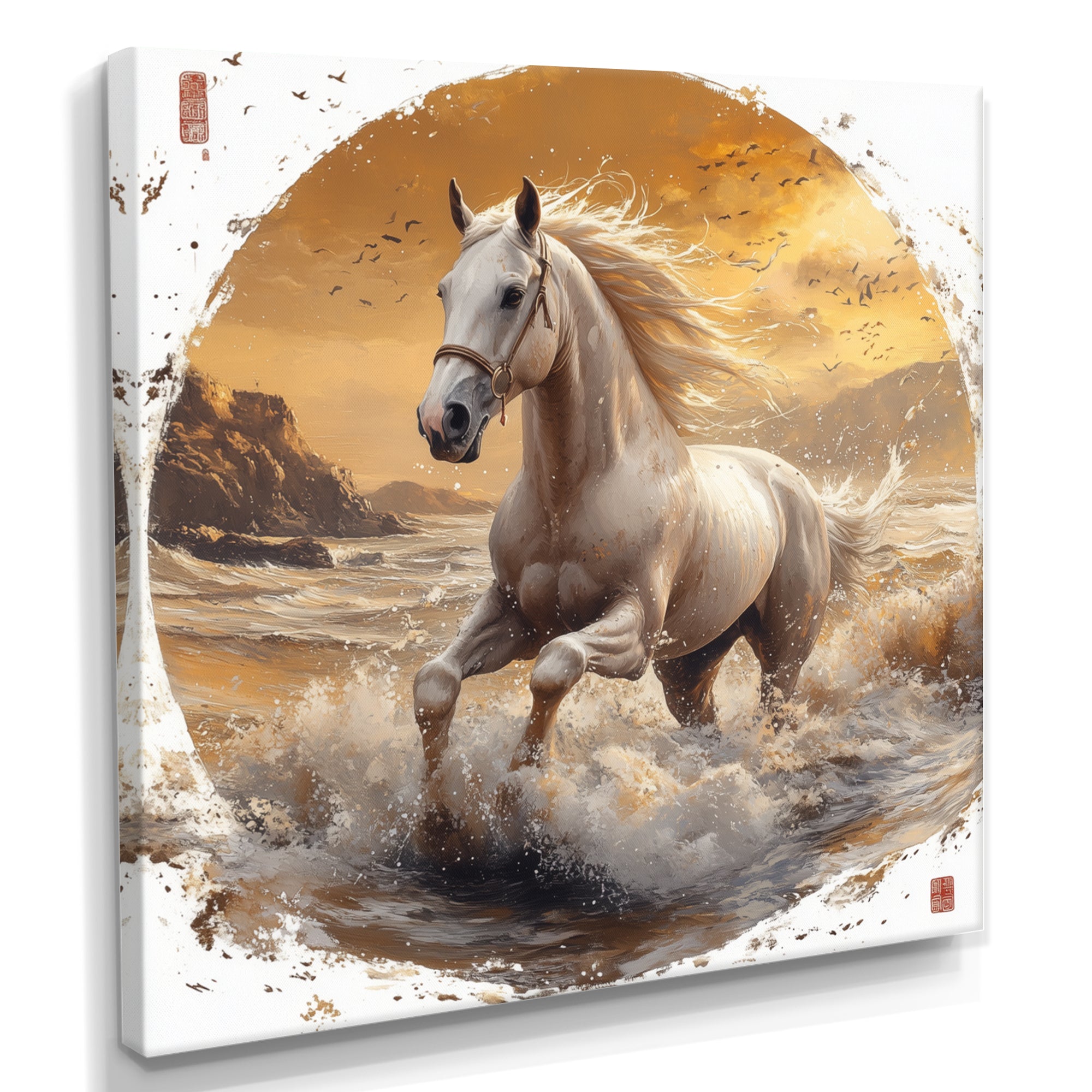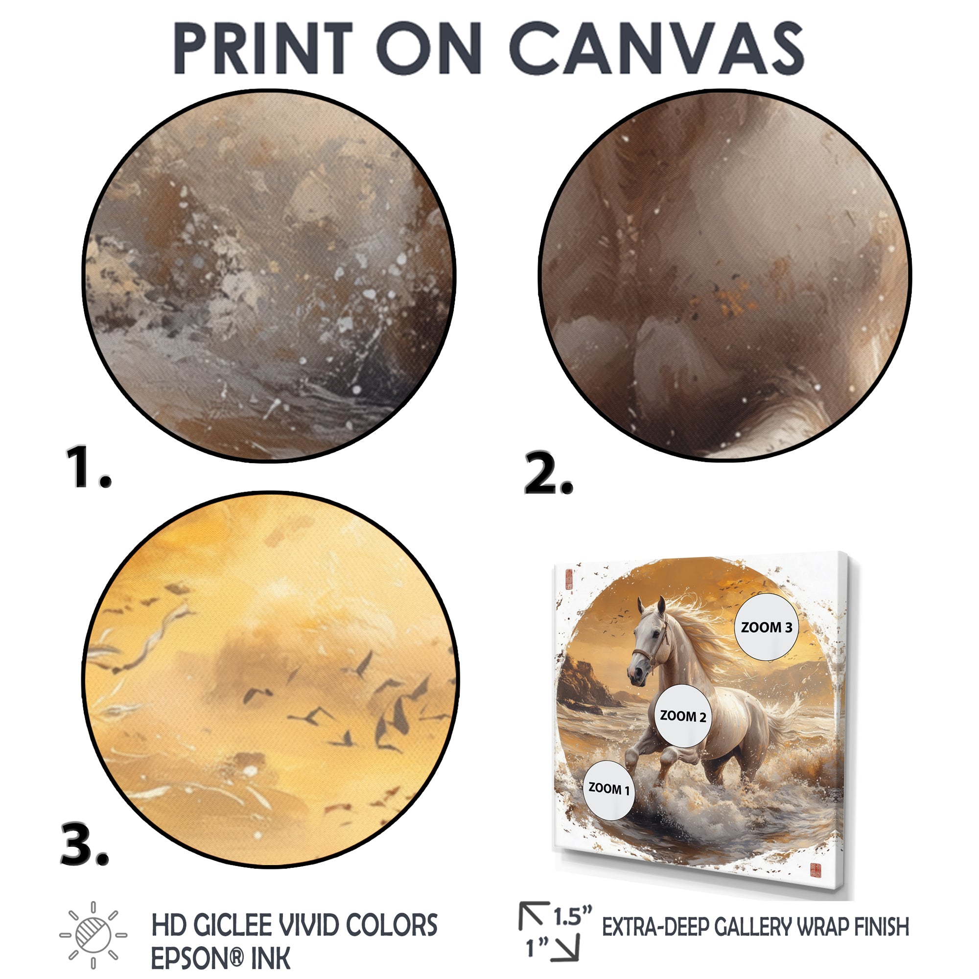 This beautiful White And Gold Horse Canvas Art is printed using the highest quality fade-resistant ink on canvas. Every one of our fine art giclee canvas prints is printed on premium quality cotton canvas, using the finest quality inks which will not fade over time. Each giclee print is stretched tightly over a 1-inch wood sub frame for small size prints or a 1.5-inch wood subframe for large size prints ensuring the canvas is taught and does not buckle. This canvas art print is gallery-wrapped (the design continues on the sides), giving it a real art gallery feel. All of our canvas prints are carefully packaged with plastic protection, fragile labeling, and sturdy boxes to ensure safe delivery. Every canvas print arrives ready to hang on the wall, with the hanging kits included.