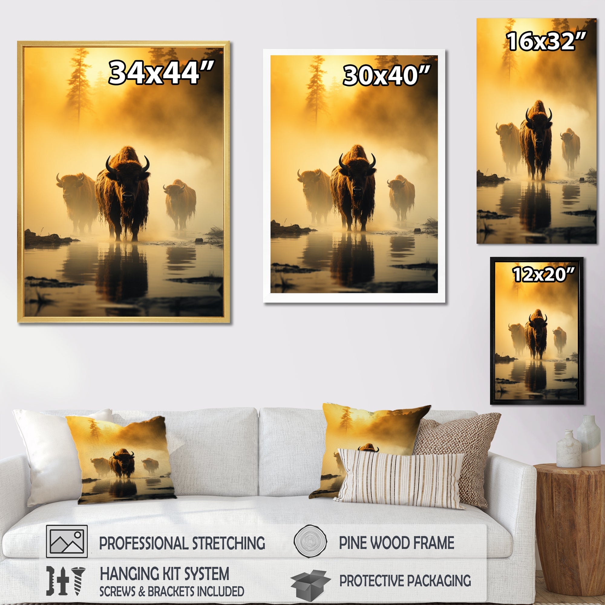 This beautiful Yellow Black Buffalo Ethereal Grazing Canvas Art is printed using the highest quality fade-resistant ink on canvas. Every one of our fine art giclee canvas prints is printed on premium quality cotton canvas, using the finest quality inks which will not fade over time. Each giclee print is stretched tightly over a 1-inch wood sub frame for small size prints or a 1.5-inch wood subframe for large size prints ensuring the canvas is taught and does not buckle. This canvas art print is gallery-wrapped (the design continues on the sides), giving it a real art gallery feel. All of our canvas prints are carefully packaged with plastic protection, fragile labeling, and sturdy boxes to ensure safe delivery. Every canvas print arrives ready to hang on the wall, with the hanging kits included.