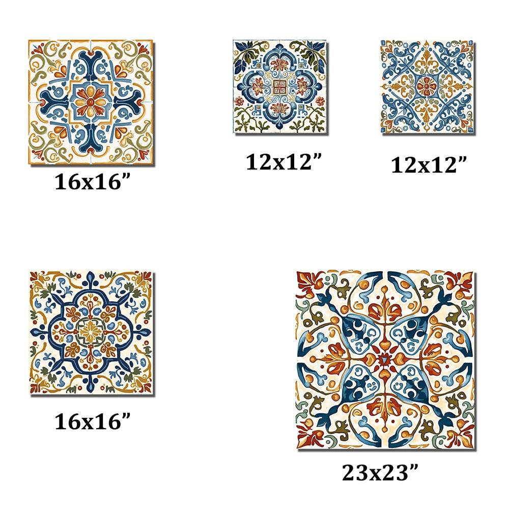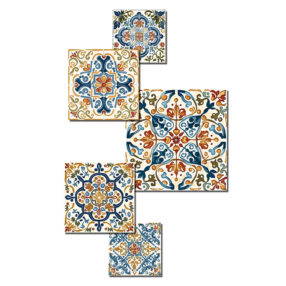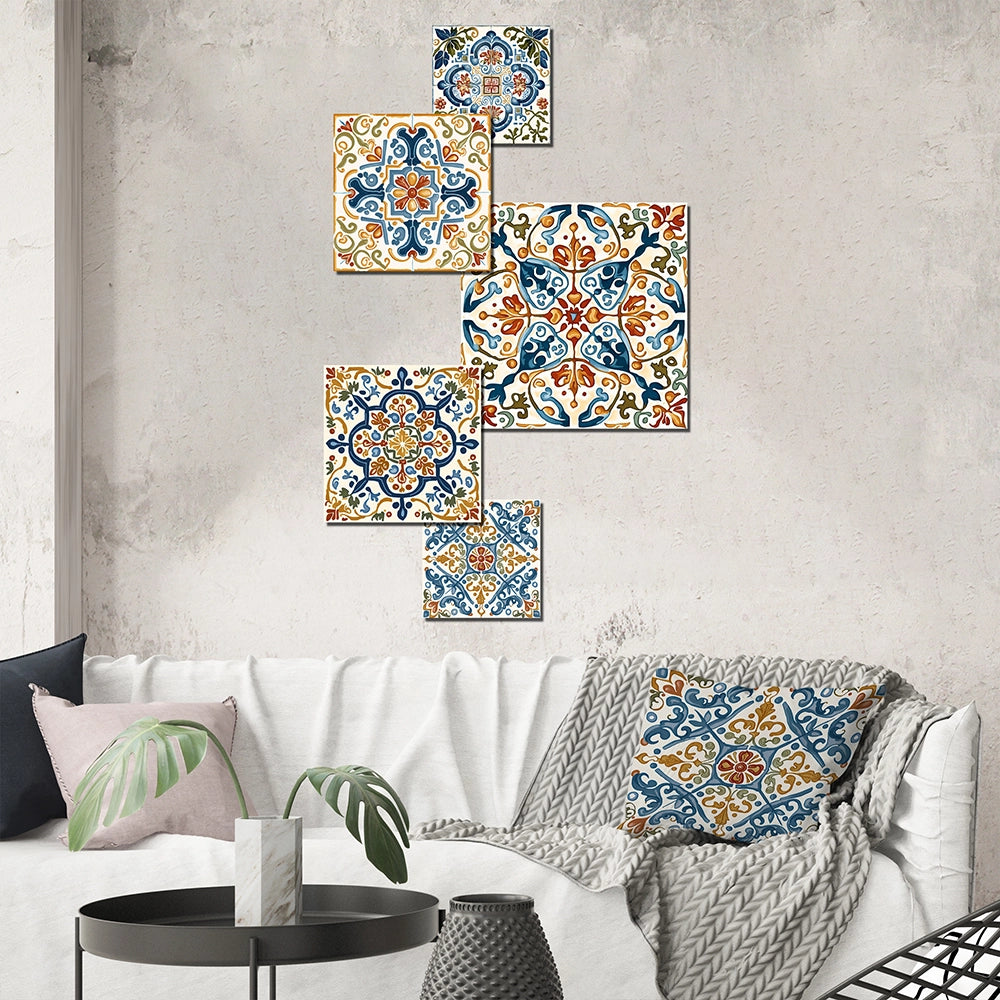 Transitional Metal Wall Art Set - Mediterranean Tiles in Retro Blue I - 5 Pieces