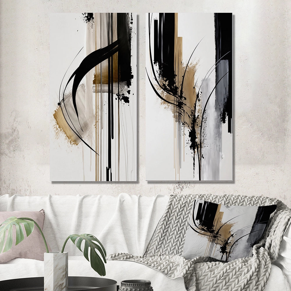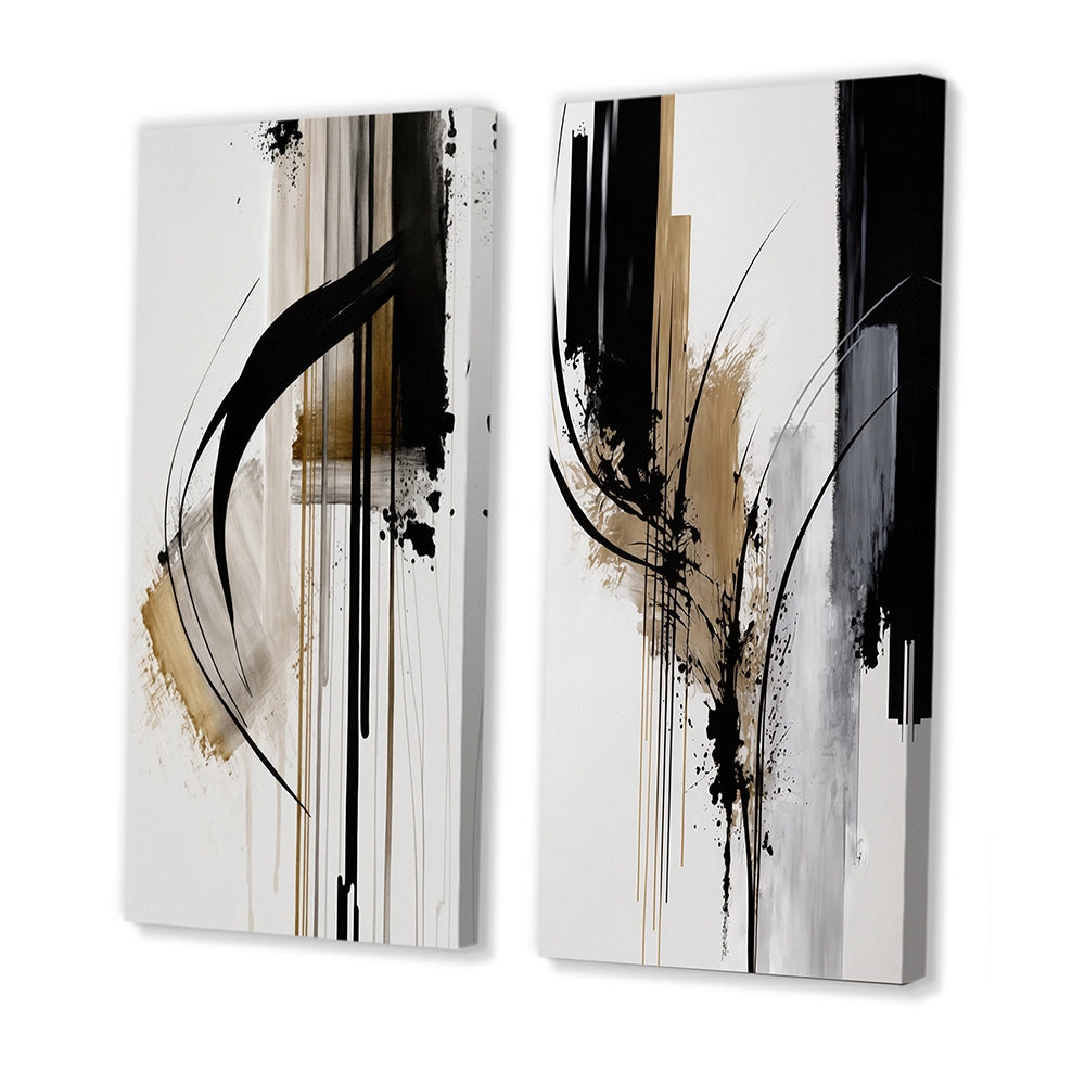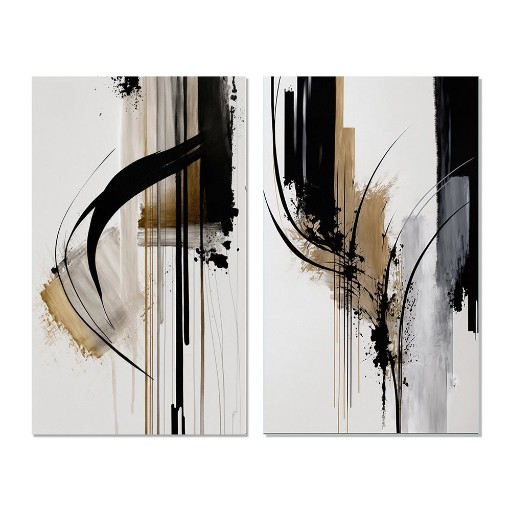 Abstract Canvas Wall Art Set of 2- Black, White And Gold Expression I