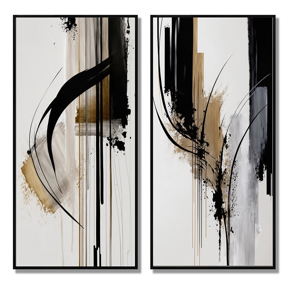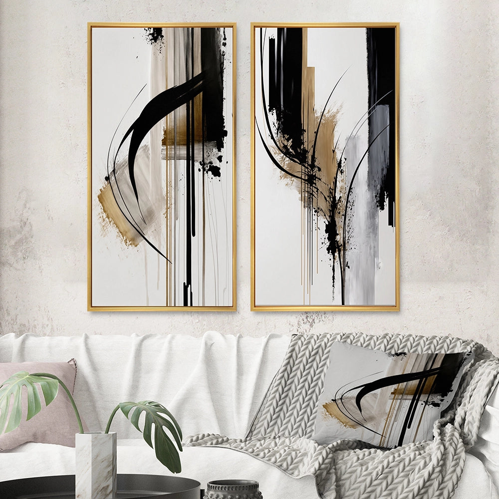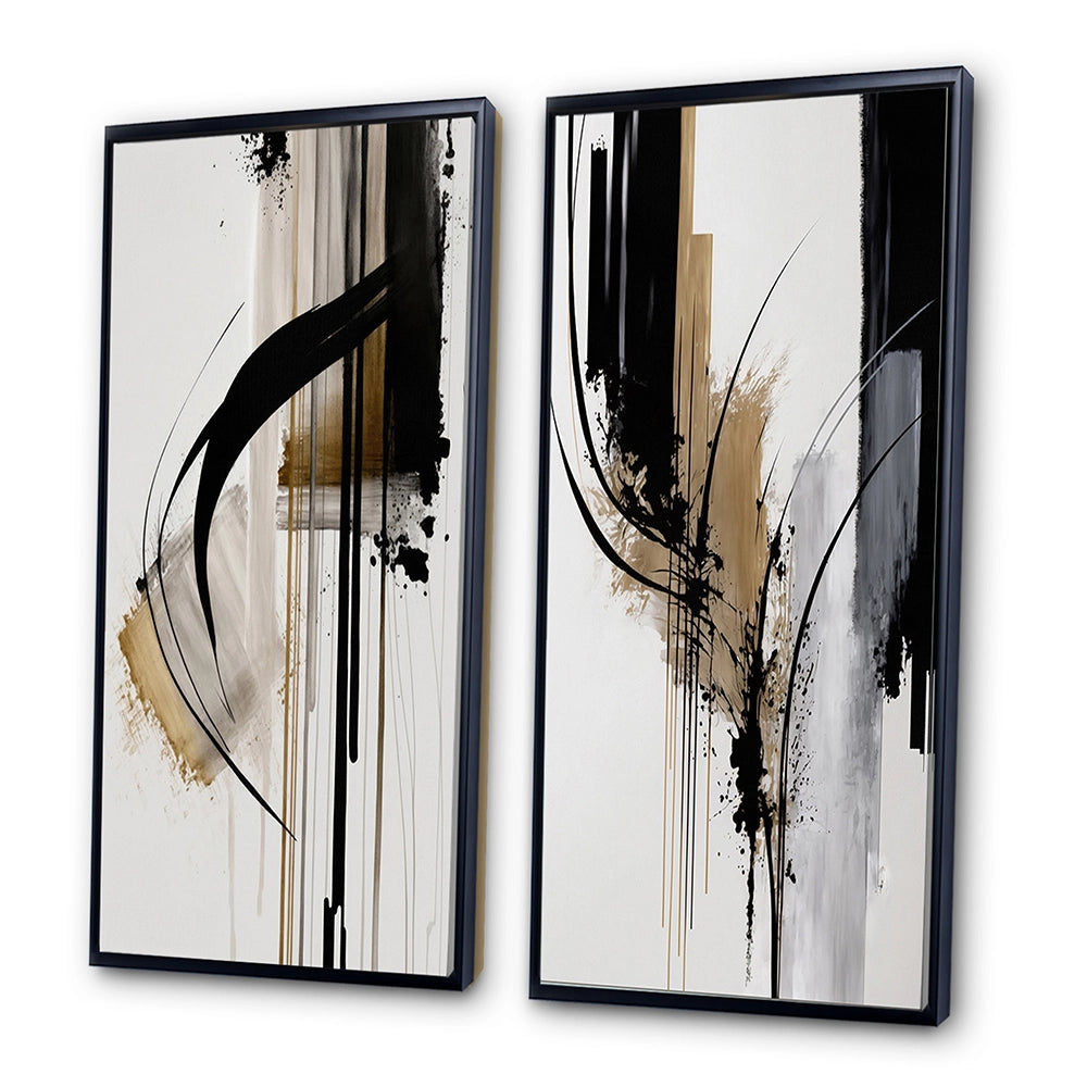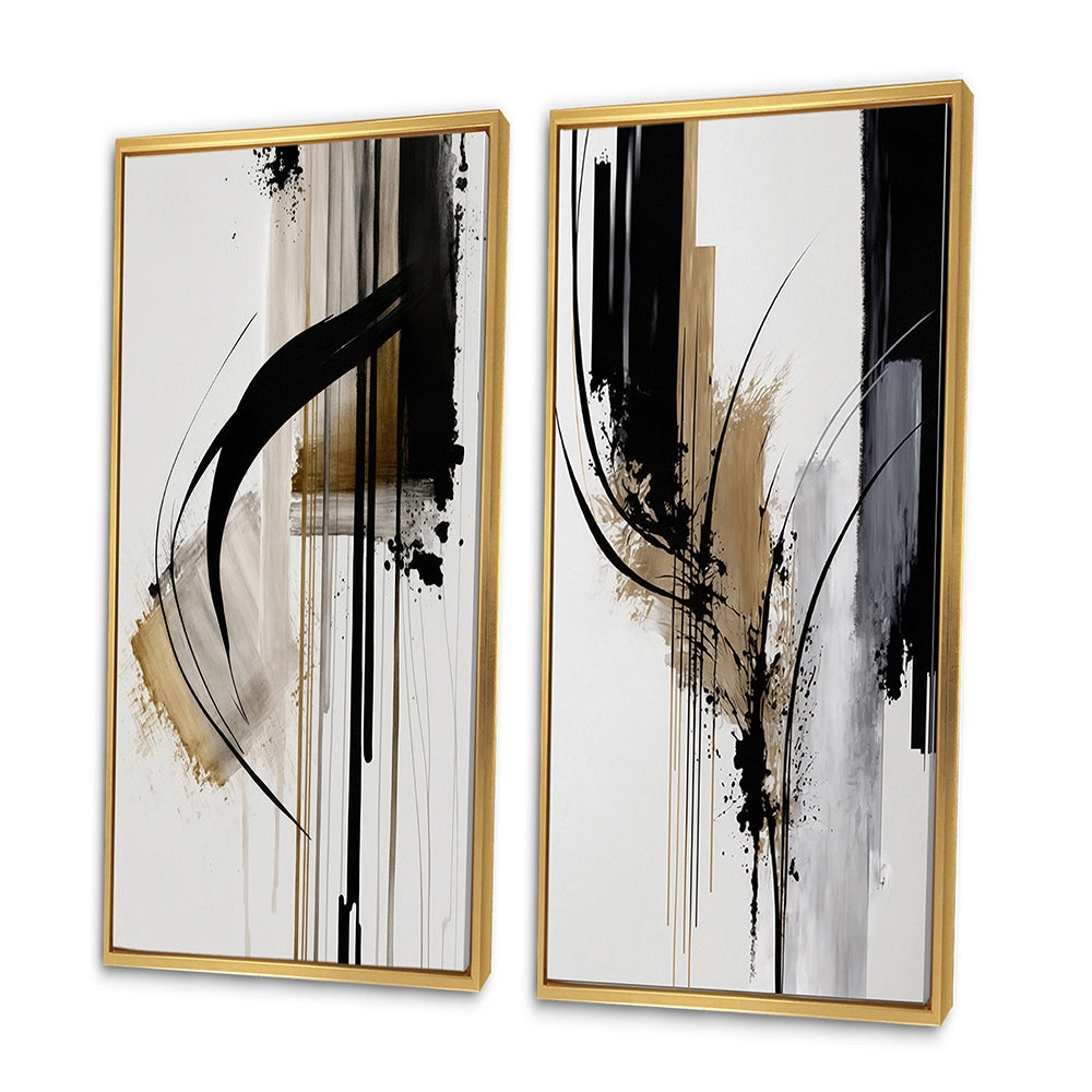 Abstract Canvas Wall Art Set of 2- Black, White And Gold Expression I
