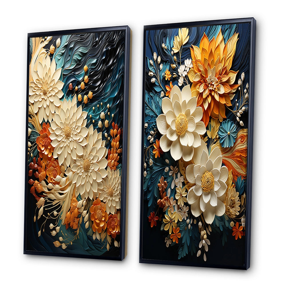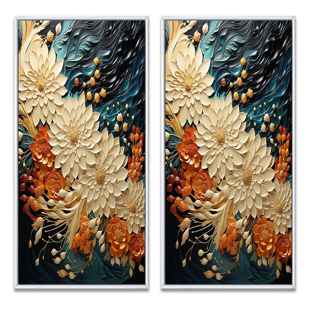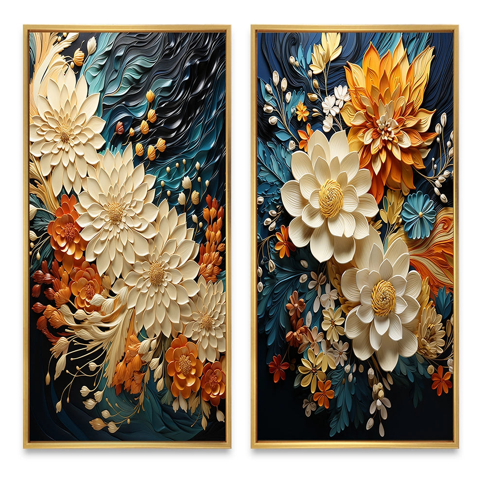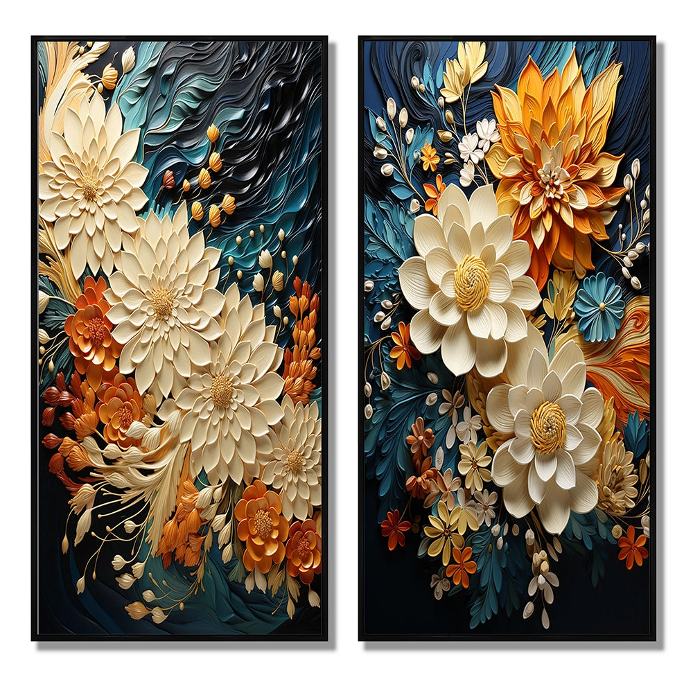 This beautiful Orange Teal Botanical Whirlwind Collage Set of 2 Wall art is printed on premium quality cotton canvas using the finest fade-resistant ink. With options like Wrapped Canvas and Floater Framed Wall Decor, we offer a versatile range to cater to your unique aesthetic preferences. The Wrapped Canvas Art is stretched tautly over a sturdy wooden frame, giving your artwork a sleek, borderless appearance. For those who desire a touch of elegance and depth, our floater-framed canvas art is the ideal choice. The Canvas set is delicately mounted within a floating frame, creating a striking visual contrast between the artwork and the frame. Our collection offers an array of frame colors to complement your interior design, Ensuring that your wall art set seamlessly integrates with your home or office decor.