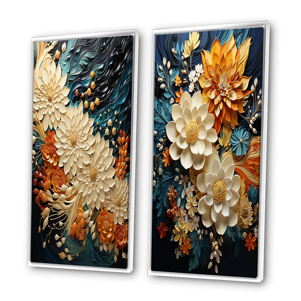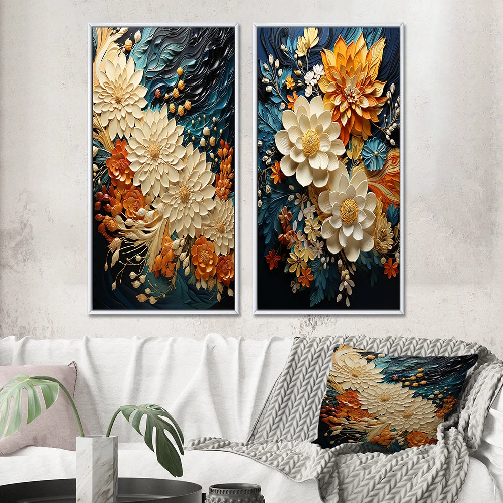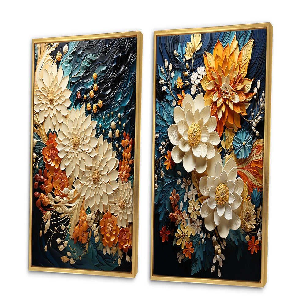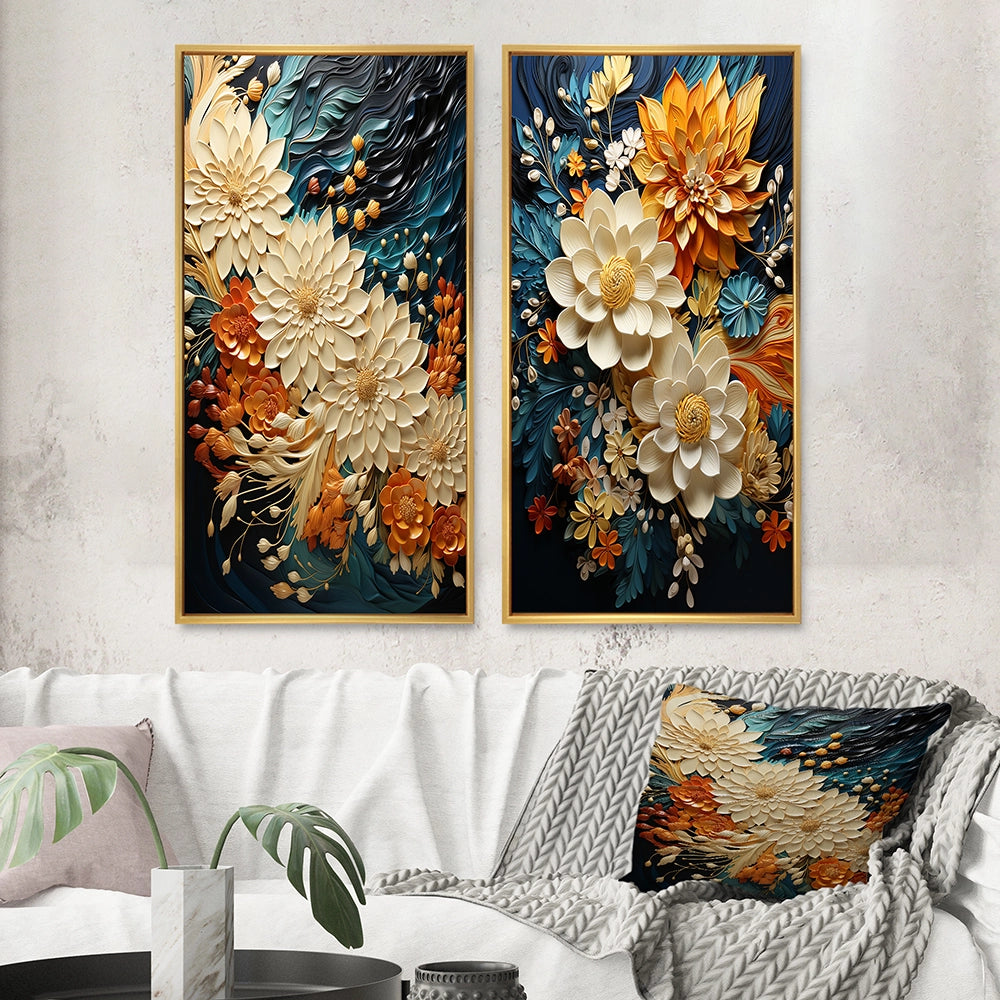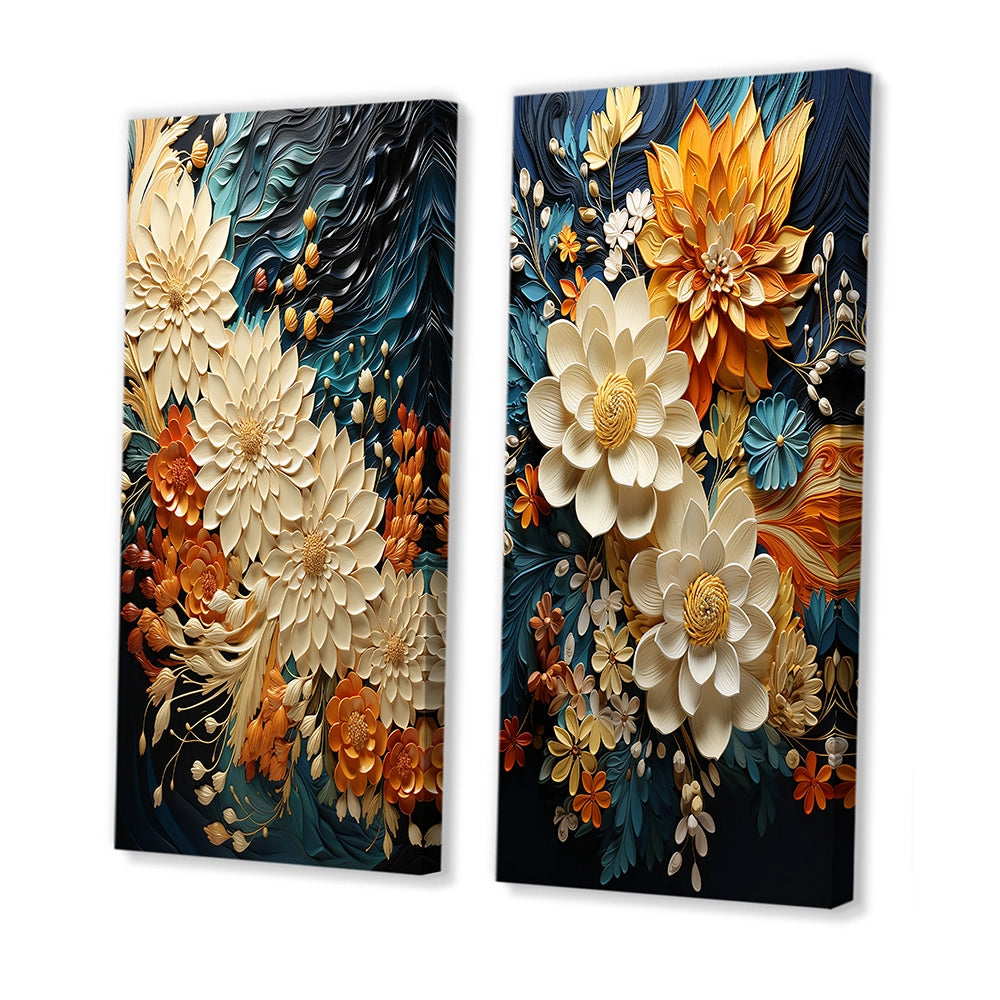 This beautiful Orange Teal Botanical Whirlwind Collage Set of 2 Wall art is printed on premium quality cotton canvas using the finest fade-resistant ink. With options like Wrapped Canvas and Floater Framed Wall Decor, we offer a versatile range to cater to your unique aesthetic preferences. The Wrapped Canvas Art is stretched tautly over a sturdy wooden frame, giving your artwork a sleek, borderless appearance. For those who desire a touch of elegance and depth, our floater-framed canvas art is the ideal choice. The Canvas set is delicately mounted within a floating frame, creating a striking visual contrast between the artwork and the frame. Our collection offers an array of frame colors to complement your interior design, Ensuring that your wall art set seamlessly integrates with your home or office decor.
