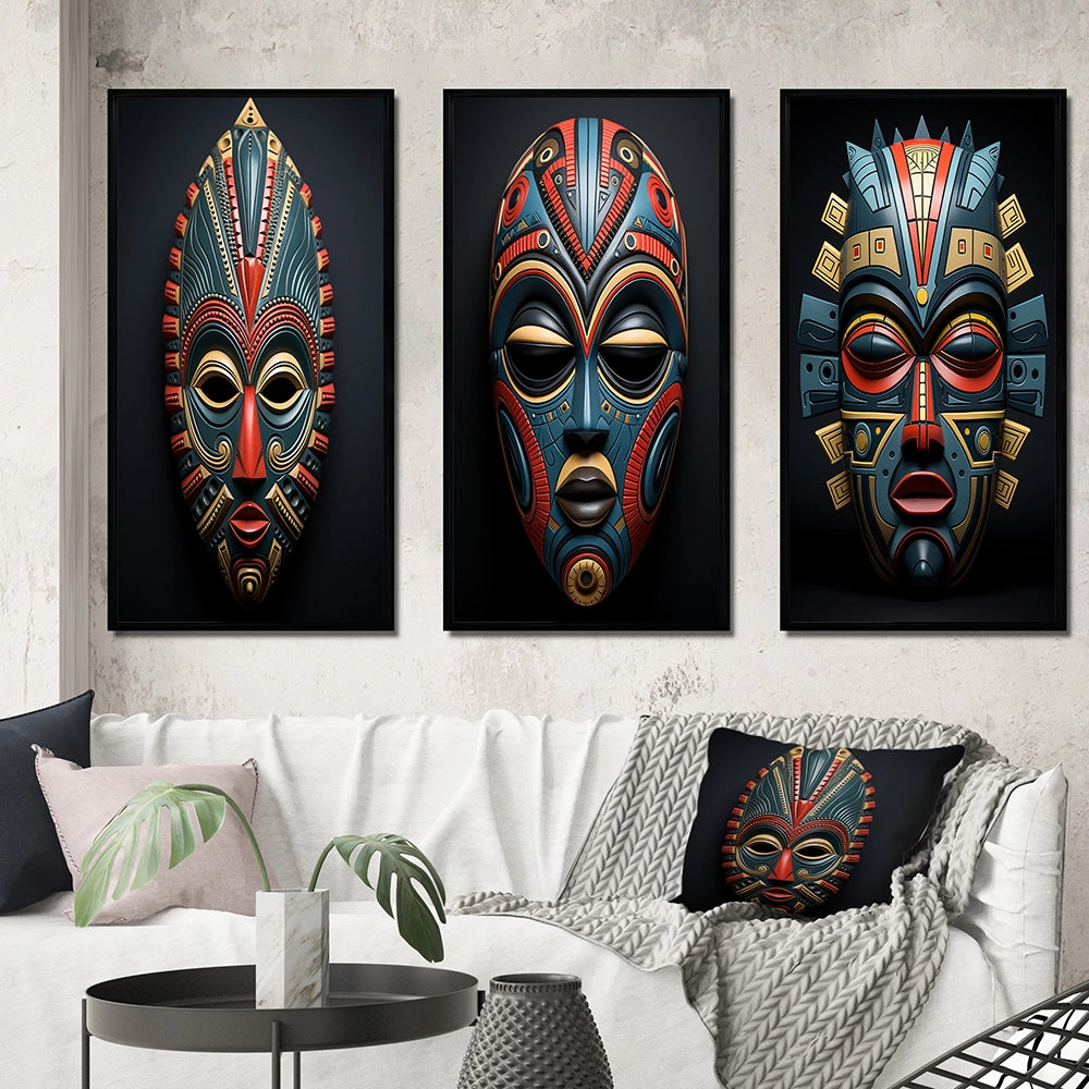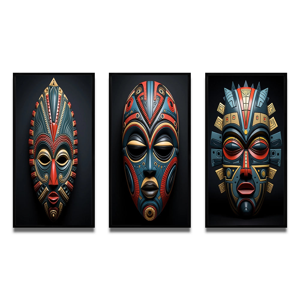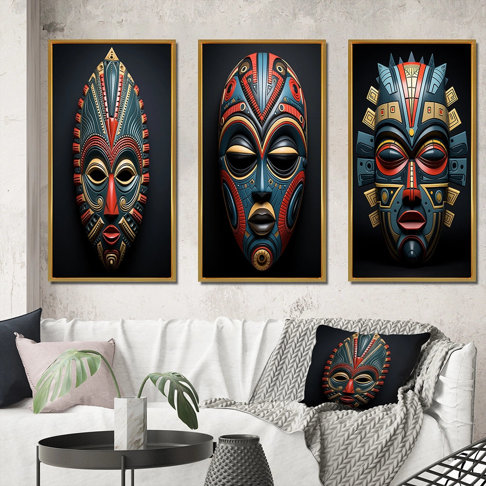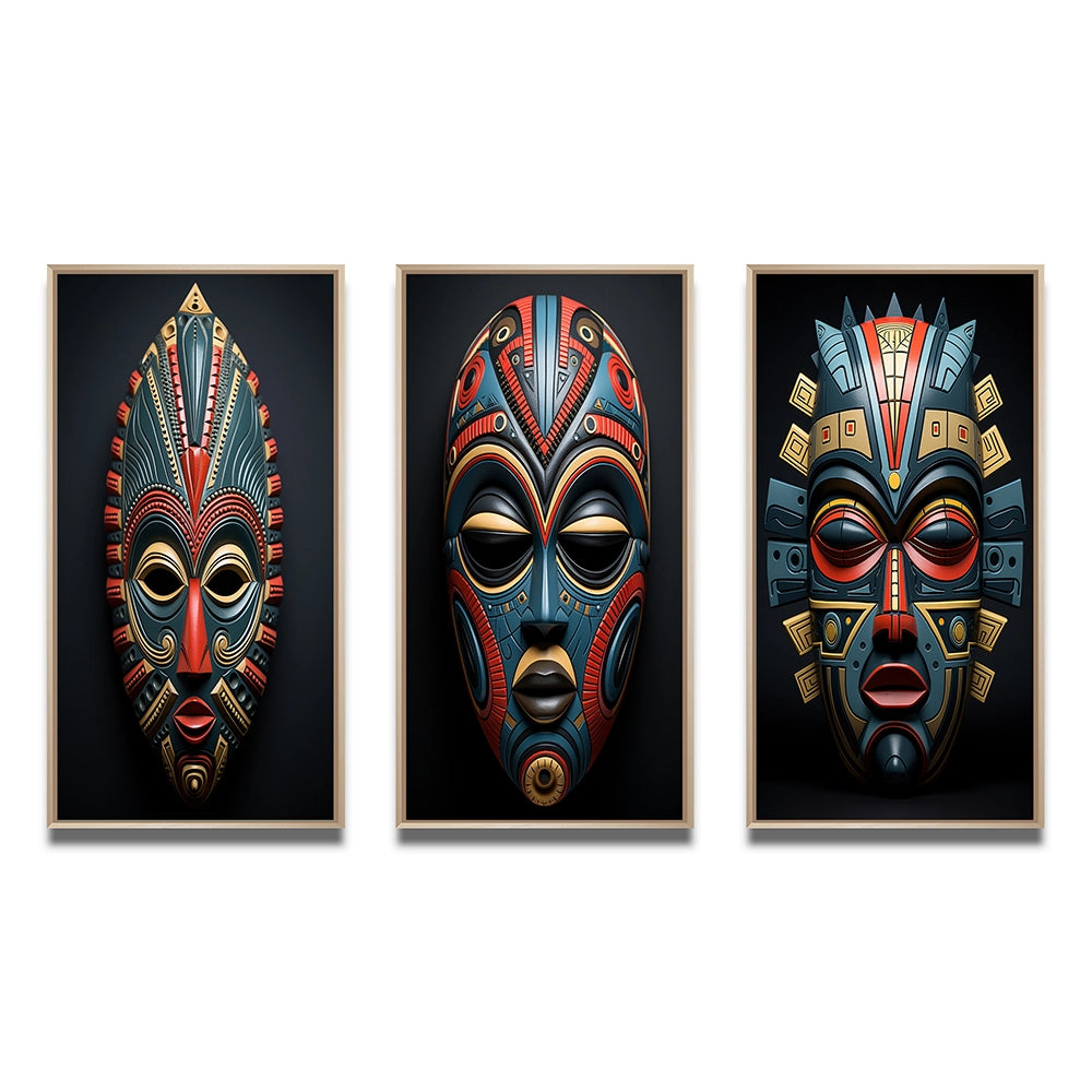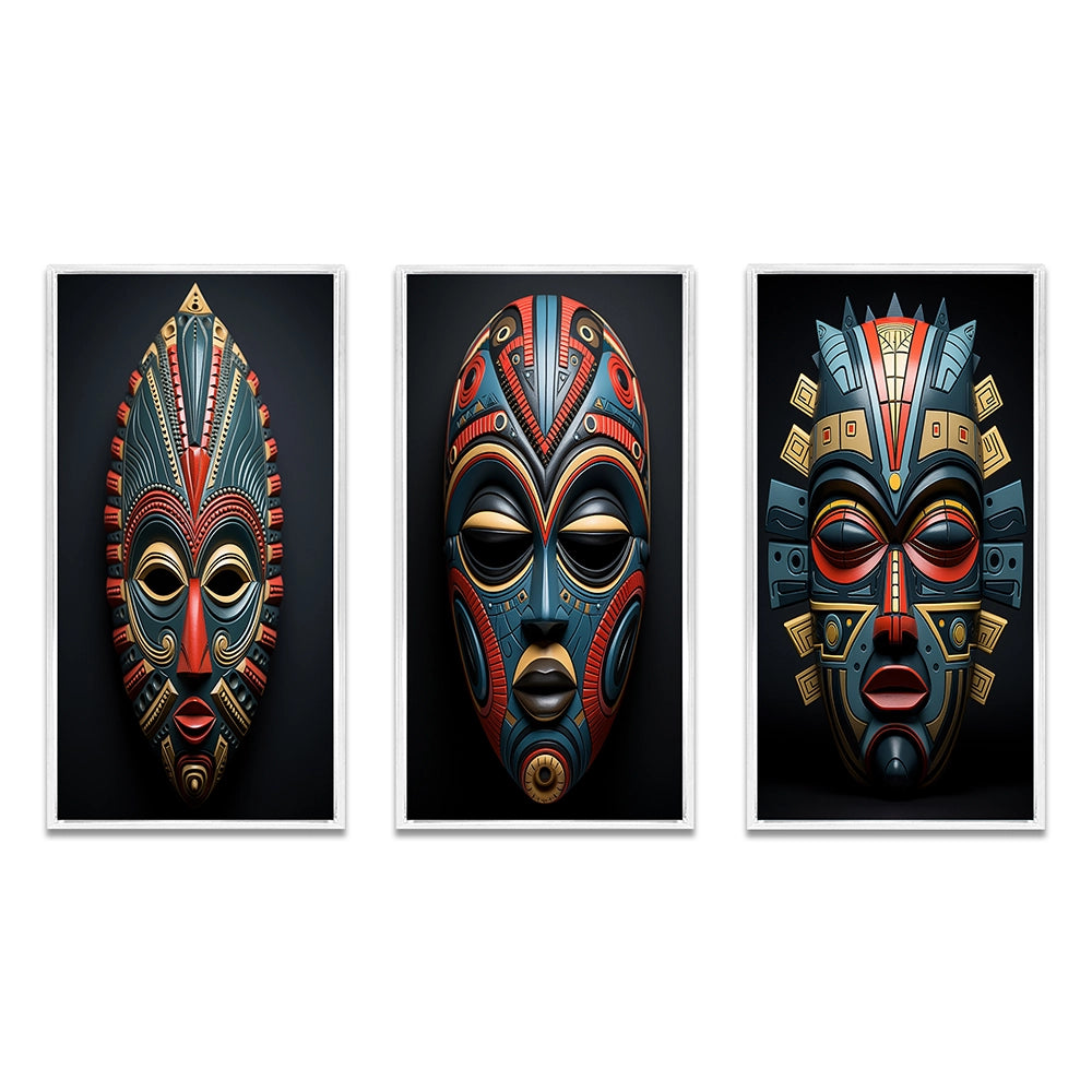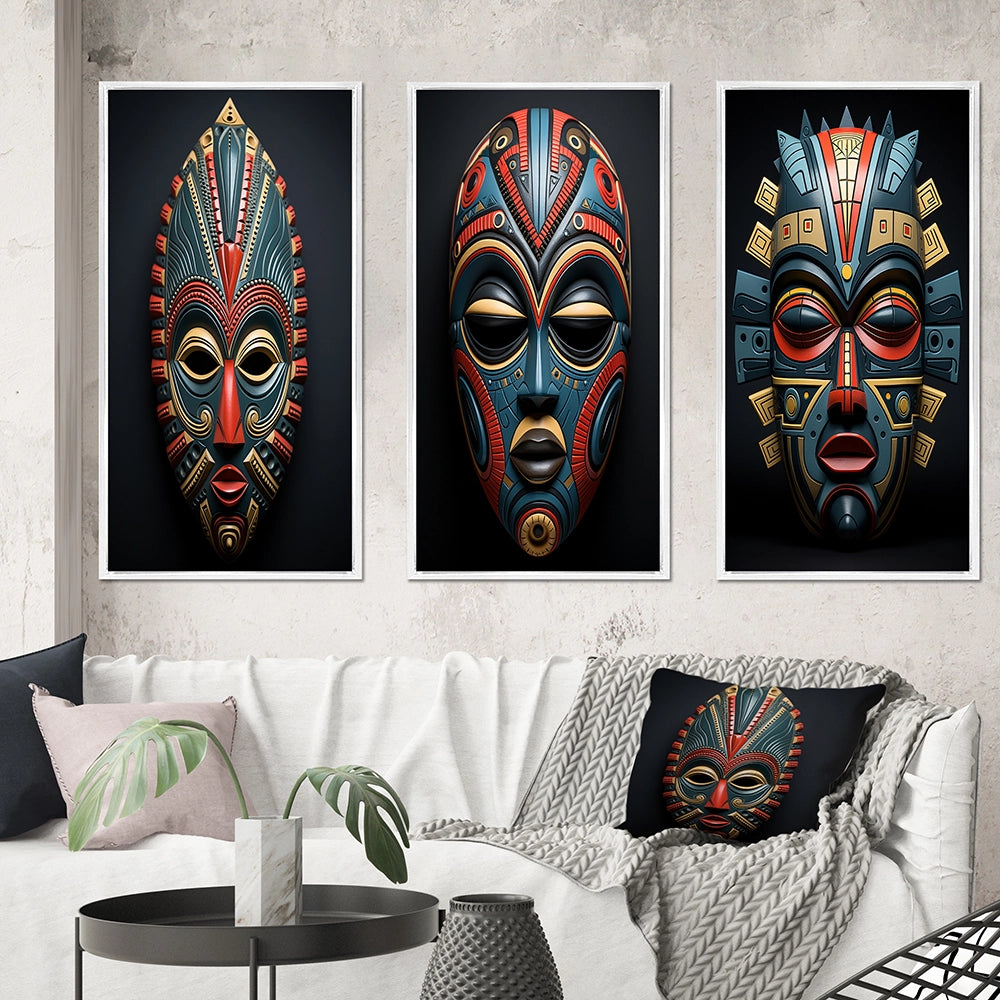 This beautiful African Tribal Pende Mask Collage Set of 3 Wall art is printed on premium quality cotton canvas using the finest fade-resistant ink. With options like Wrapped Canvas and Floater Framed Wall Decor, we offer a versatile range to cater to your unique aesthetic preferences. The Wrapped Canvas Art is stretched tautly over a sturdy wooden frame, giving your artwork a sleek, borderless appearance. For those who desire a touch of elegance and depth, our floater-framed canvas art is the ideal choice. The Canvas set is delicately mounted within a floating frame, creating a striking visual contrast between the artwork and the frame. Our collection offers an array of frame colors to complement your interior design, Ensuring that your wall art set seamlessly integrates with your home or office decor.