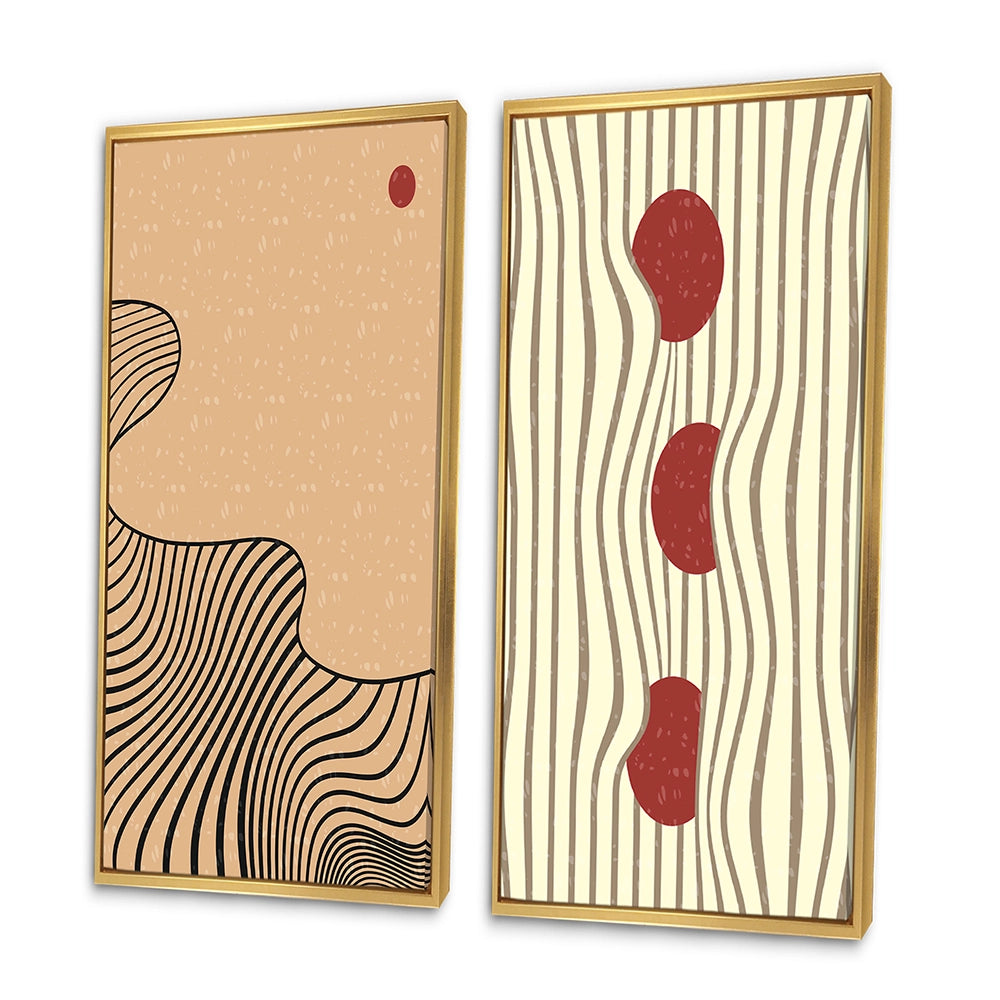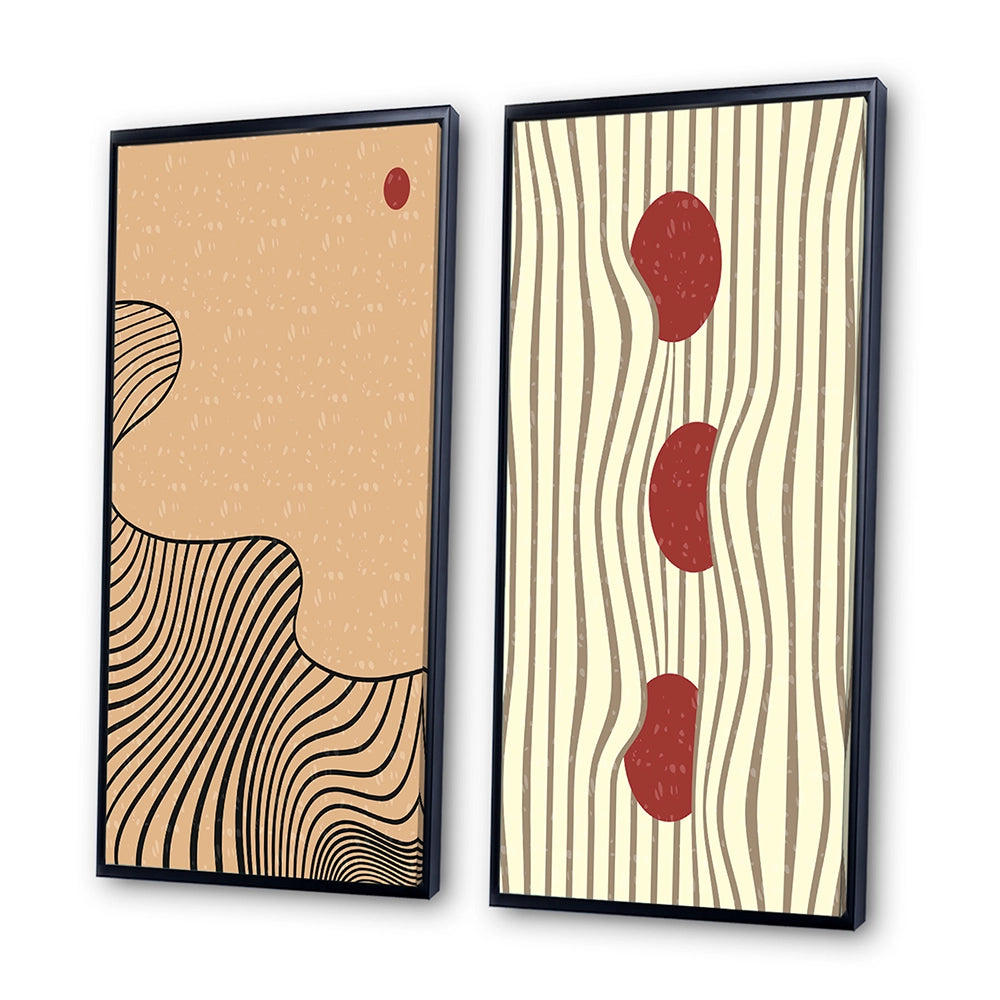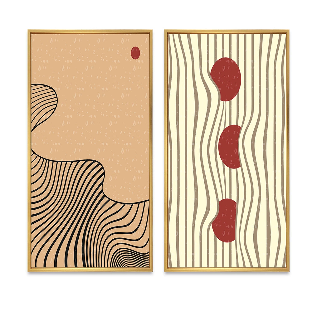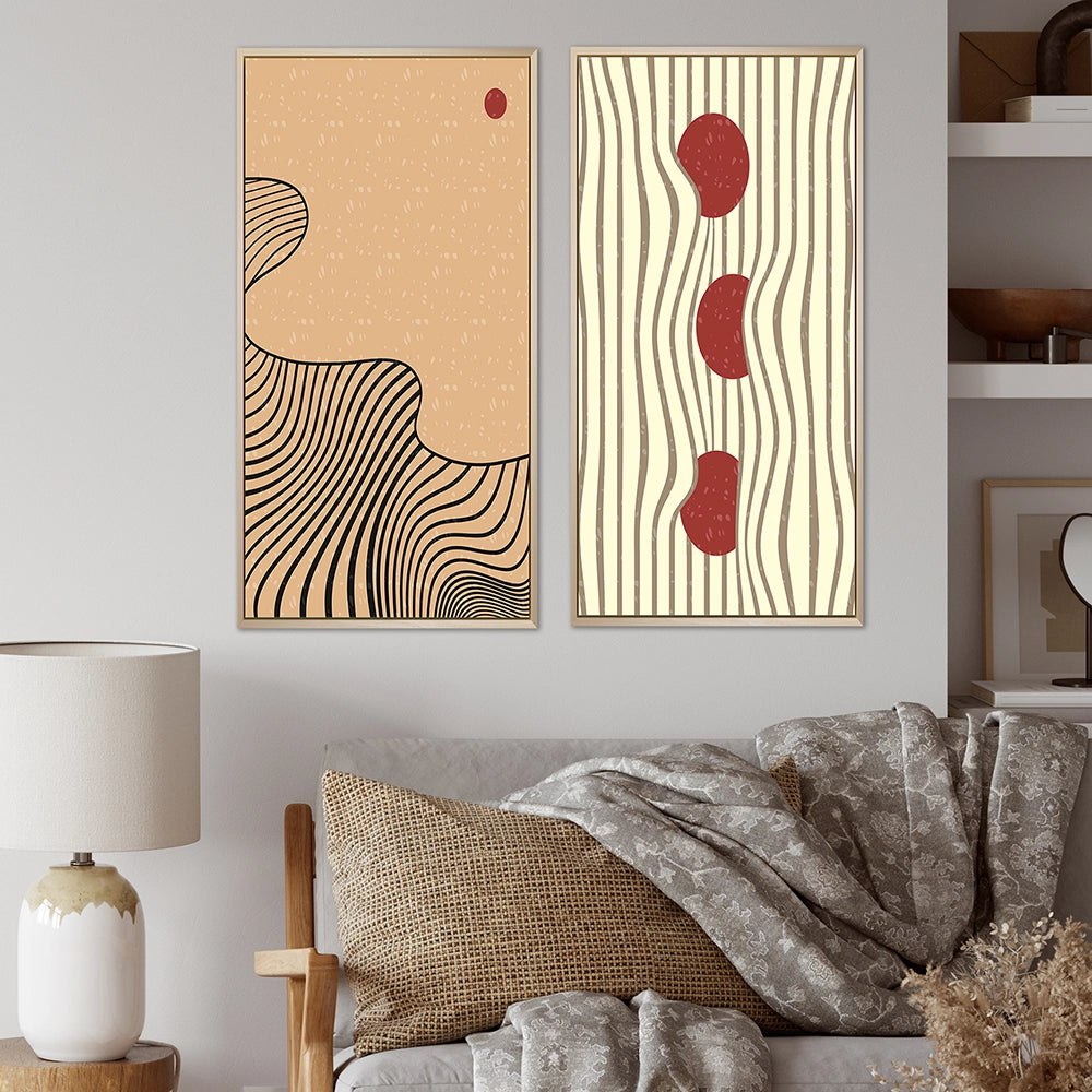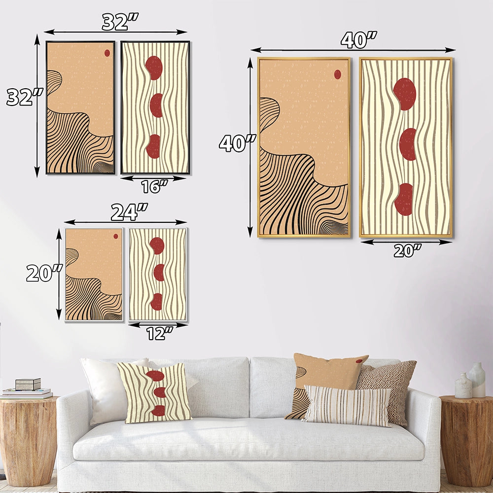 This beautiful Retro Japanese Minimal Geometric Typography II Collage Set of 2 Wall art is printed on premium quality cotton canvas using the finest fade-resistant ink. With options like Wrapped Canvas and Floater Framed Wall Decor, we offer a versatile range to cater to your unique aesthetic preferences. The Wrapped Canvas Art is stretched tautly over a sturdy wooden frame, giving your artwork a sleek, borderless appearance. For those who desire a touch of elegance and depth, our floater-framed canvas art is the ideal choice. The Canvas set is delicately mounted within a floating frame, creating a striking visual contrast between the artwork and the frame. Our collection offers an array of frame colors to complement your interior design, Ensuring that your wall art set seamlessly integrates with your home or office decor.