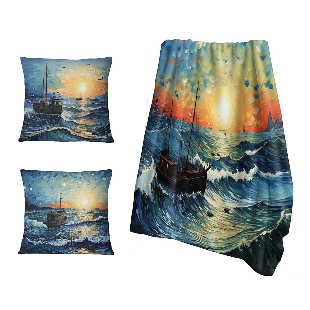 Vangogh Seascape With Fishing IV - Vangogh Throw Blanket and Pillow Set