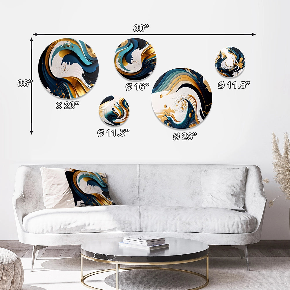 Modern Shapes Transitional Metal Wall Art - Blue And Gold Modern Art Absract Painting - 5 Pieces