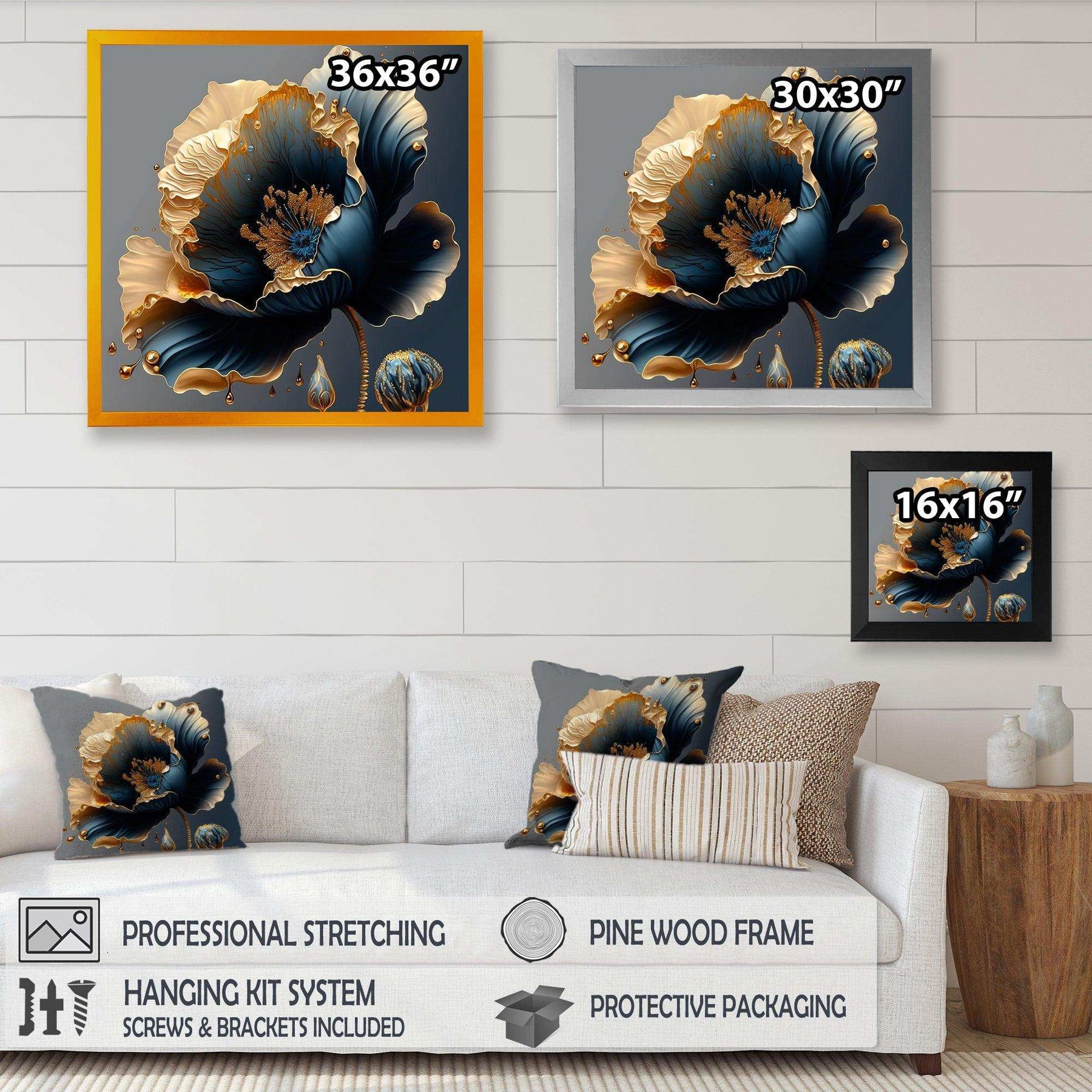 This beautiful Deep Blue And Gold Single Flower IV Canvas Art is printed using the highest quality fade-resistant ink on canvas. Every one of our fine art giclee canvas prints is printed on premium quality cotton canvas, using the finest quality inks which will not fade over time. Each giclee print is stretched tightly over a 1-inch wood sub frame for small size prints or a 1.5-inch wood subframe for large size prints ensuring the canvas is taught and does not buckle. This canvas art print is gallery-wrapped (the design continues on the sides), giving it a real art gallery feel. All of our canvas prints are carefully packaged with plastic protection, fragile labeling, and sturdy boxes to ensure safe delivery. Every canvas print arrives ready to hang on the wall, with the hanging kits included.