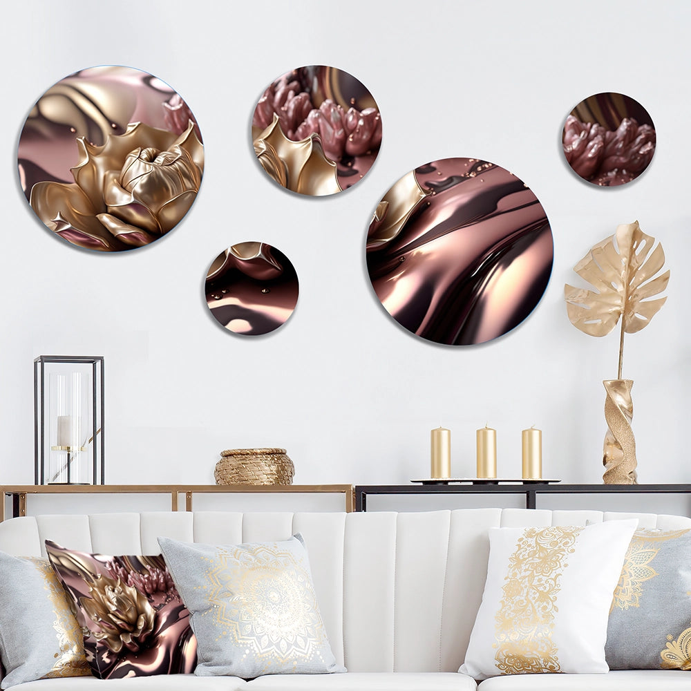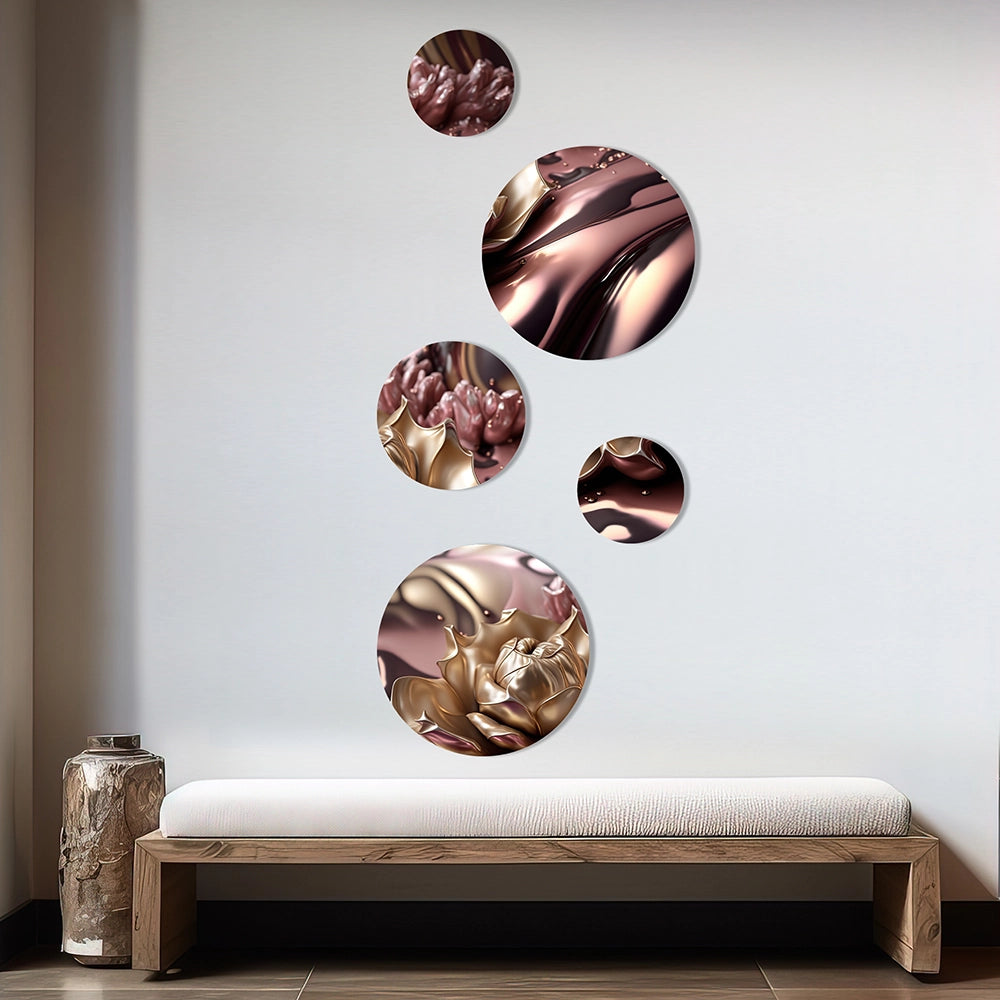 Bring Contemporary Abstraction to your home with this circle metal wall art set of 5 Pieces. This Pink And Gold Glam Flowers V metal artwork makes it the focal point of any room or office.