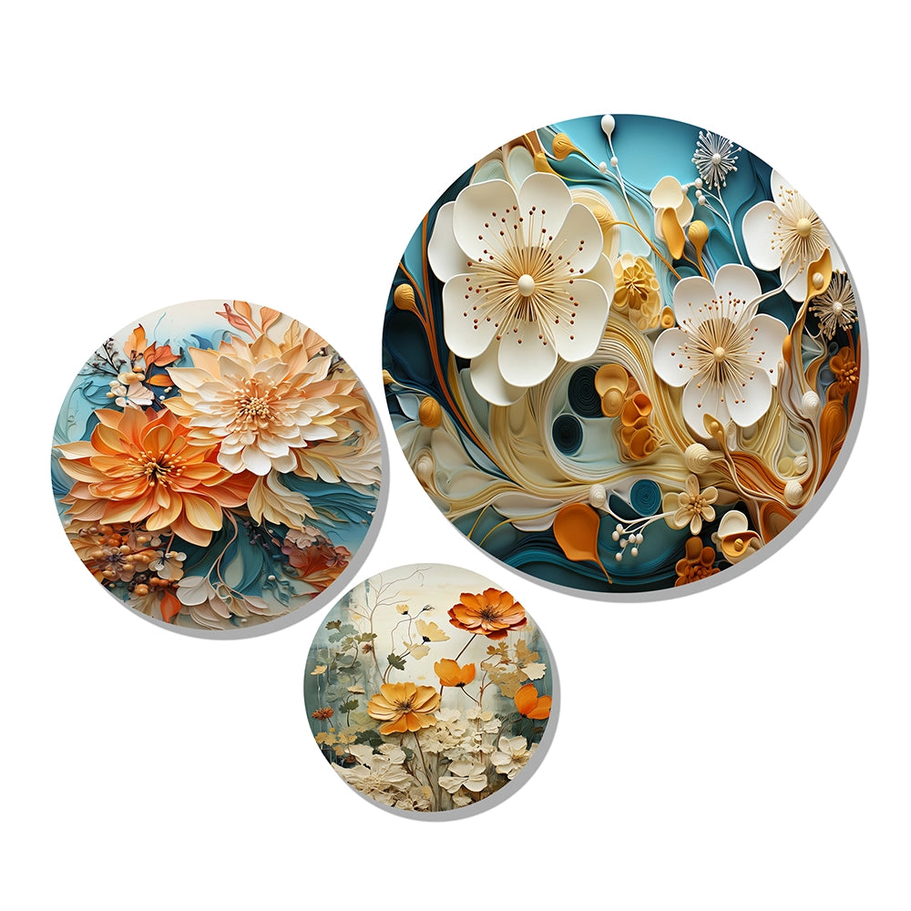 Modern Metal Wall Art Set - Orange White and Teal Botanical Whirlwind I - 3 Pieces
