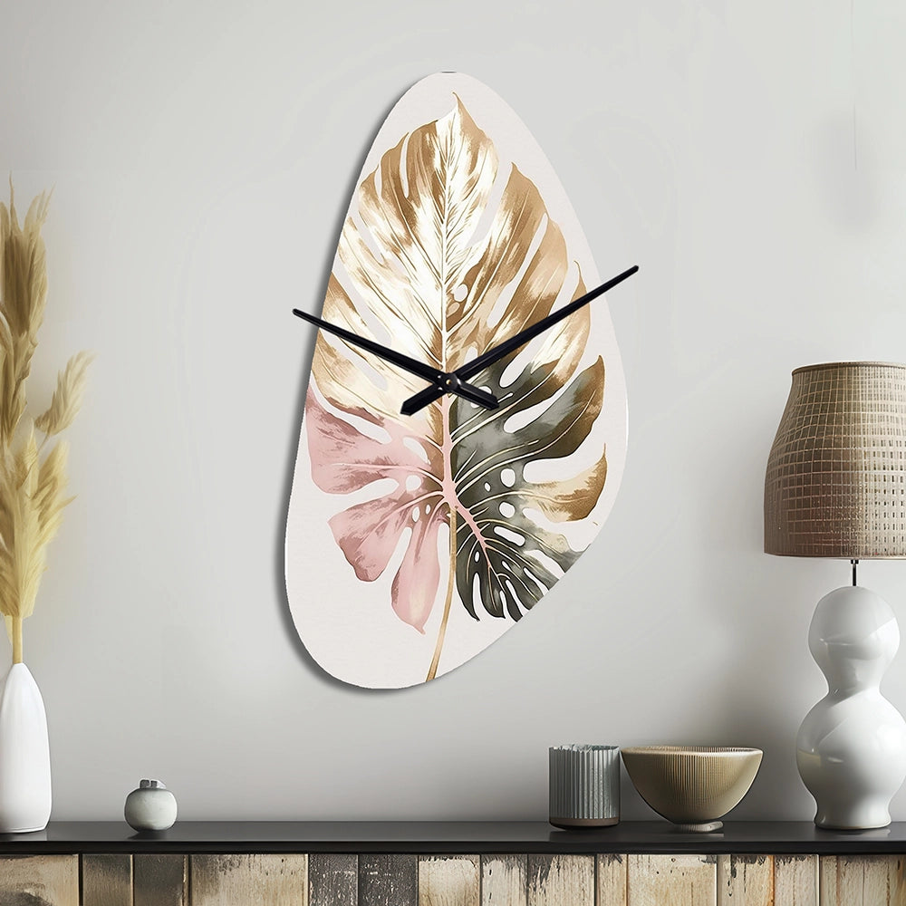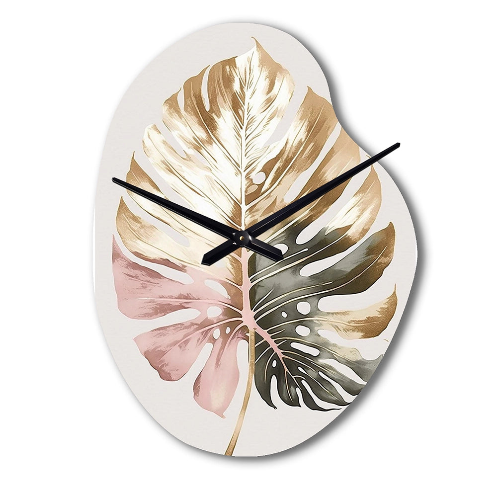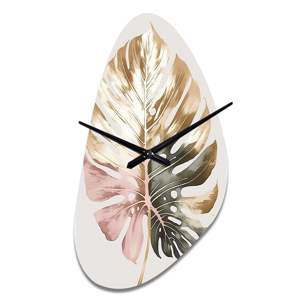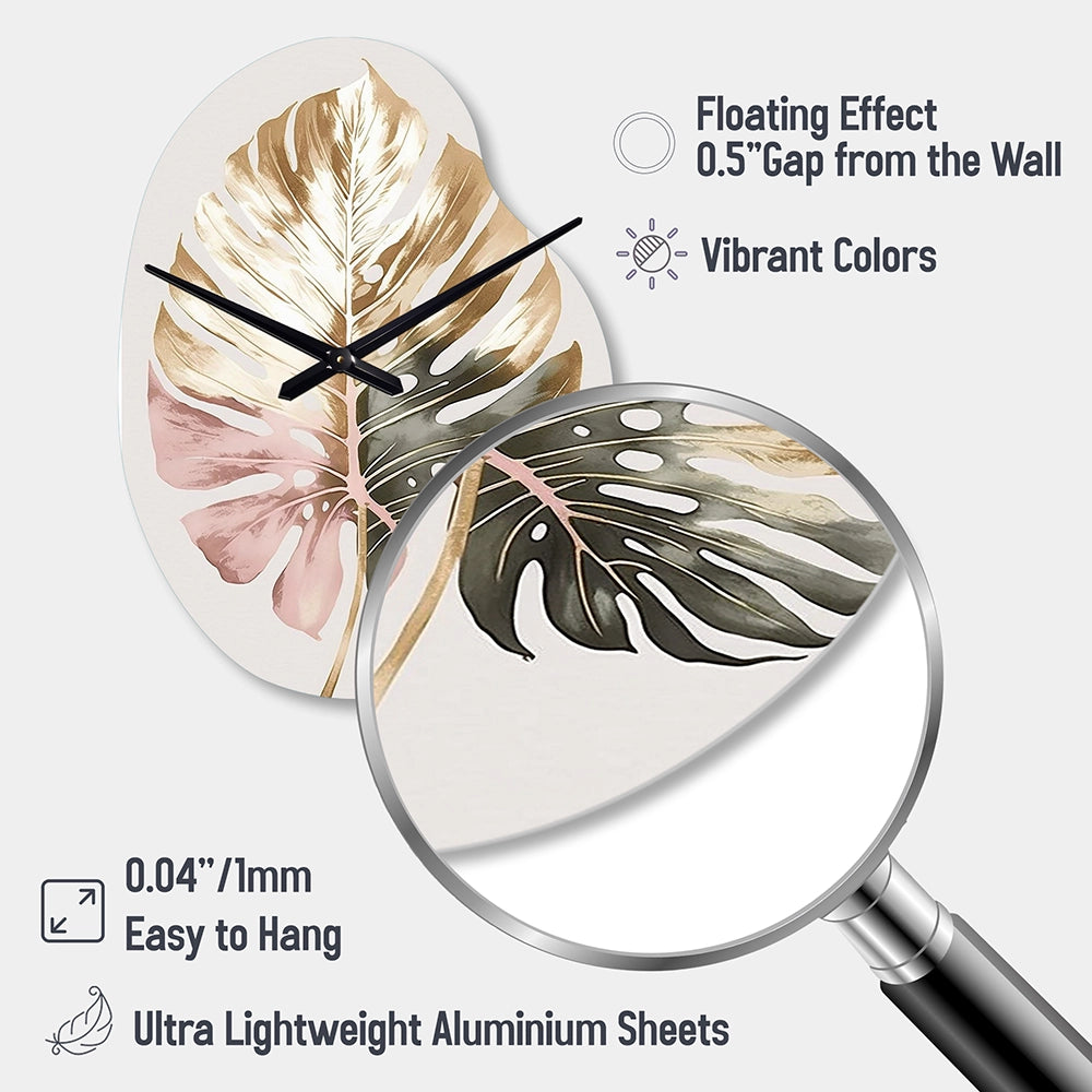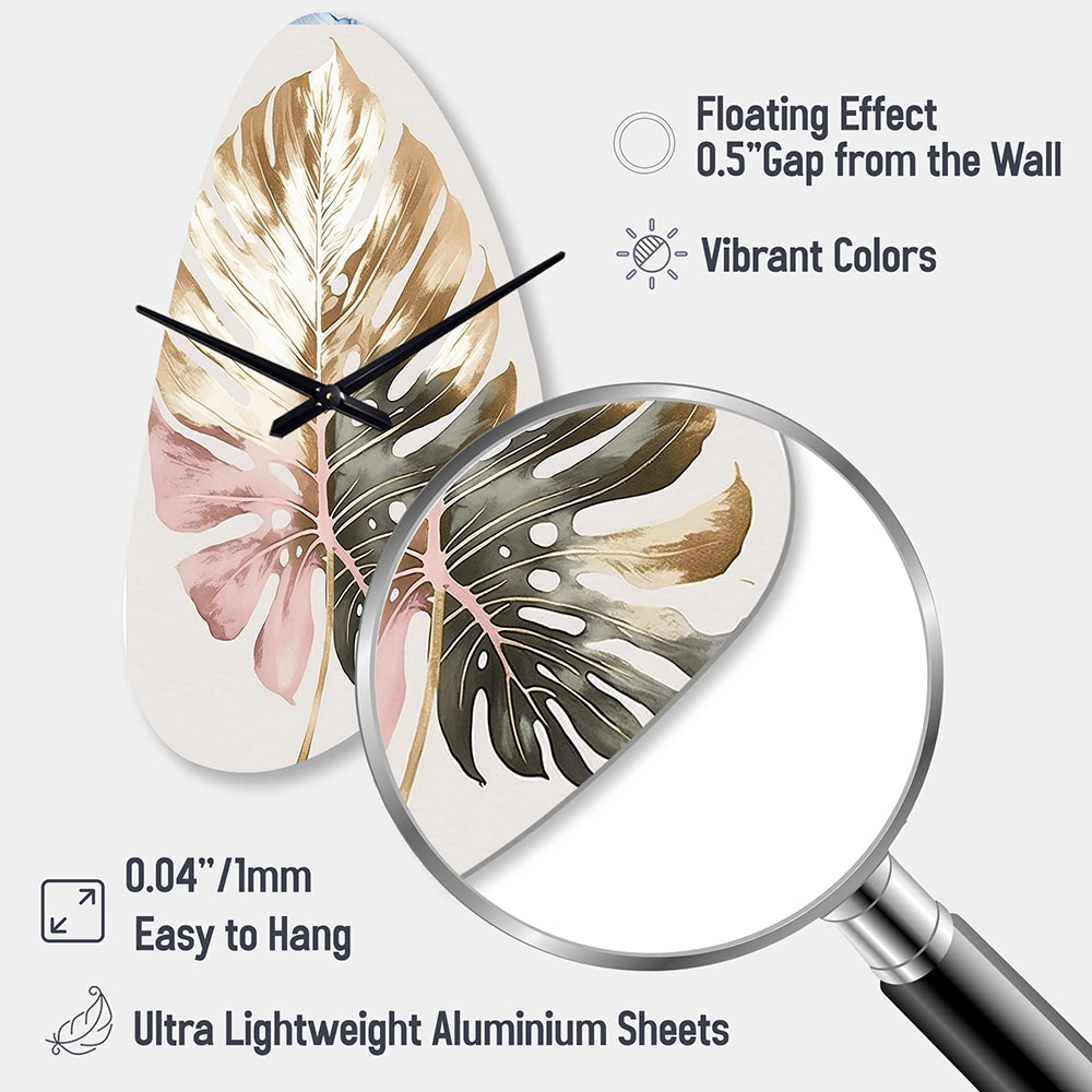 Gold And White Philodendron Leaf II - Asymmetric Metal Wall Clock