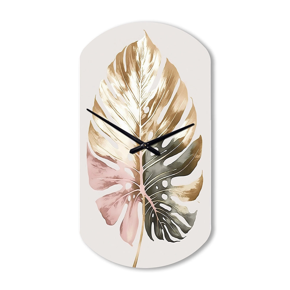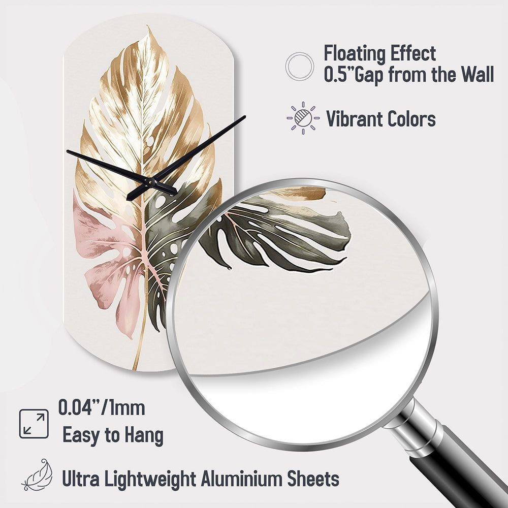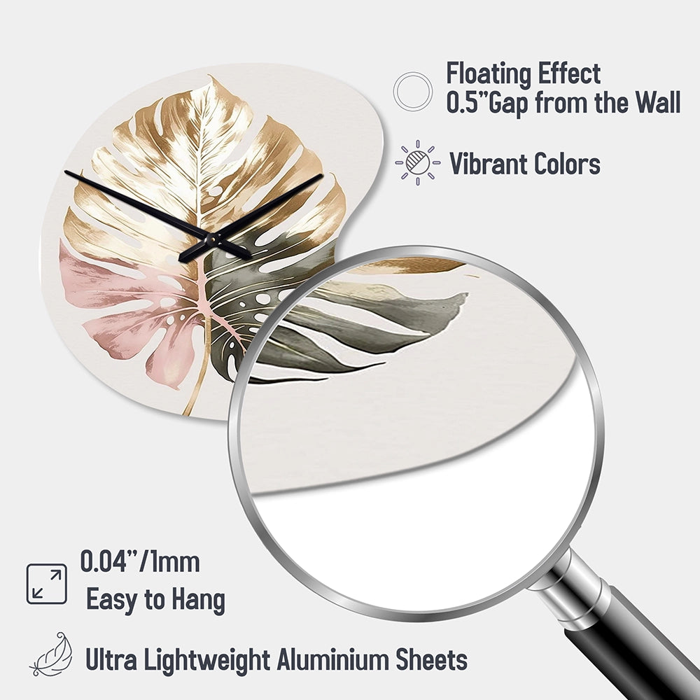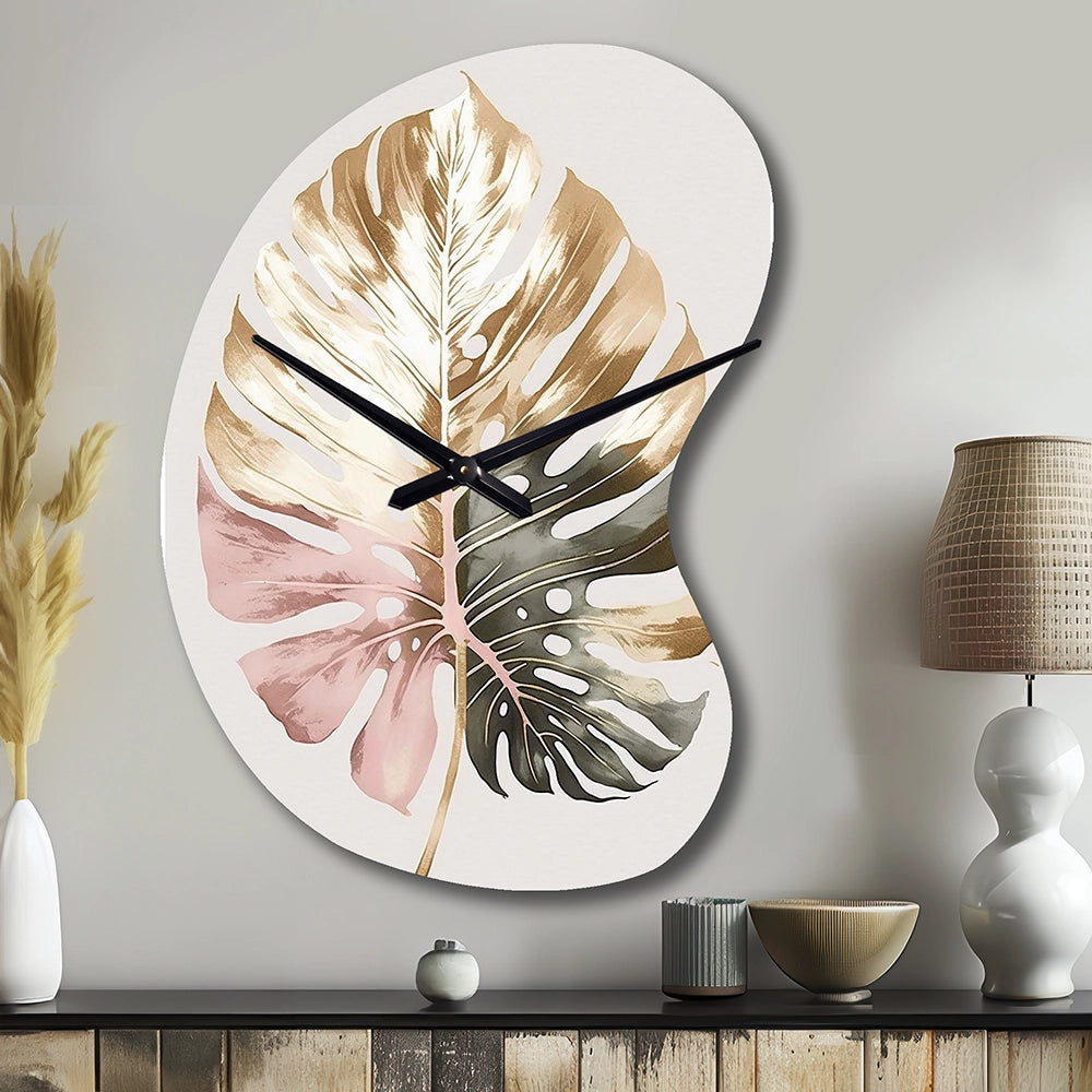 Gold And White Philodendron Leaf II - Asymmetric Metal Wall Clock