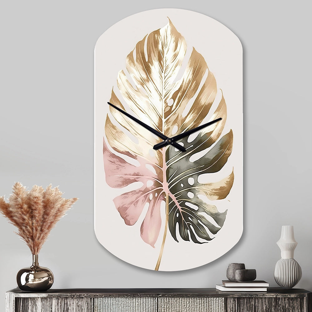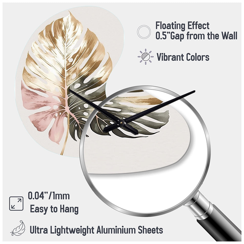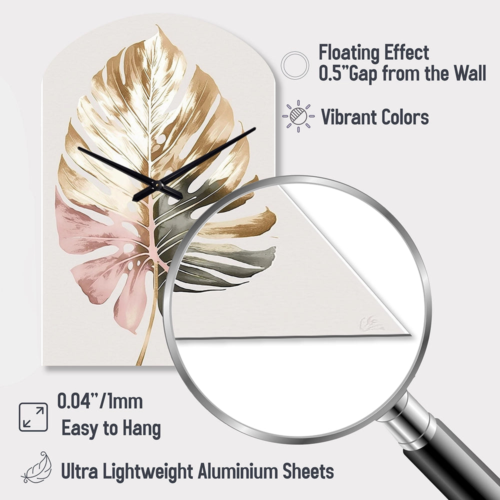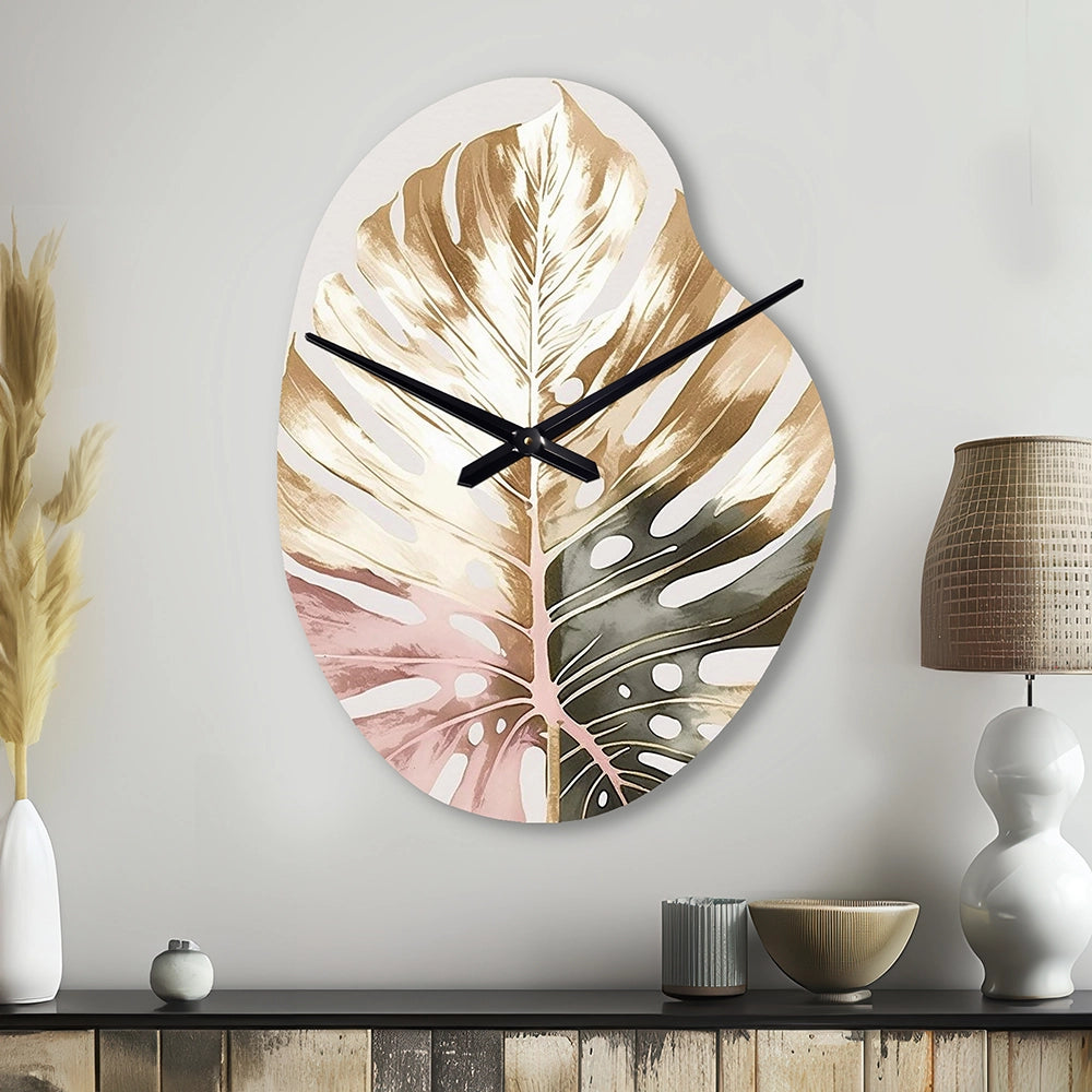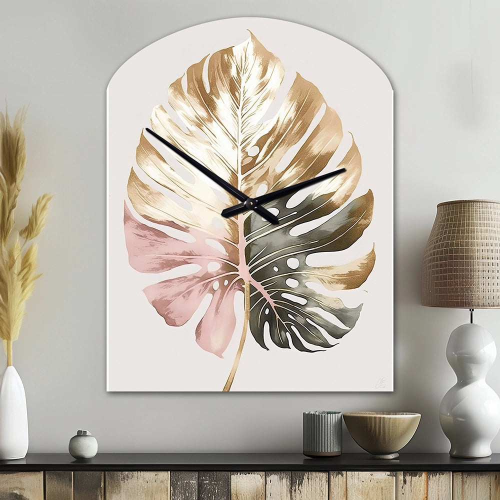 Gold And White Philodendron Leaf II - Asymmetric Metal Wall Clock