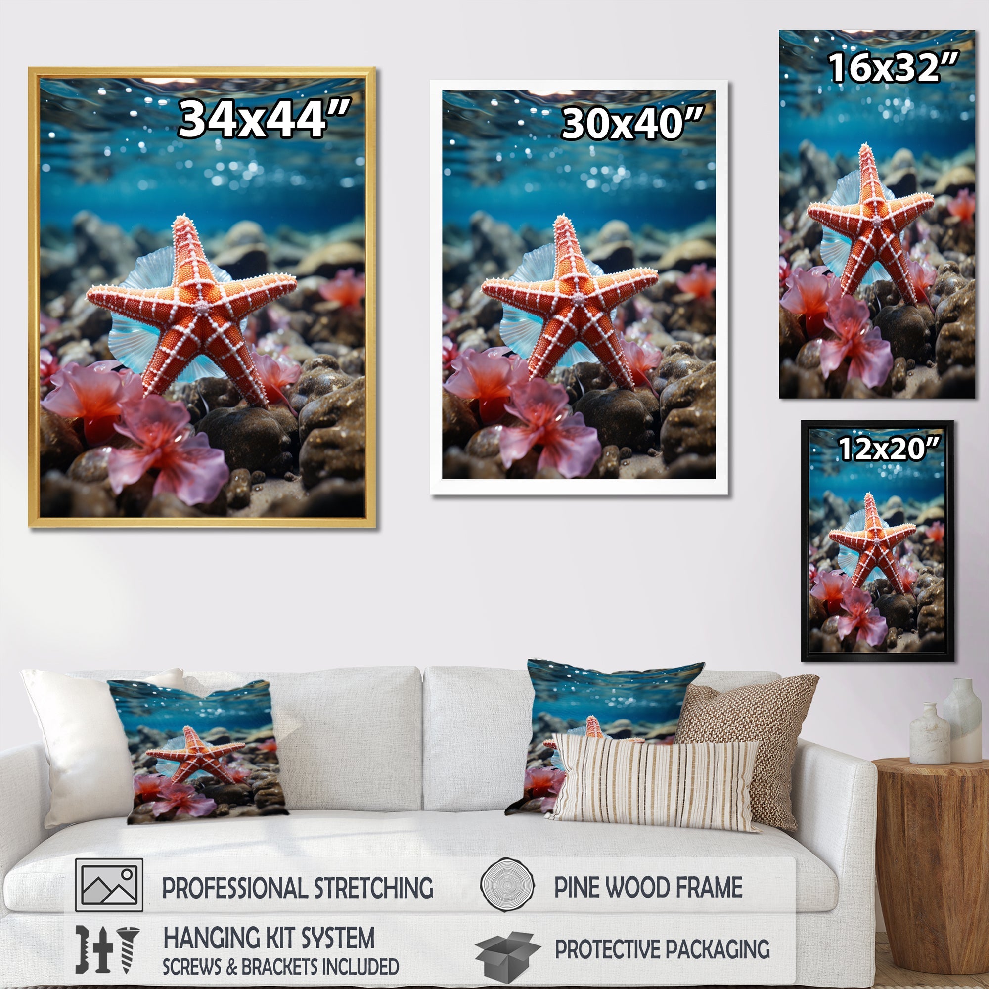 This beautiful Coral Teal Starfish Canvas Art is printed using the highest quality fade-resistant ink on canvas. Every one of our fine art giclee canvas prints is printed on premium quality cotton canvas, using the finest quality inks which will not fade over time. Each giclee print is stretched tightly over a 1-inch wood sub frame for small size prints or a 1.5-inch wood subframe for large size prints ensuring the canvas is taught and does not buckle. This canvas art print is gallery-wrapped (the design continues on the sides), giving it a real art gallery feel. All of our canvas prints are carefully packaged with plastic protection, fragile labeling, and sturdy boxes to ensure safe delivery. Every canvas print arrives ready to hang on the wall, with the hanging kits included.