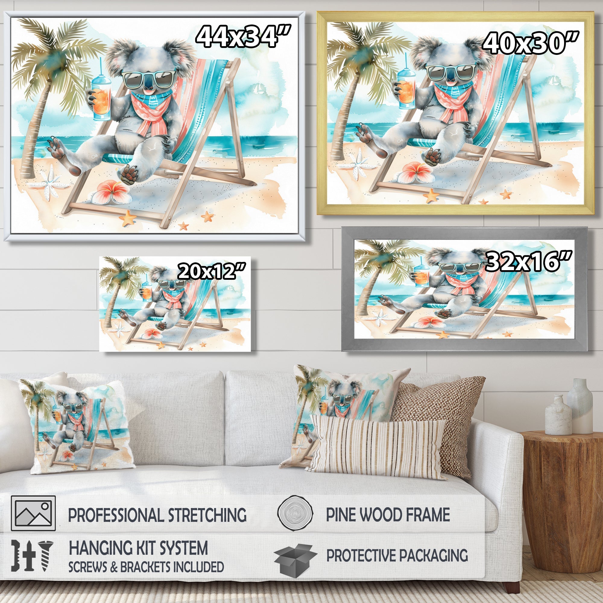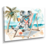 This beautiful Cute Koala Beach Relaxing Canvas Art is printed using the highest quality fade-resistant ink on canvas. Every one of our fine art giclee canvas prints is printed on premium quality cotton canvas, using the finest quality inks which will not fade over time. Each giclee print is stretched tightly over a 1-inch wood sub frame for small size prints or a 1.5-inch wood subframe for large size prints ensuring the canvas is taught and does not buckle. This canvas art print is gallery-wrapped (the design continues on the sides), giving it a real art gallery feel. All of our canvas prints are carefully packaged with plastic protection, fragile labeling, and sturdy boxes to ensure safe delivery. Every canvas print arrives ready to hang on the wall, with the hanging kits included.
