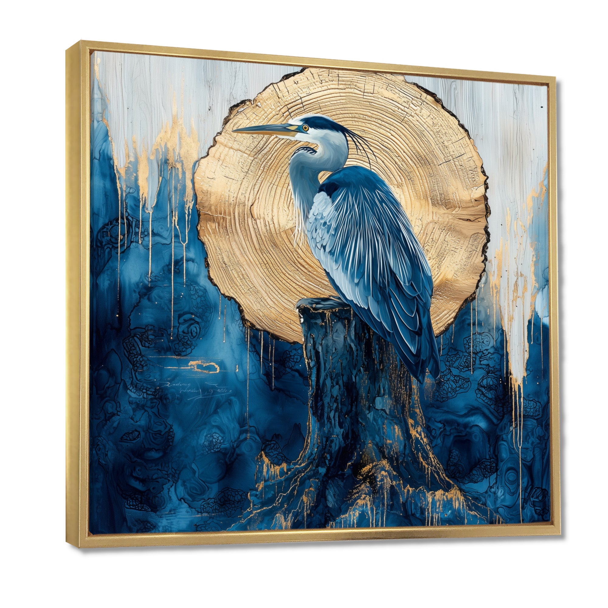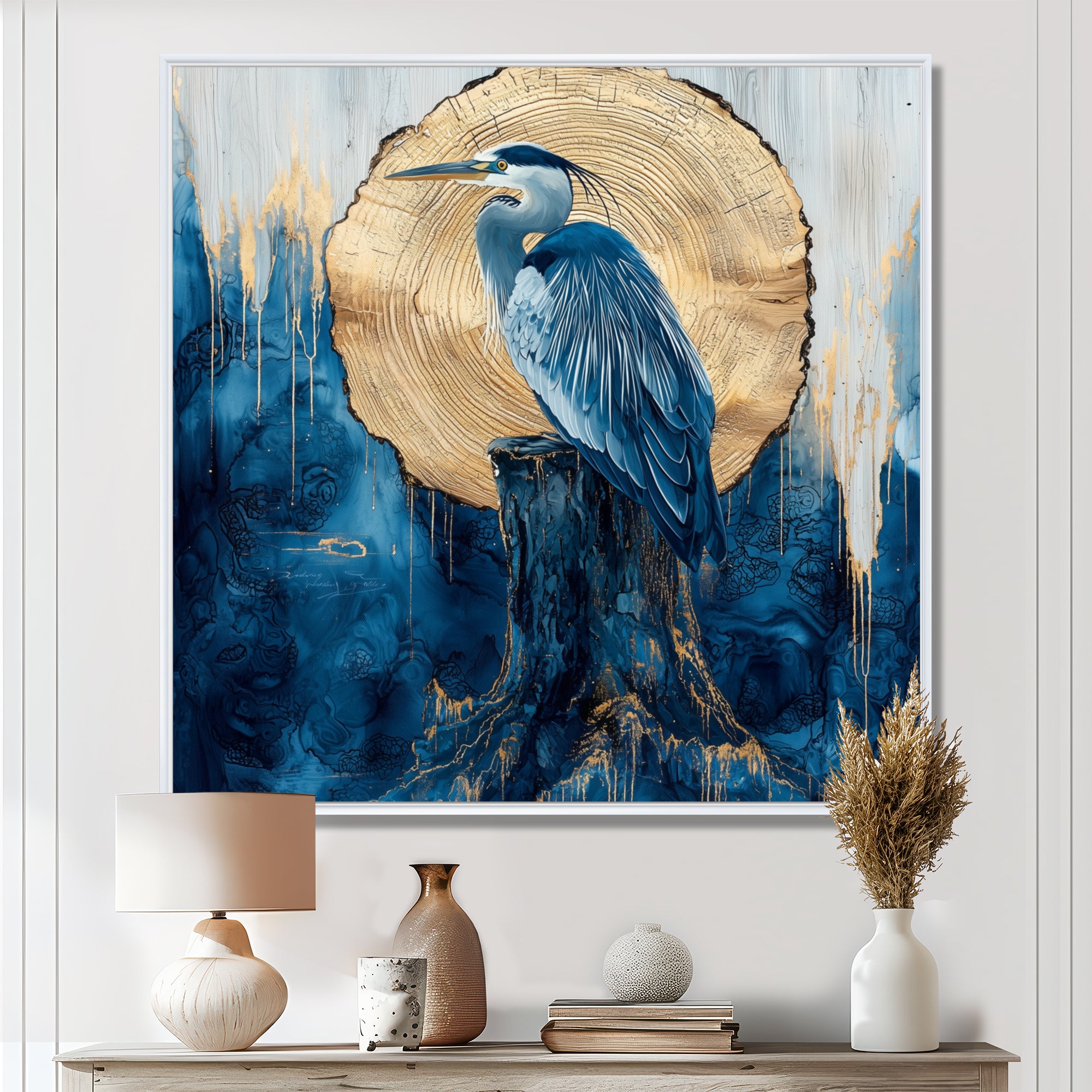 Heron In Golden Moon Chinese Ink Landscape - Heron Bedroom Wall Art
