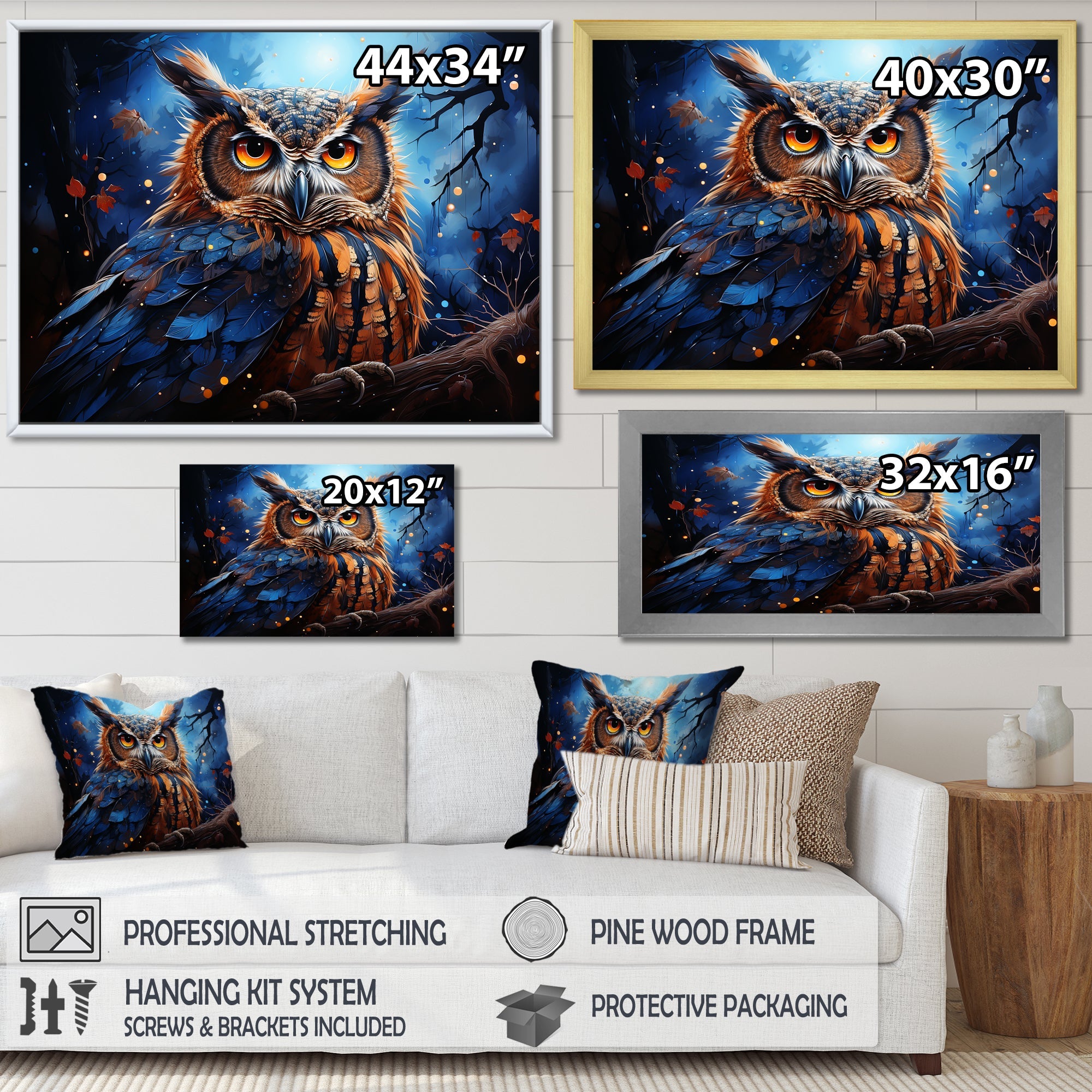 This beautiful Mystic Owl in the moonlight Canvas Art is printed using the highest quality fade-resistant ink on canvas. Every one of our fine art giclee canvas prints is printed on premium quality cotton canvas, using the finest quality inks which will not fade over time. Each giclee print is stretched tightly over a 1-inch wood sub frame for small size prints or a 1.5-inch wood subframe for large size prints ensuring the canvas is taught and does not buckle. This canvas art print is gallery-wrapped (the design continues on the sides), giving it a real art gallery feel. All of our canvas prints are carefully packaged with plastic protection, fragile labeling, and sturdy boxes to ensure safe delivery. Every canvas print arrives ready to hang on the wall, with the hanging kits included.