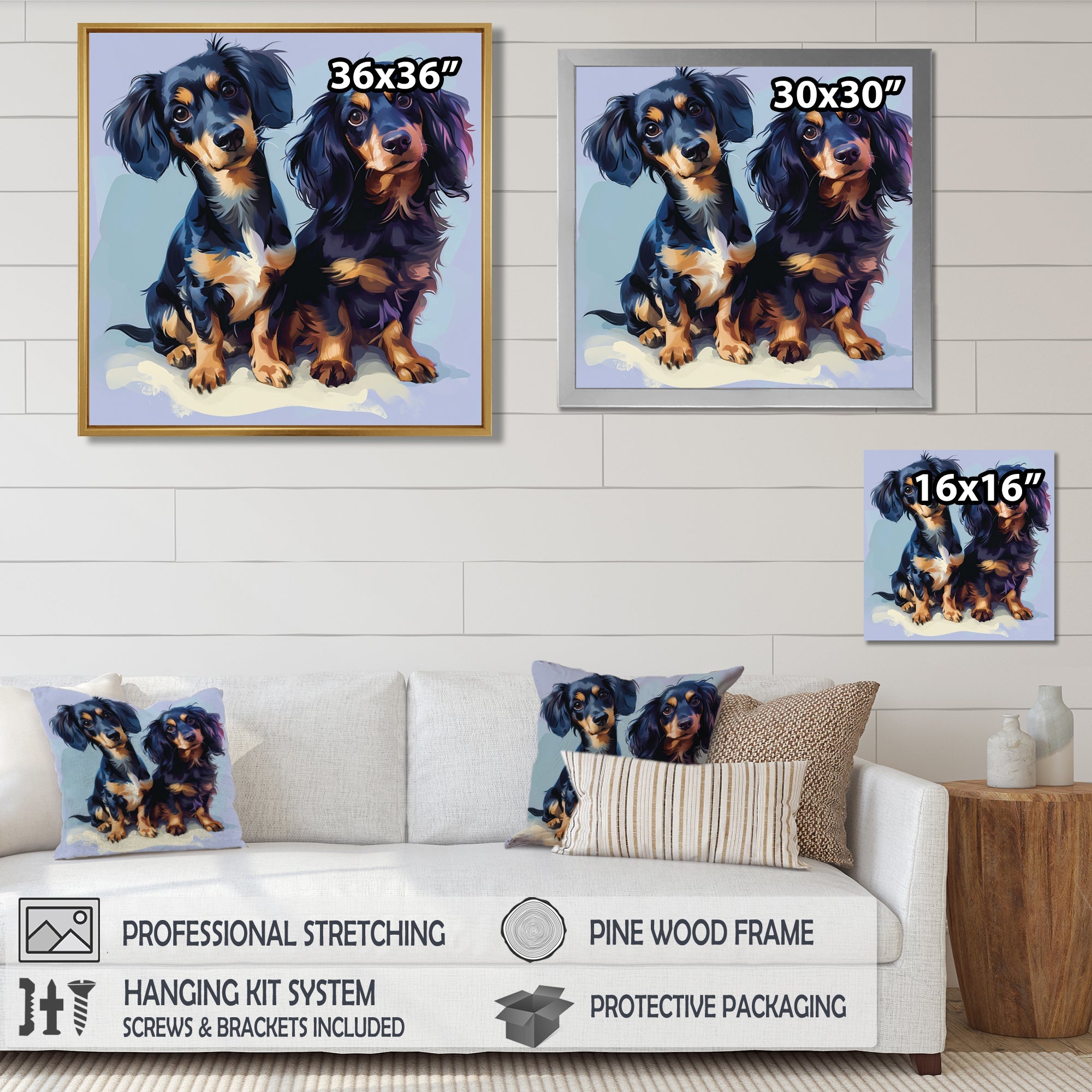 This beautiful Portrait Of Two Adorable Dachshunds Canvas Art is printed using the highest quality fade-resistant ink on canvas. Every one of our fine art giclee canvas prints is printed on premium quality cotton canvas, using the finest quality inks which will not fade over time. Each giclee print is stretched tightly over a 1-inch wood sub frame for small size prints or a 1.5-inch wood subframe for large size prints ensuring the canvas is taught and does not buckle. This canvas art print is gallery-wrapped (the design continues on the sides), giving it a real art gallery feel. All of our canvas prints are carefully packaged with plastic protection, fragile labeling, and sturdy boxes to ensure safe delivery. Every canvas print arrives ready to hang on the wall, with the hanging kits included.