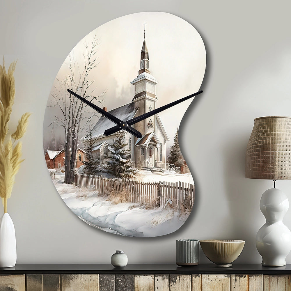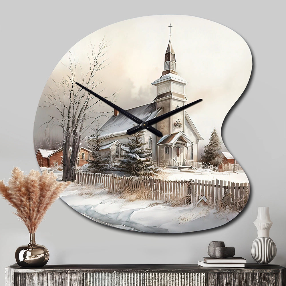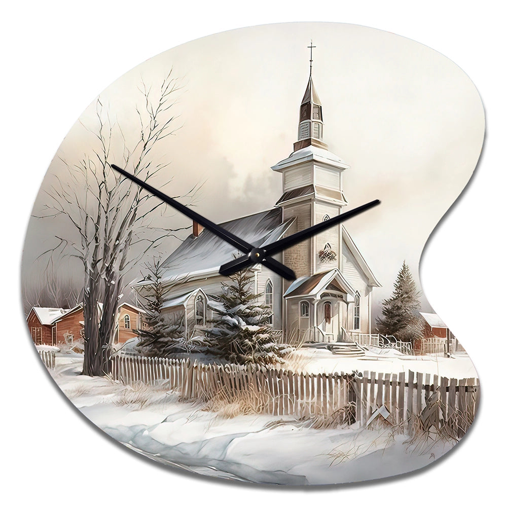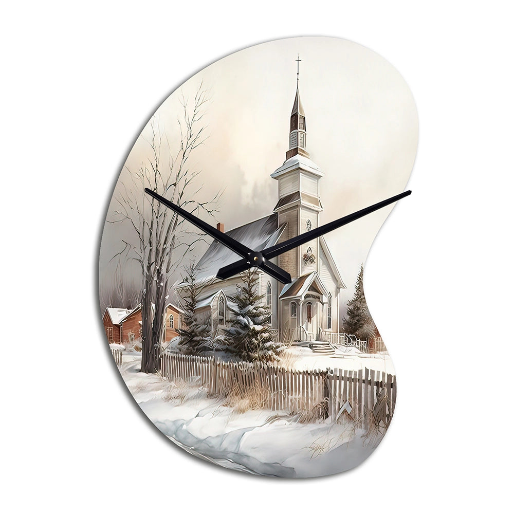 Church In Country During Winter IV - Asymmetric Metal Wall Clock