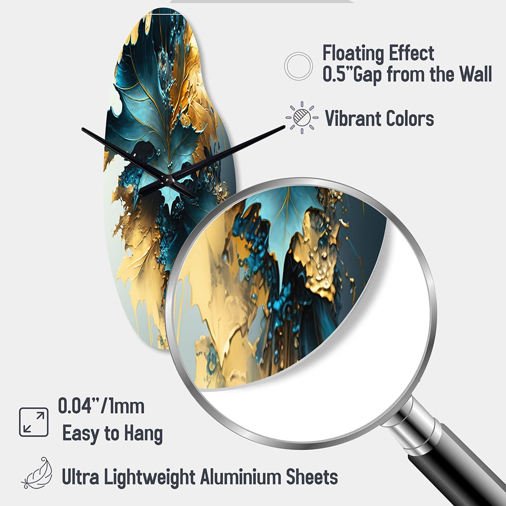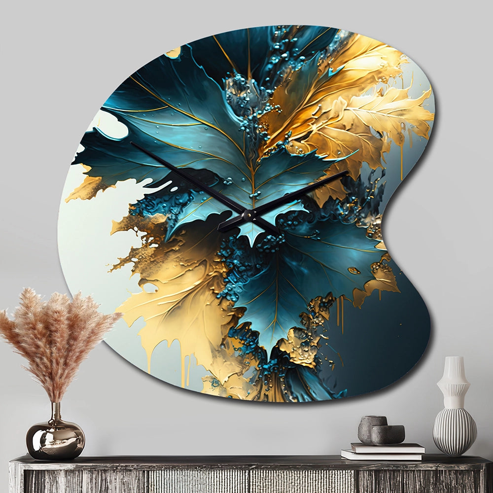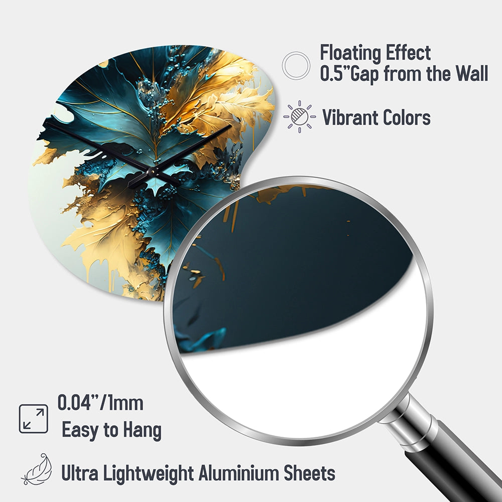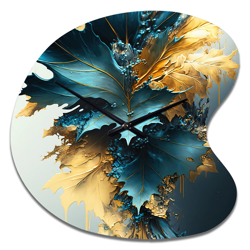 Abstract Blue And Gold Leaves II - Asymmetric Metal Wall Clock