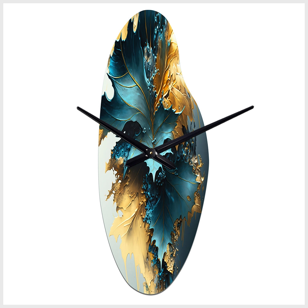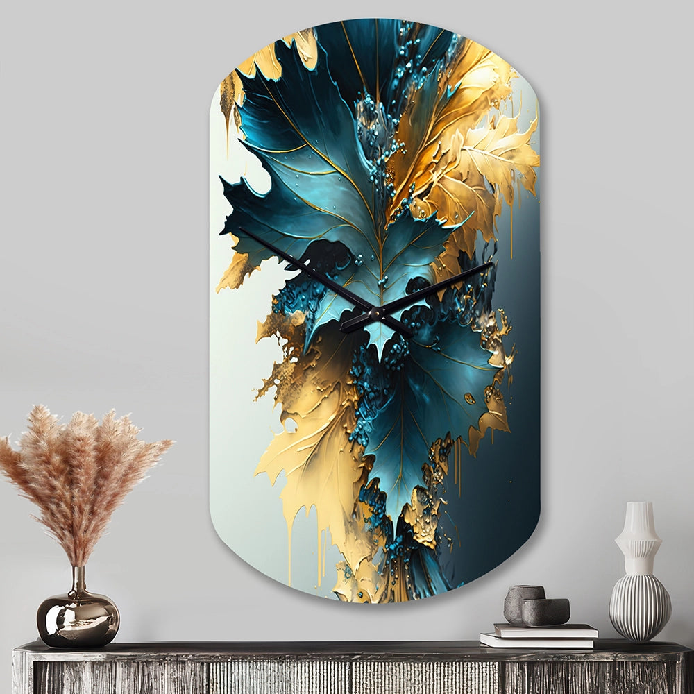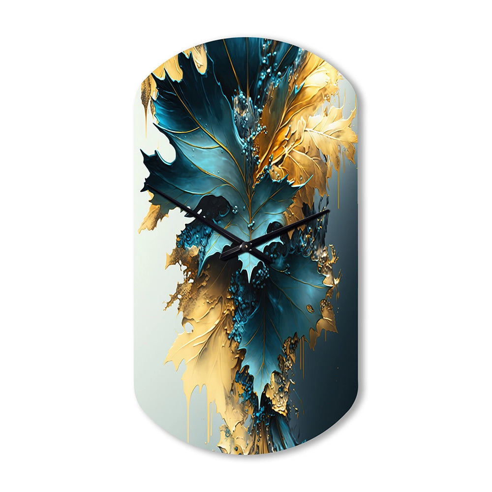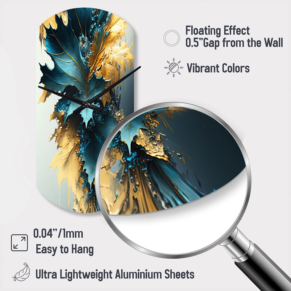 Abstract Blue And Gold Leaves II - Asymmetric Metal Wall Clock