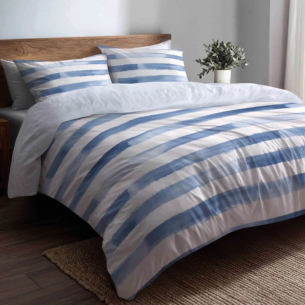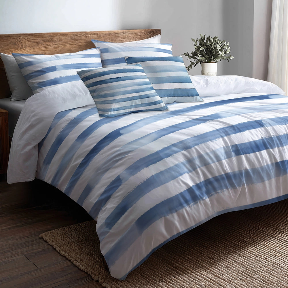 Modern Bedding Set of 5 - Blue And White Moonlit Stripes Duvet Cover And Throw Cushion Set