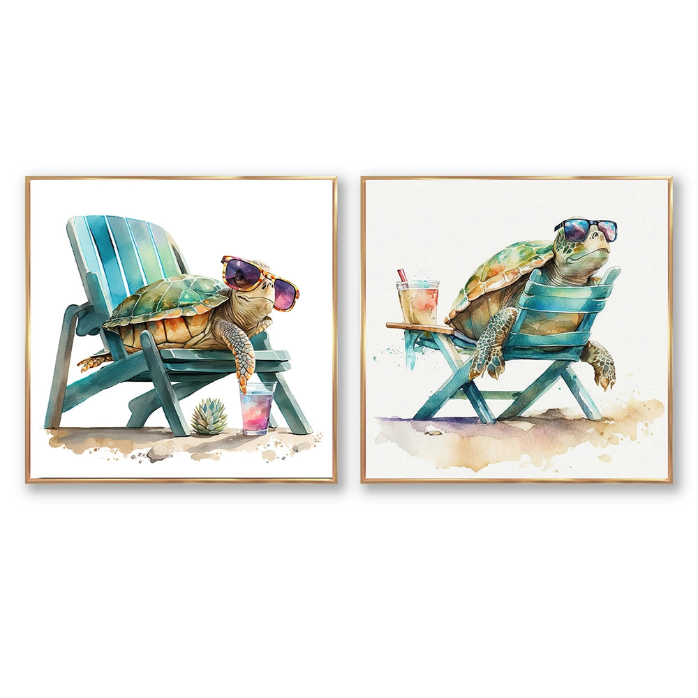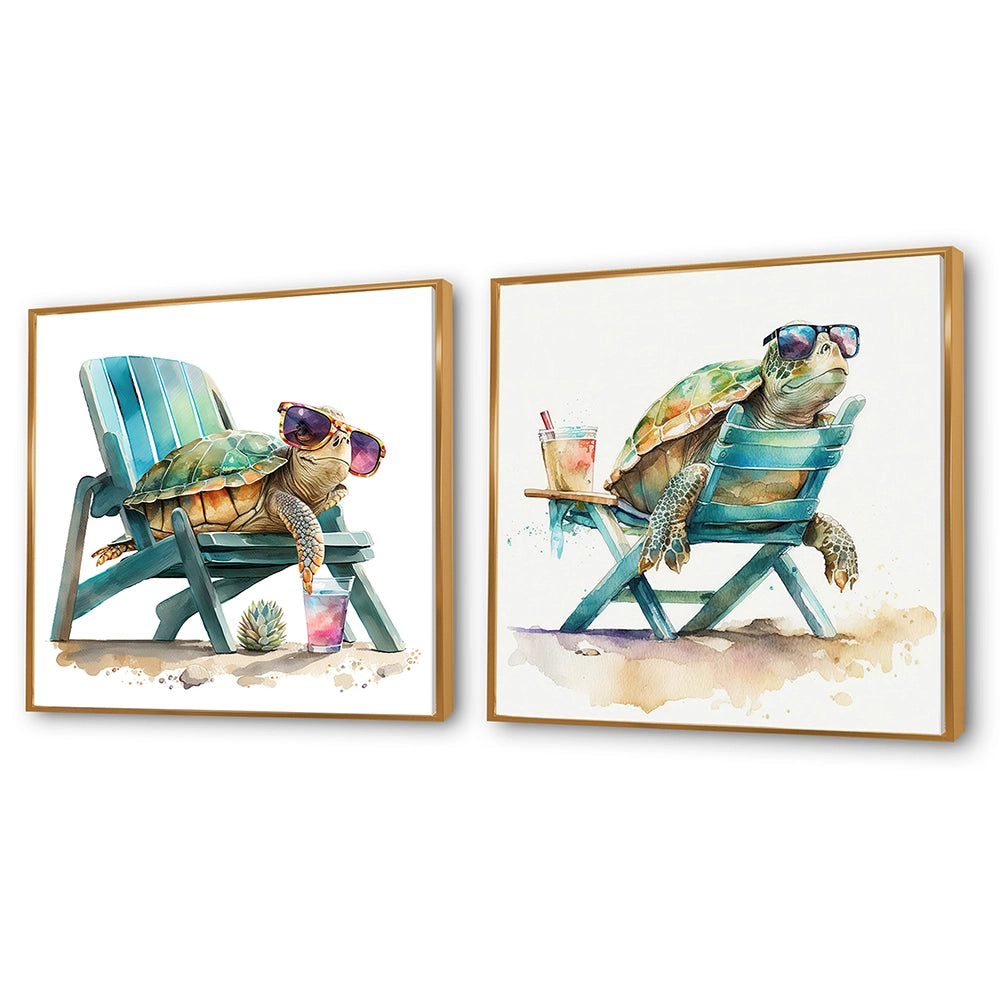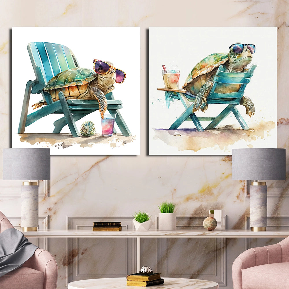 Traditional Wall Art Set - Turtle Laying On A Beach Chair With Sunglasses - 2 Pieces