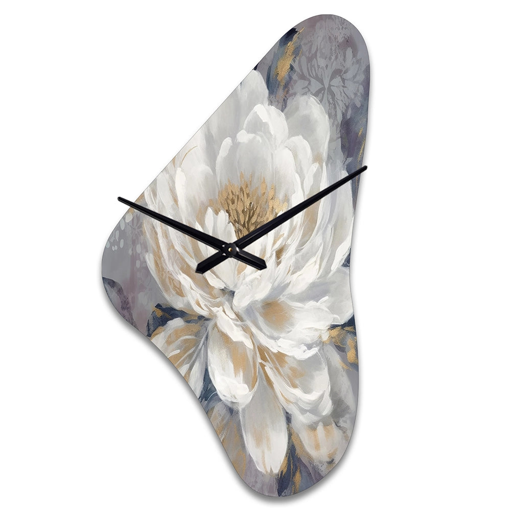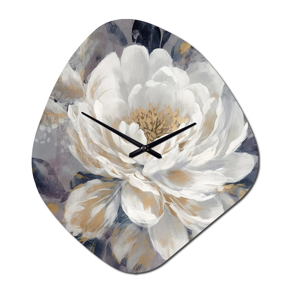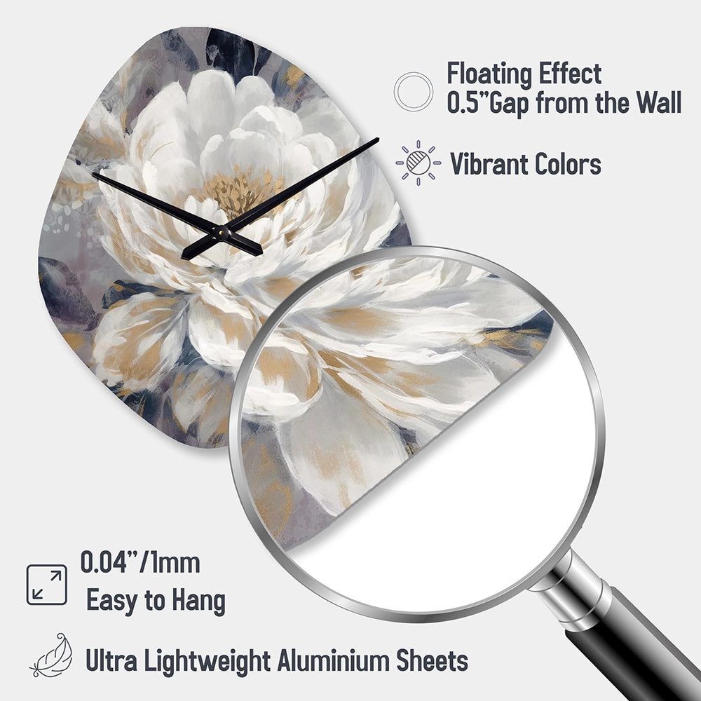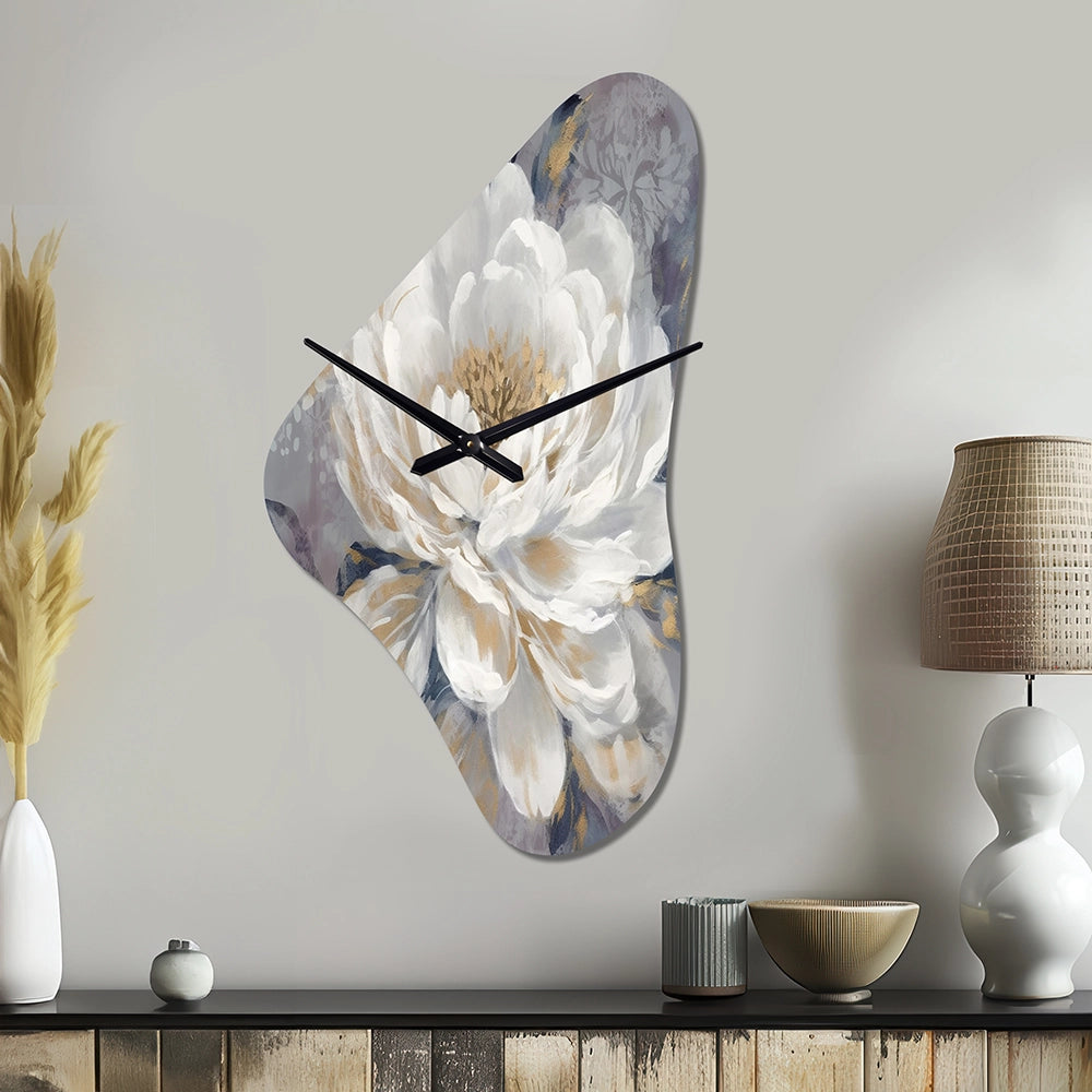 Emotions Of White Gold Peony Flower I - Asymmetric Metal Wall Clock